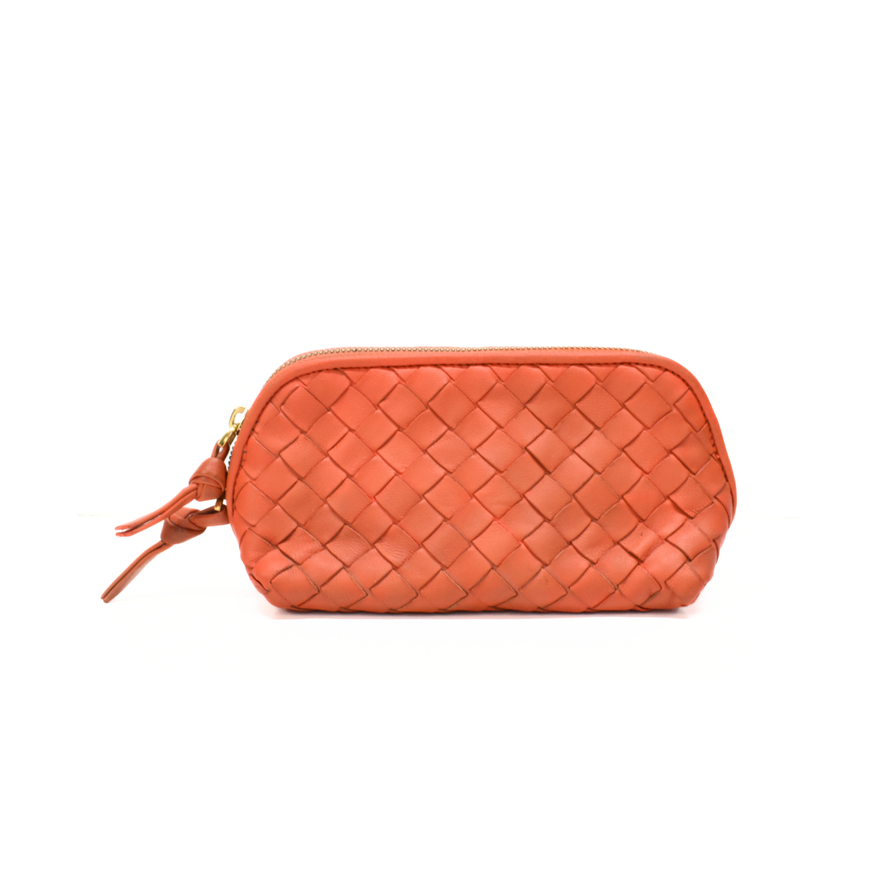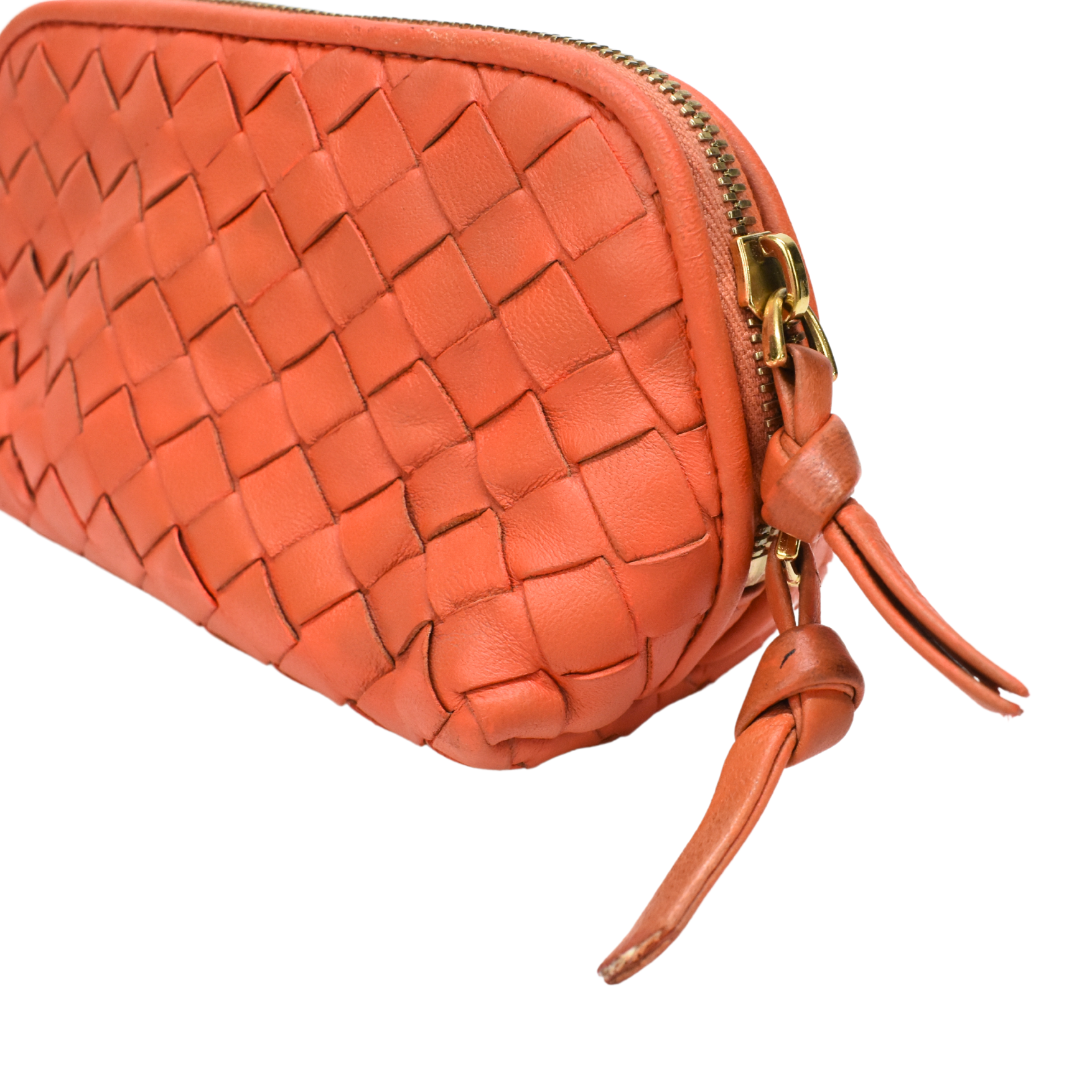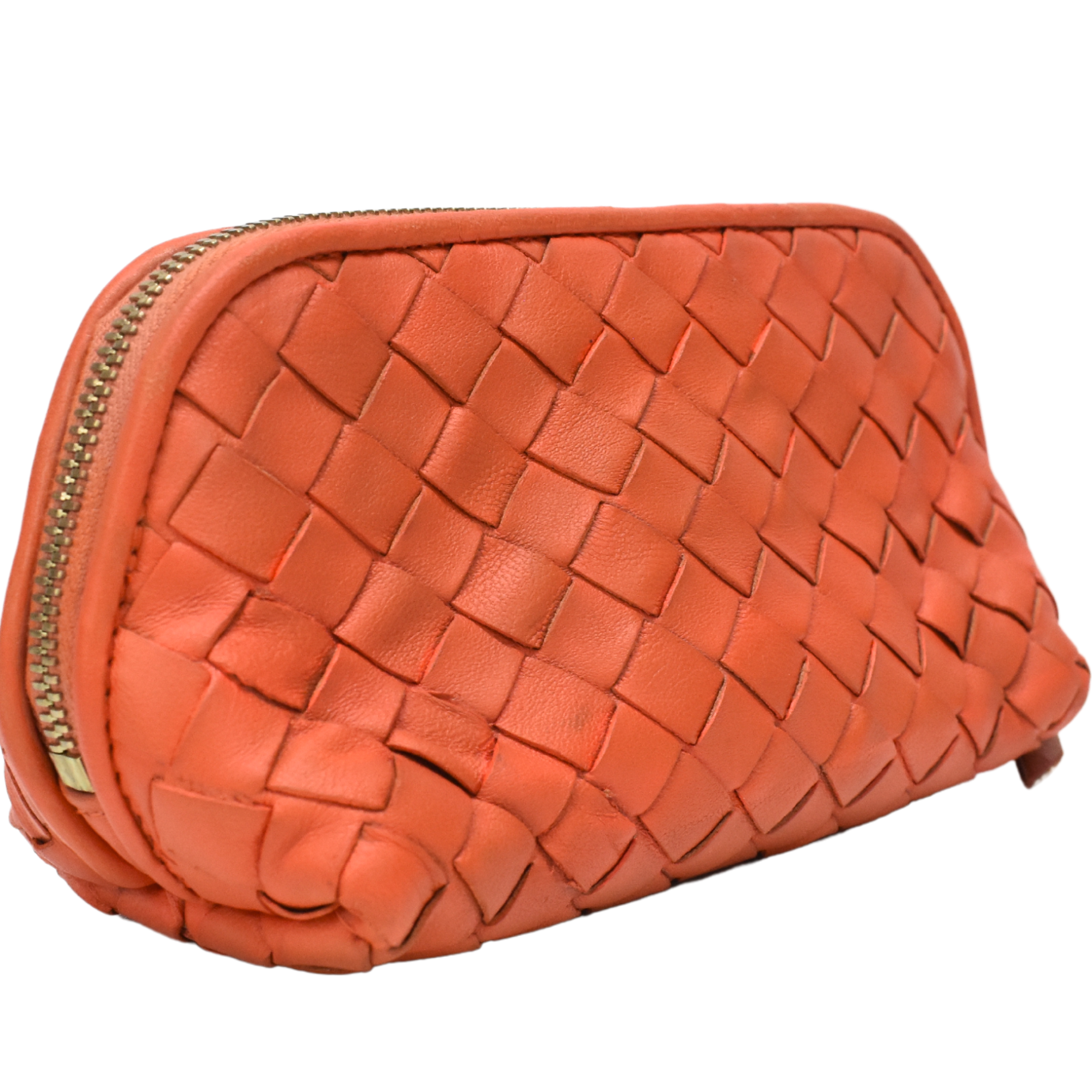 Bottega Veneta mini zip pouch in orange intrecciato woven leather with a large double zip opening in gold hardware with leather pull tabs.