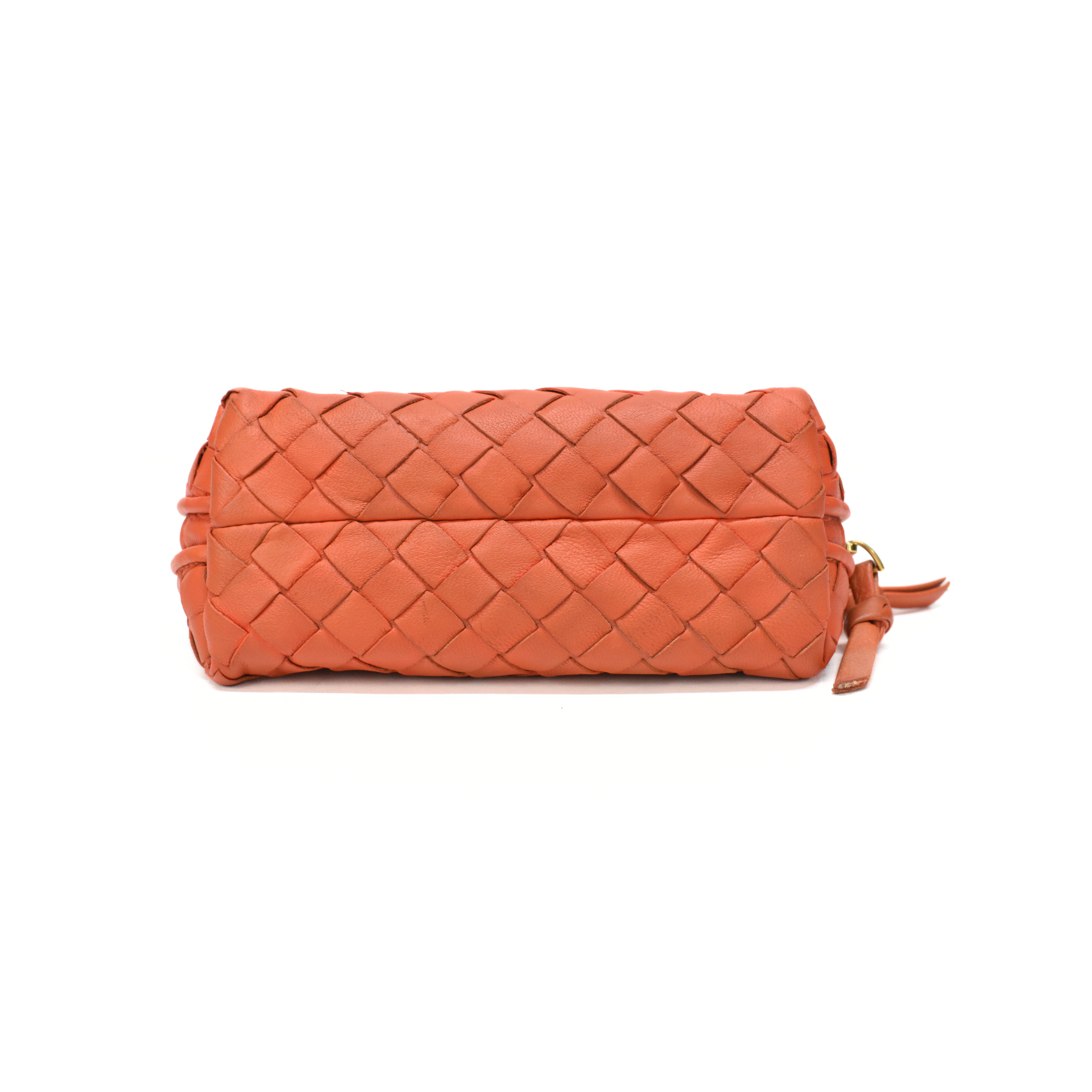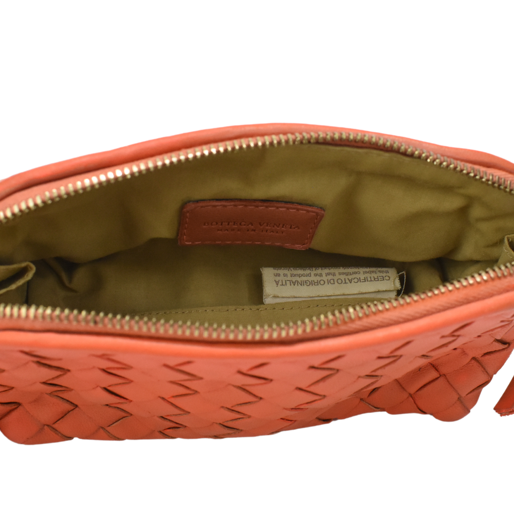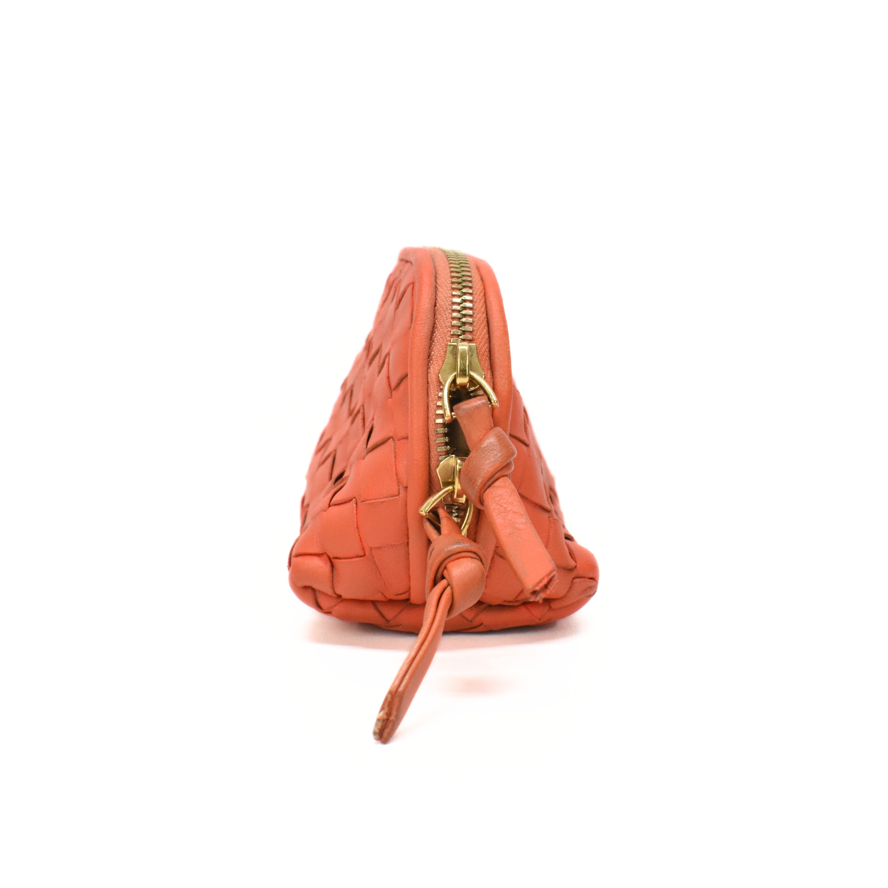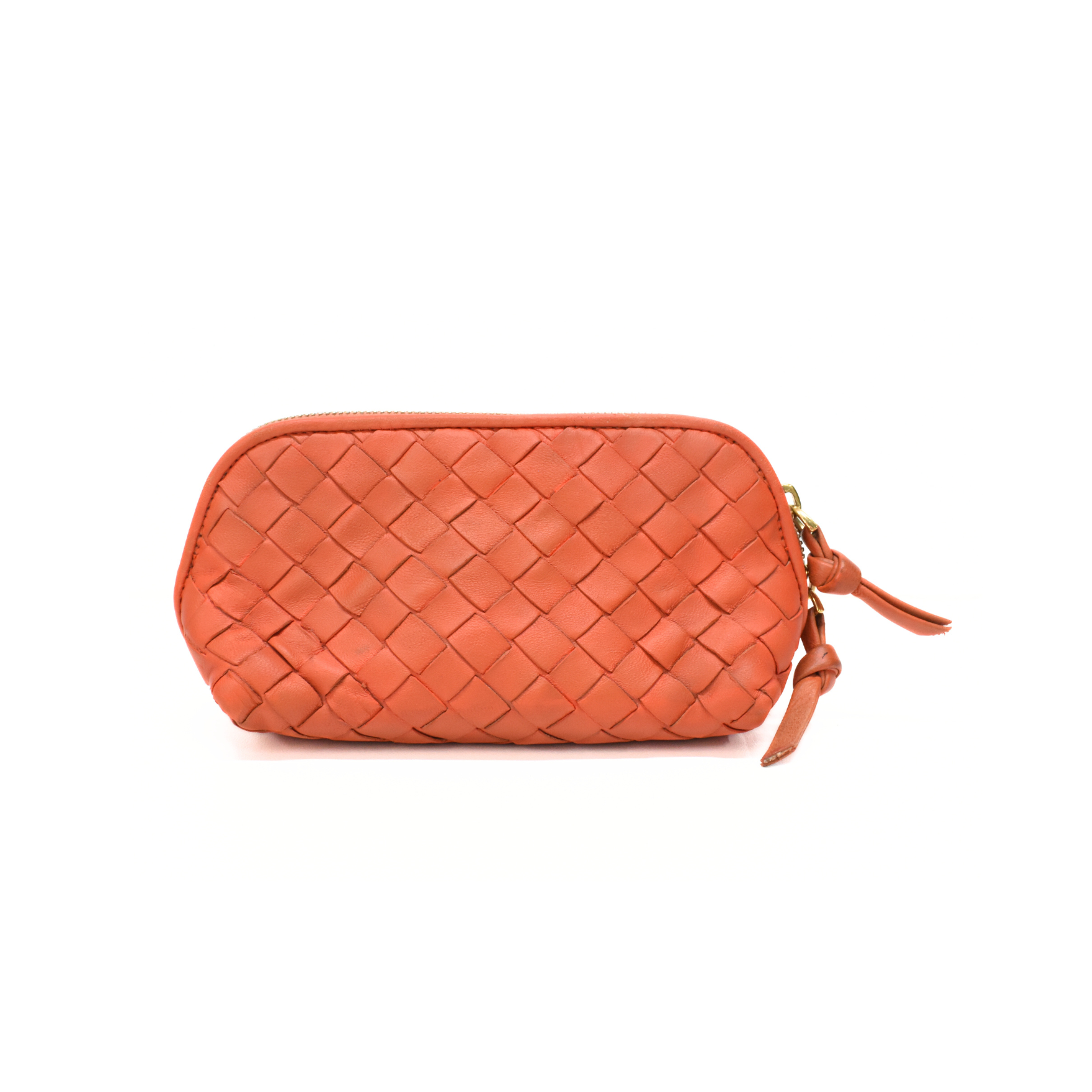 Bottega Veneta mini zip pouch in orange intrecciato woven leather with a large double zip opening in gold hardware with leather pull tabs.