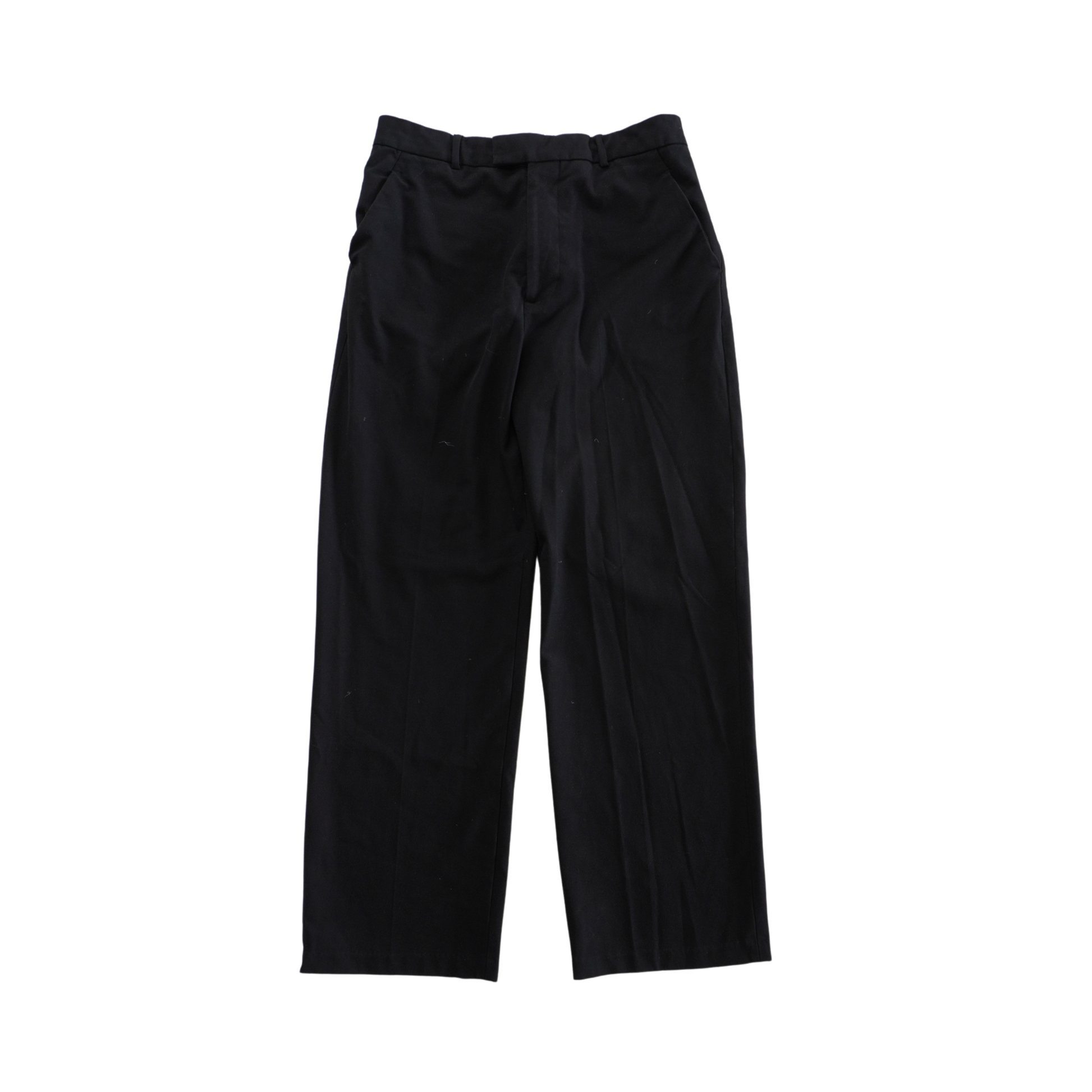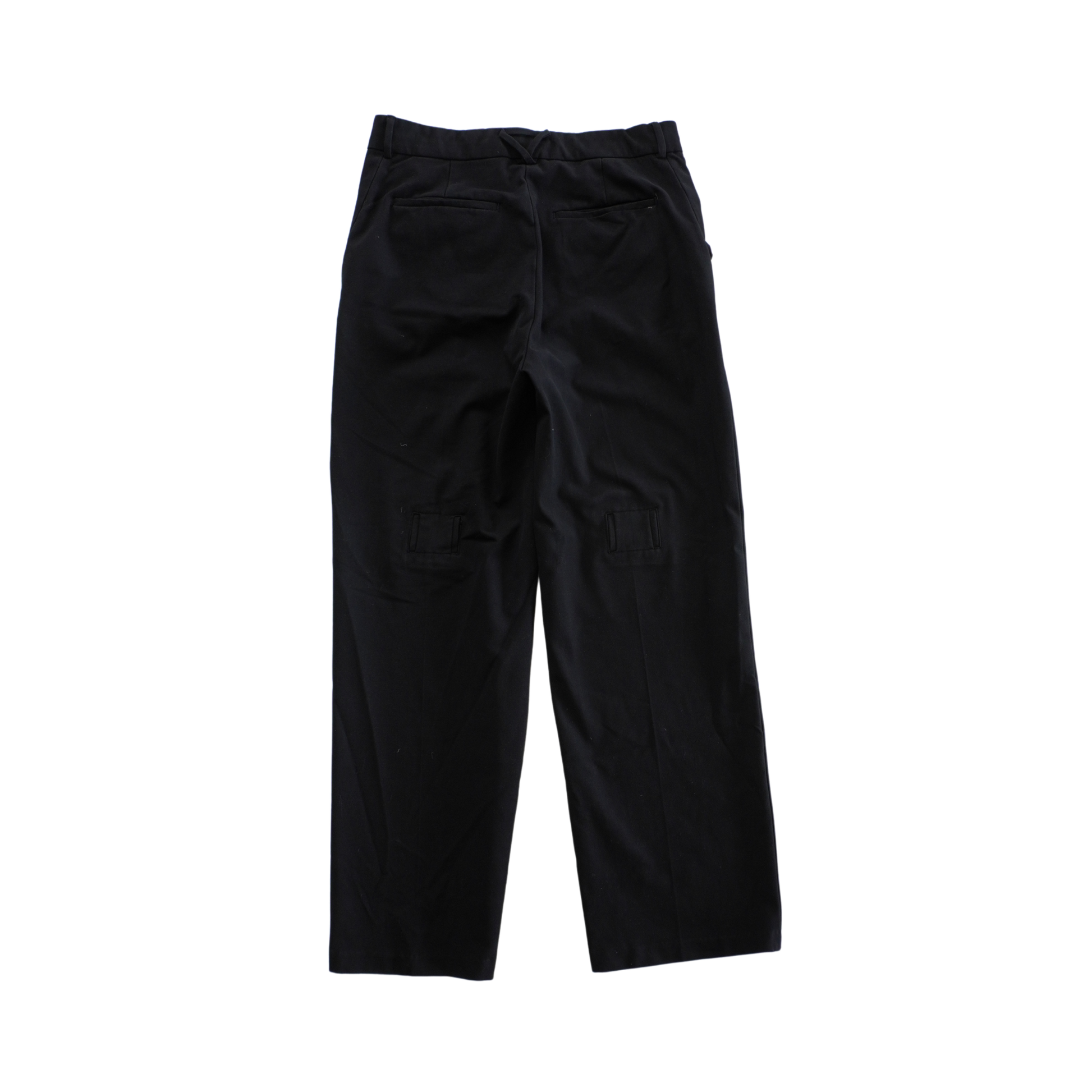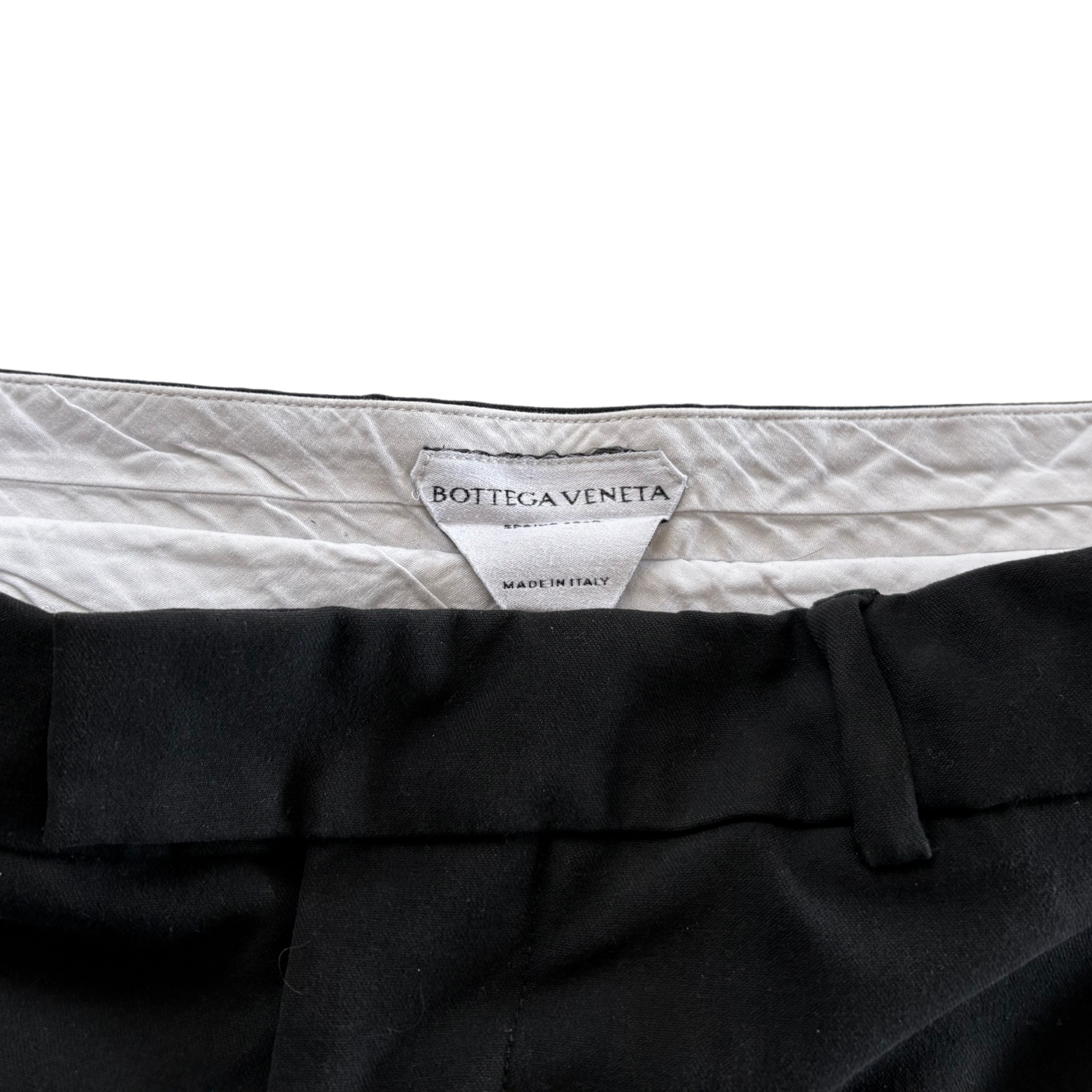 Bottega Veneta straight-leg trousers in black cotton with a hook-eye closure at the waist, patches on the back thighs, and a pleat down the legs.