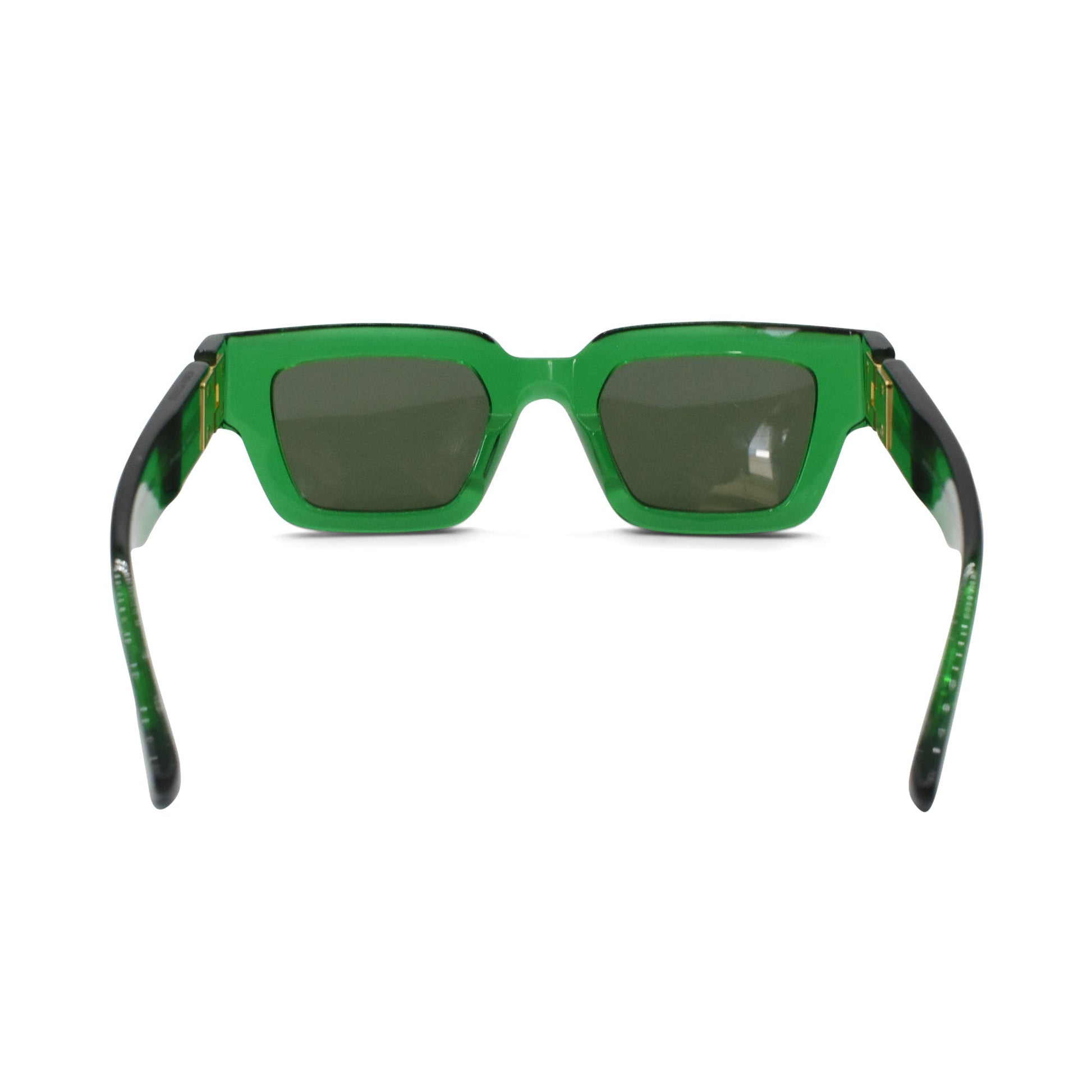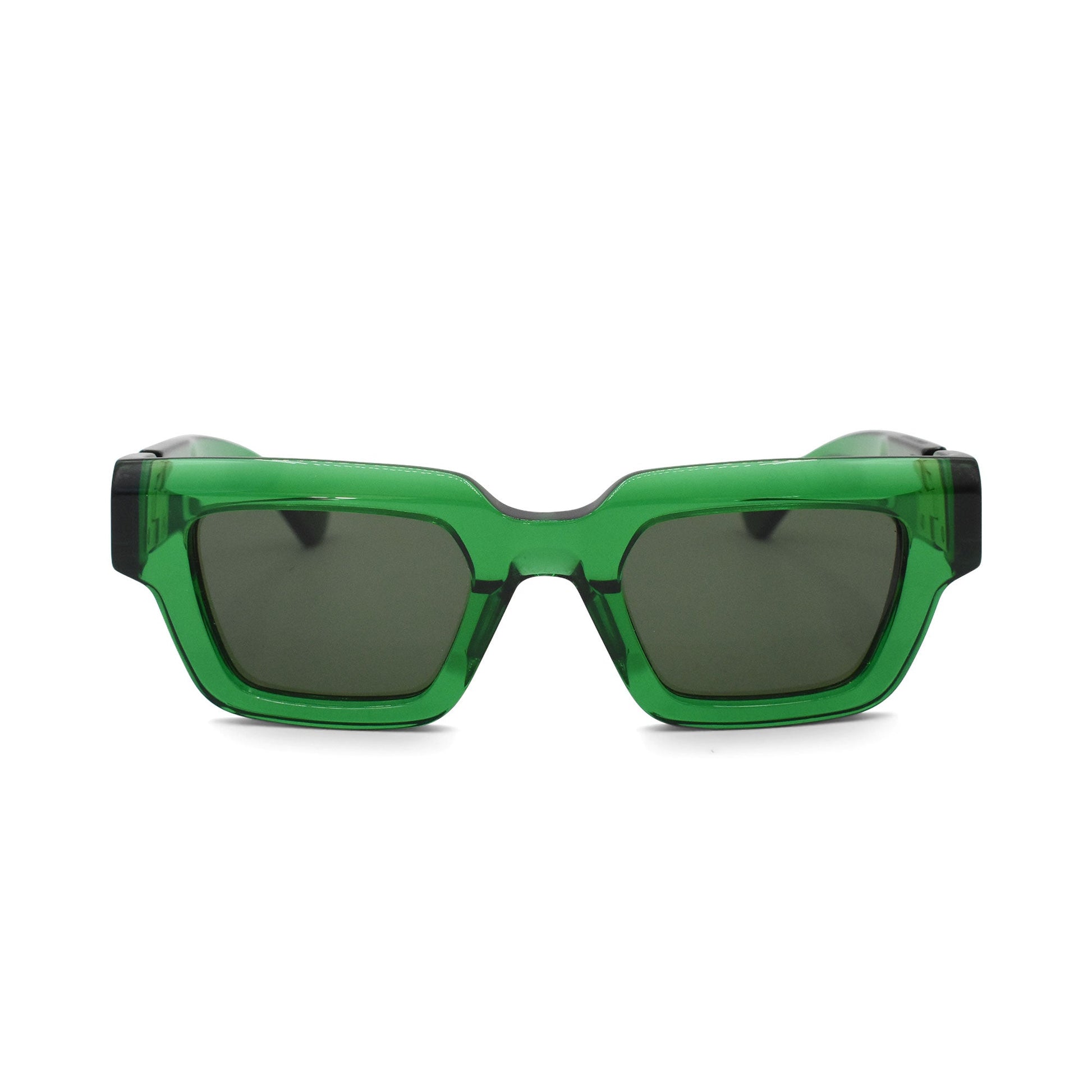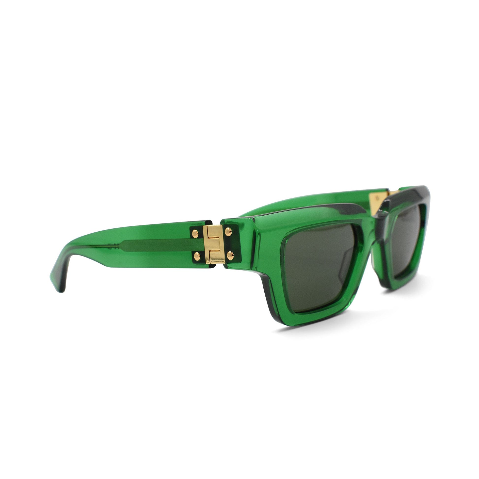 Bottega Veneta sunglasses in signature green acetate with a squared frame and gold metal hardware on the temples.