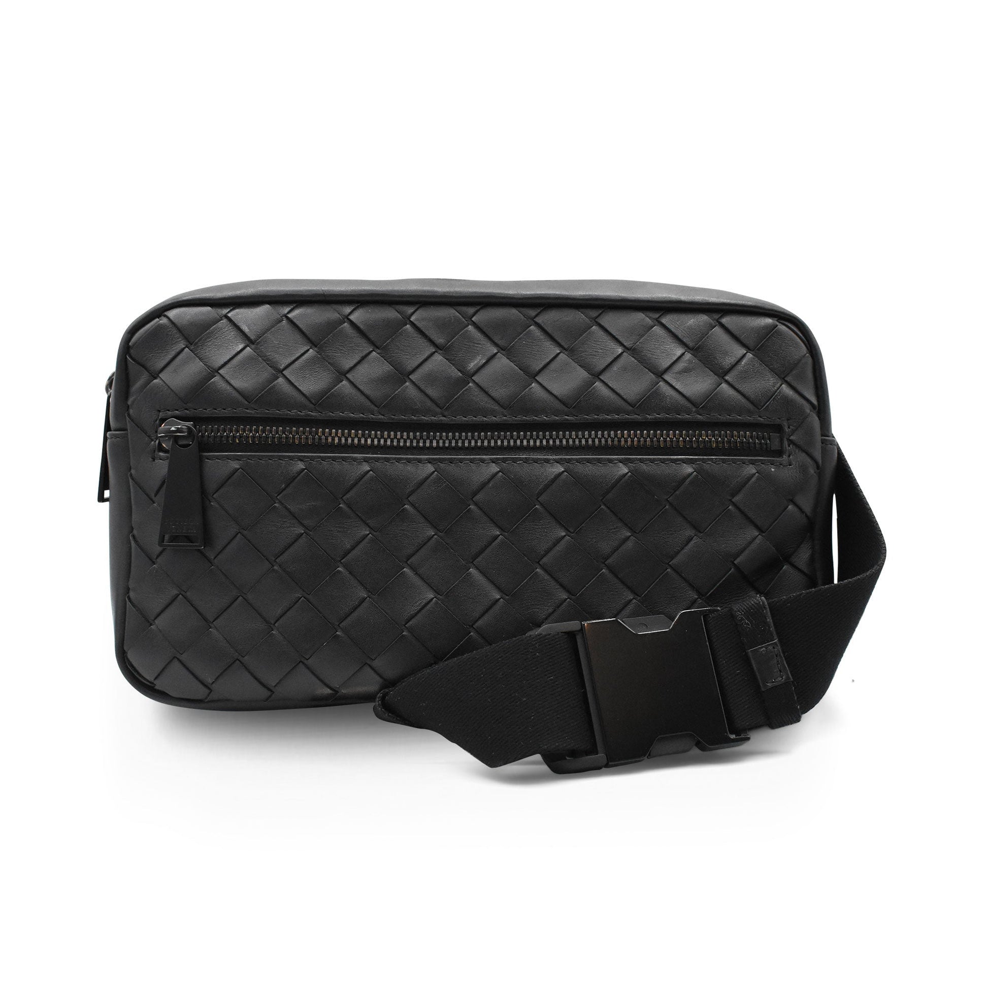 Bottega Veneta waist bag in black intrecciato leather with an adjustable waist strap and a black hardware buckle. Features a front zip pocket and top-zip closure. The interior is black canvas lined with a slip pocket.