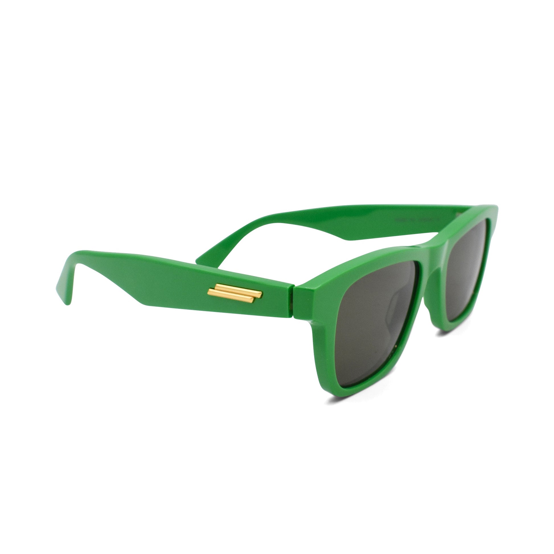 Bottega Veneta wayfarer sunglasses in bright green with gold hardware on the arms and black lenses.