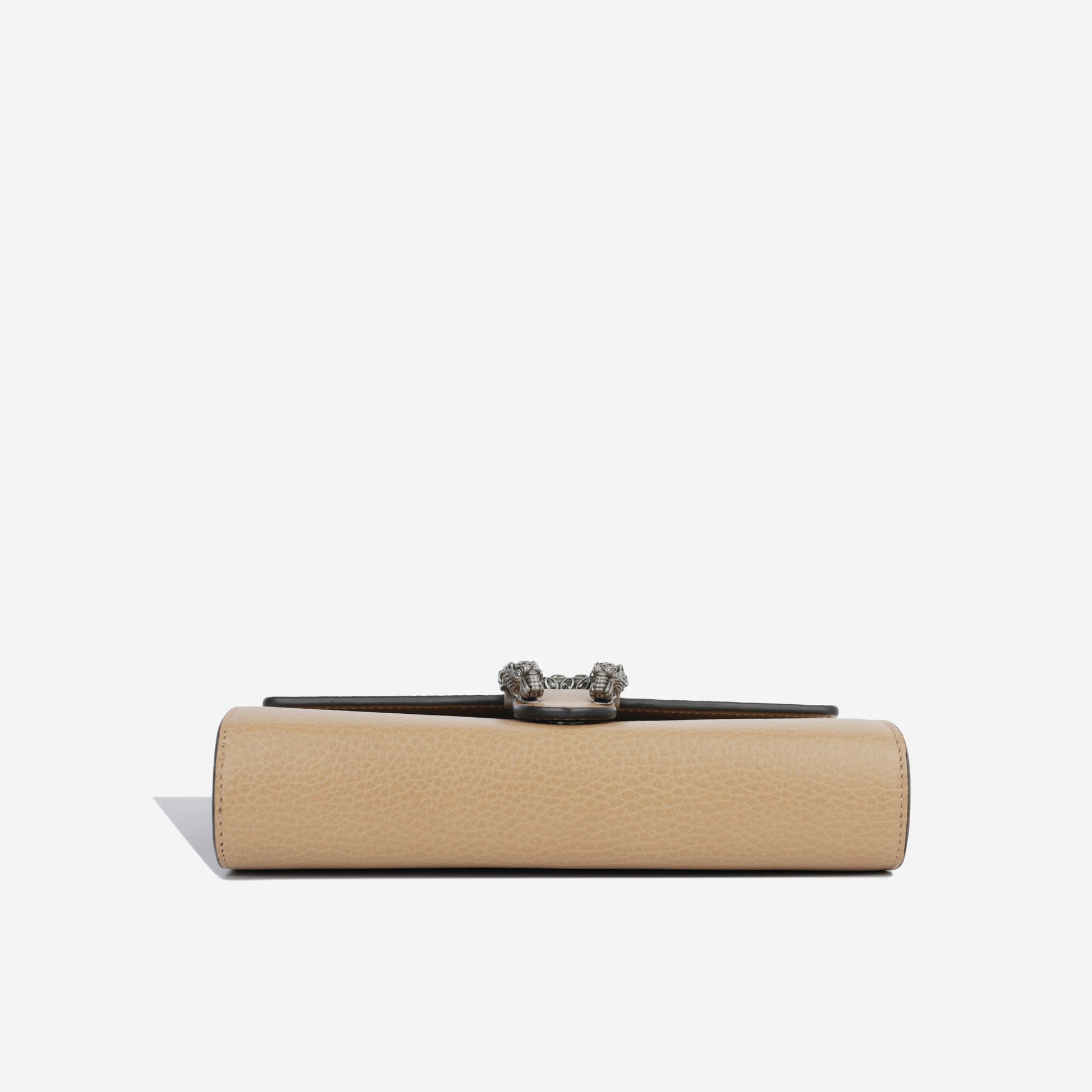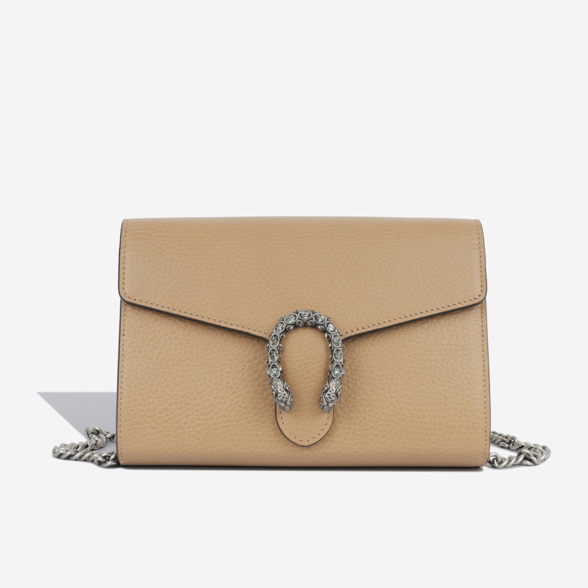 The very popular Gucci signature GG motif has been worked into the classic Dionysus Chain Wallet. Made in Italy, the Dionysus shoulder bag is suspended from a shoulder chain that can be worn multiple ways. The tiger head remains an eye catching feature on this defining silhouette. The Dionysus Chain Wallet is the perfect statement handbag to be added to any collection, and perfect classic piece for your next night out.