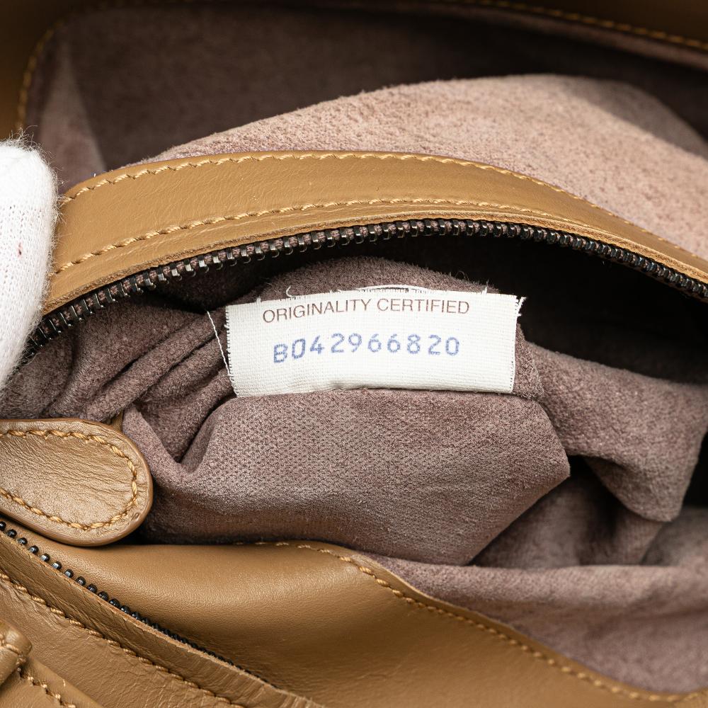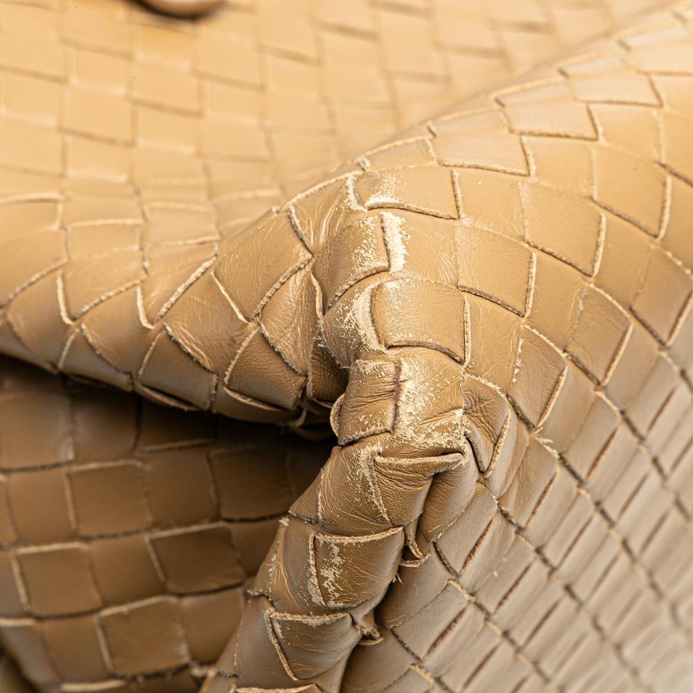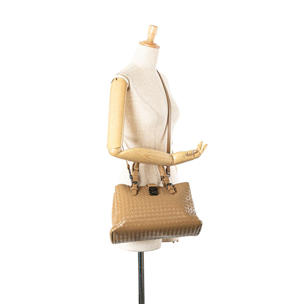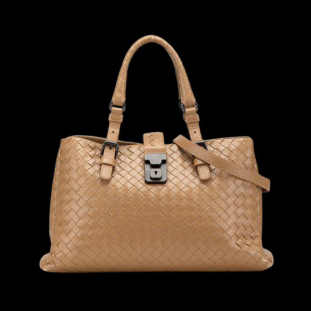 The Roma Intrecciato satchel features a woven leather body, rolled handles, a detachable flat leather strap, a top strap with a push lock and magnetic closure, interior compartments, and an interior zip pocket. It carries a B+ condition rating.Exterior Back Worn. Exterior Bottom Creased. Exterior Corners Worn. Exterior Front Creased. Exterior Handle Cracked, Creased. Exterior Handle stained with Transfer Of Color. Interior Pocket Worn. Interior Pocket stained with Other. Interior Lining Worn. Interior Lining stained with Pen Mark, Other. Practical Attachment Rusty/Tarnished, Scratched. Exterior Side stained with Other. Zipper Scratched. Dimensions:Length 32cmWidth 15cmHeight 18cmHand Drop 13cmShoulder Drop 55cmOriginal Accessories: Shoulder StrapSerial Number: B042966820Color: Brown x Light BrownMaterial: Leather x Nappa Leather
