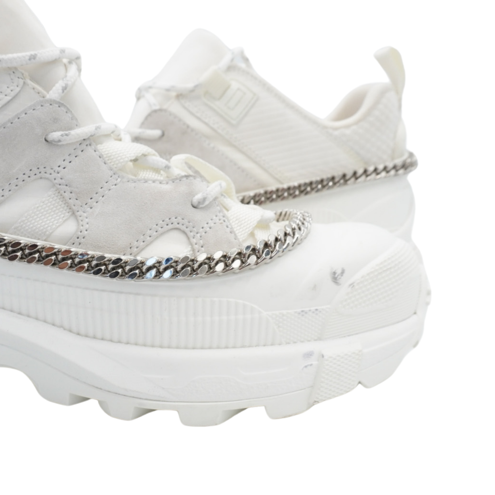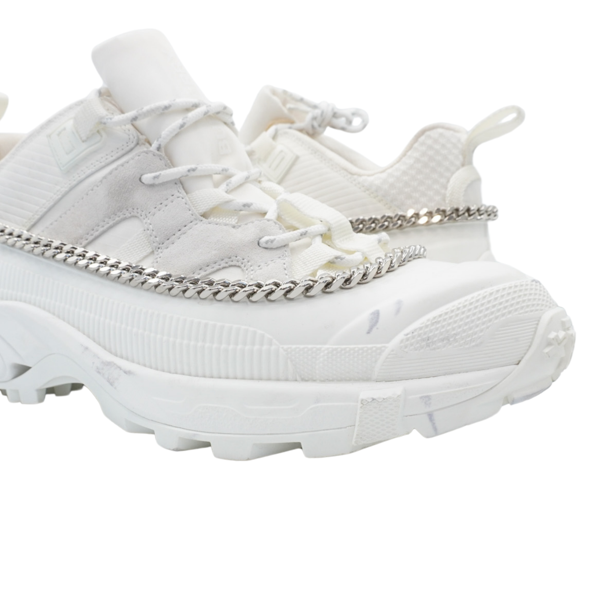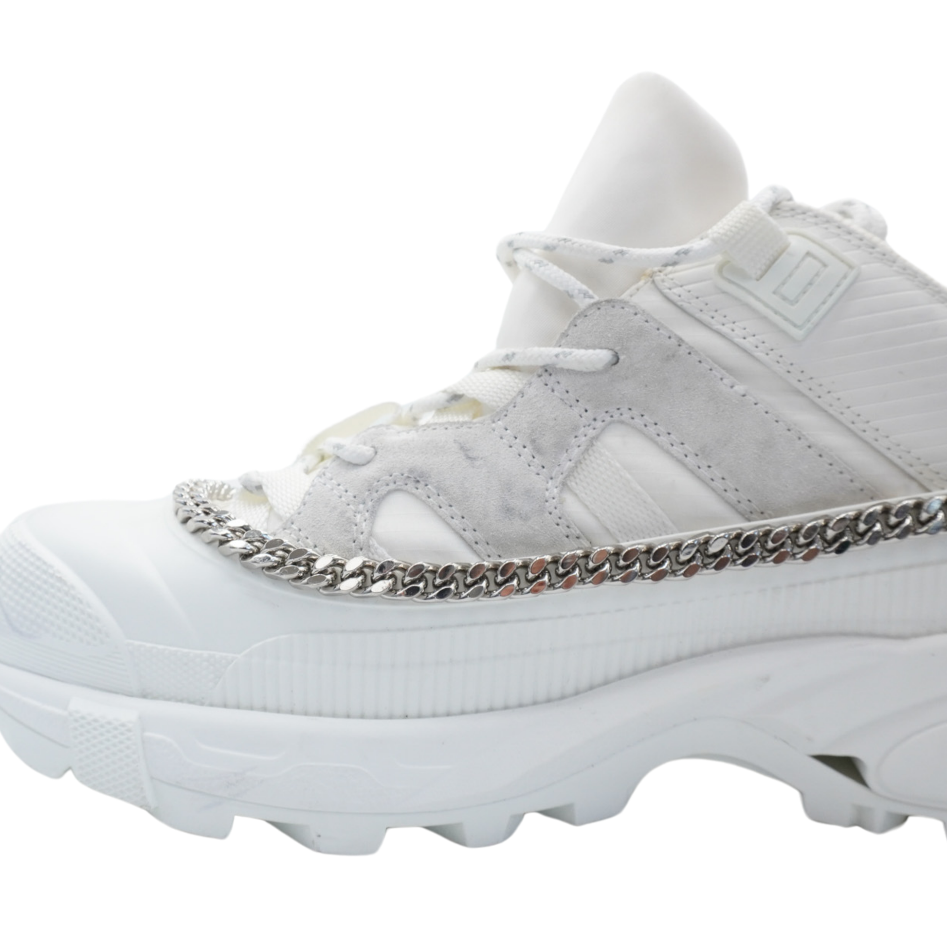 Burberry 'Arthur Chain' low-top sneakers in white rubber with grey suede trim, a chunky rubber sole, and a silver chain link trim detail.