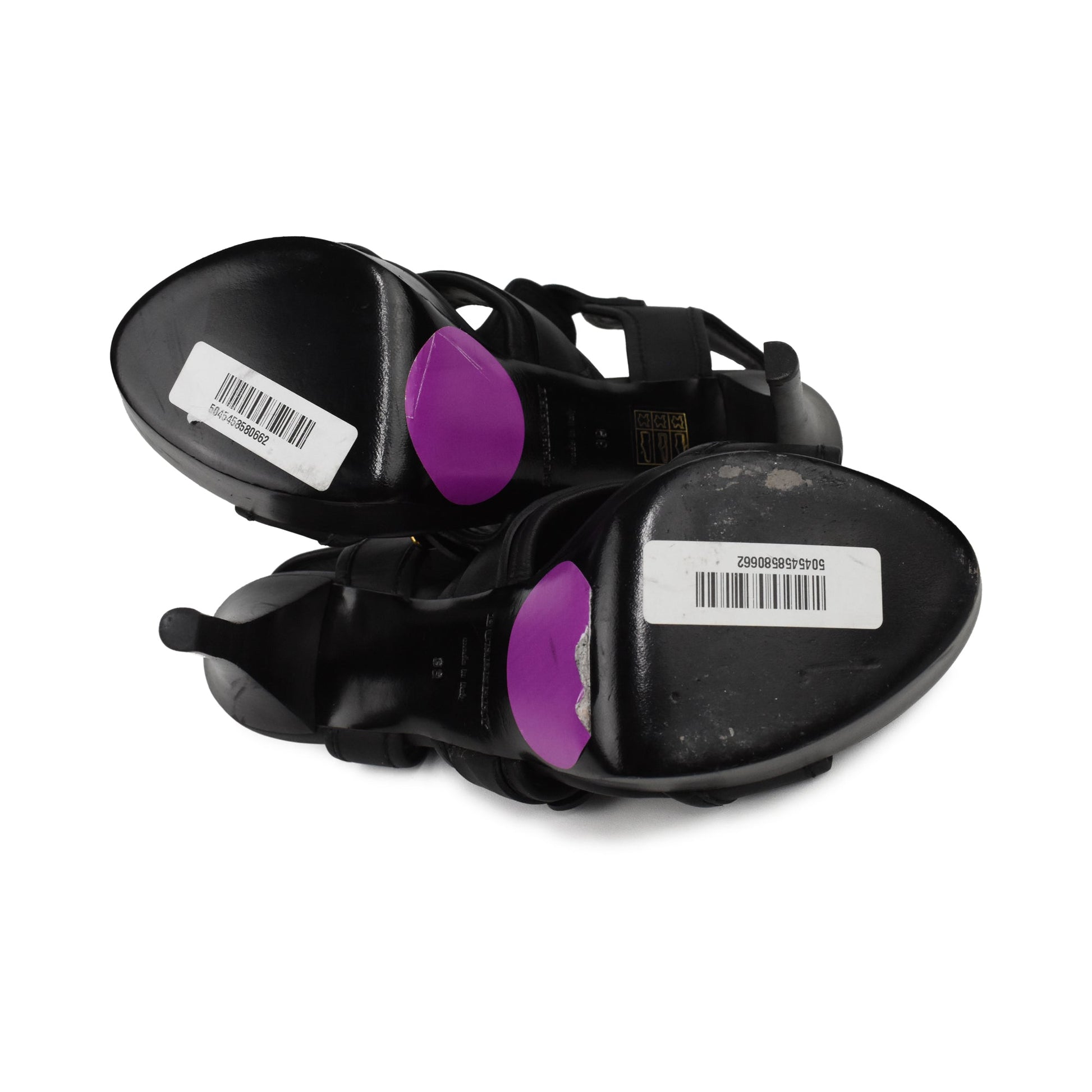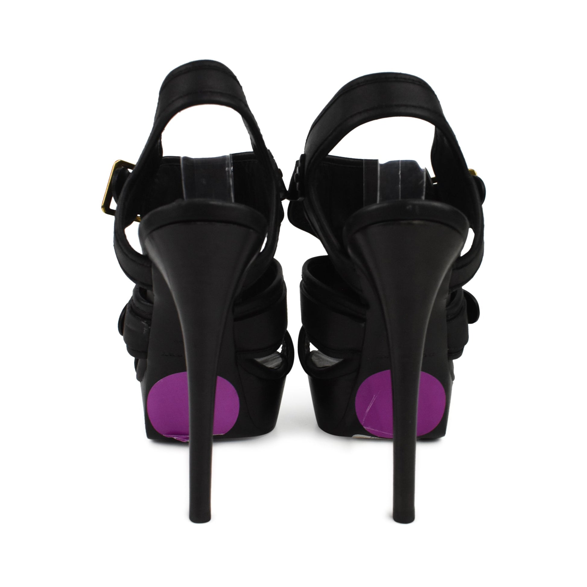 Burberry platform heeled sandals in black leather with straps and gold buckle hardware. Features a platform and stiletto heel.