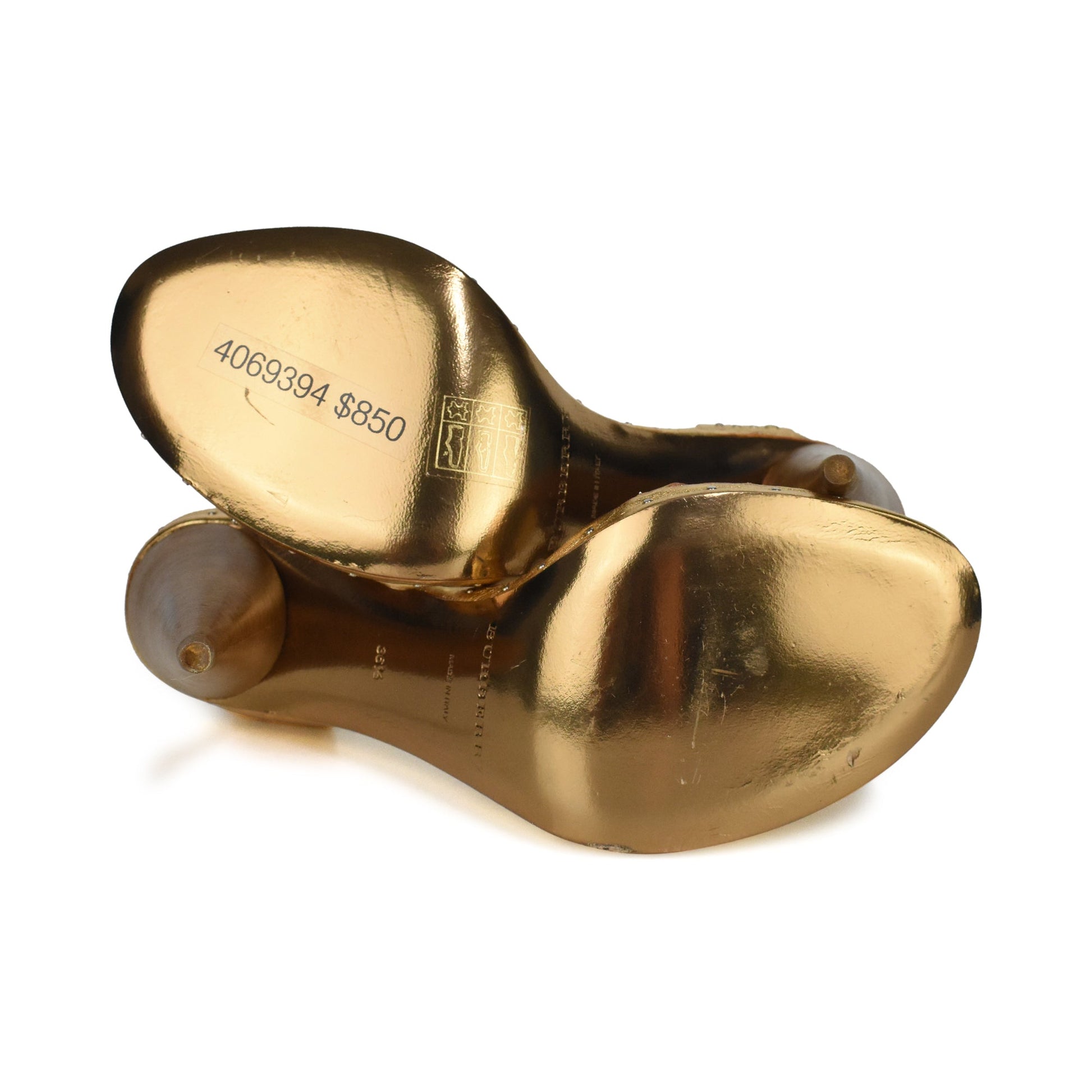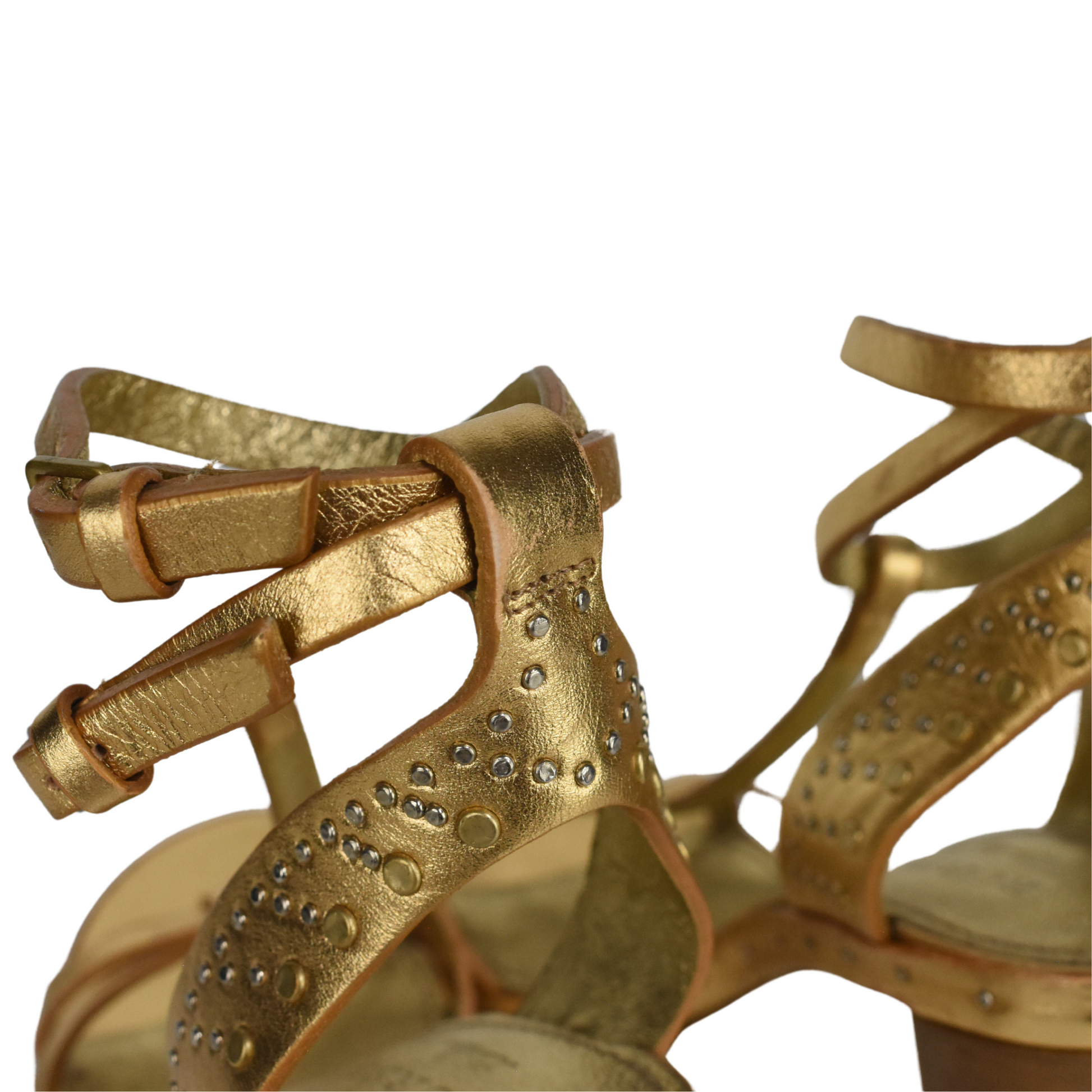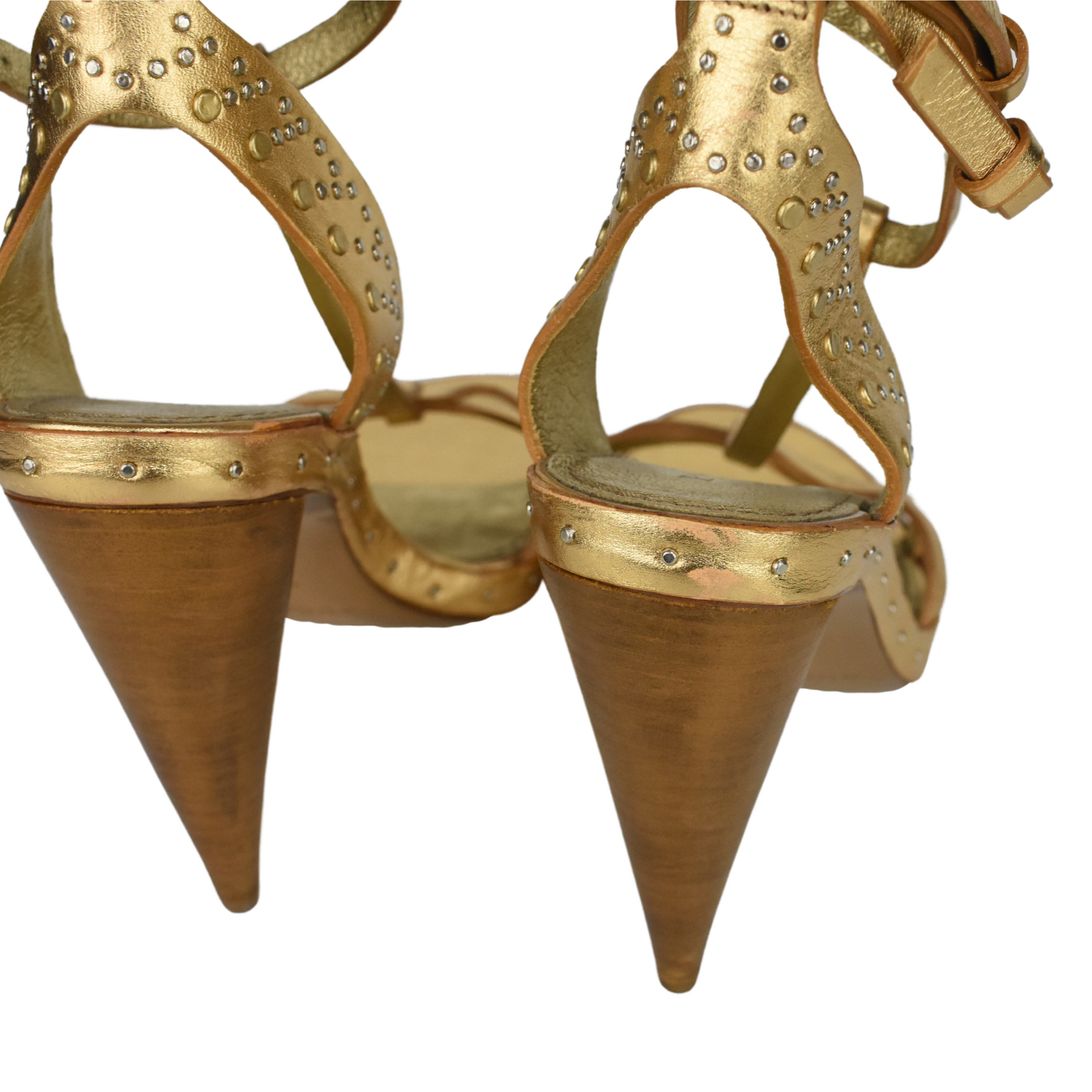 Burberry 'Hans' runway sandals in metallic gold leather with a T-strap design, small silver and gold flat studs, and a metallic wooden cone heel.