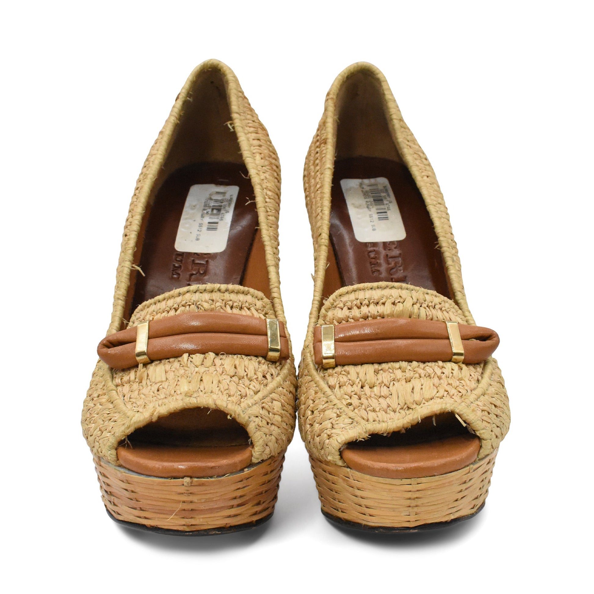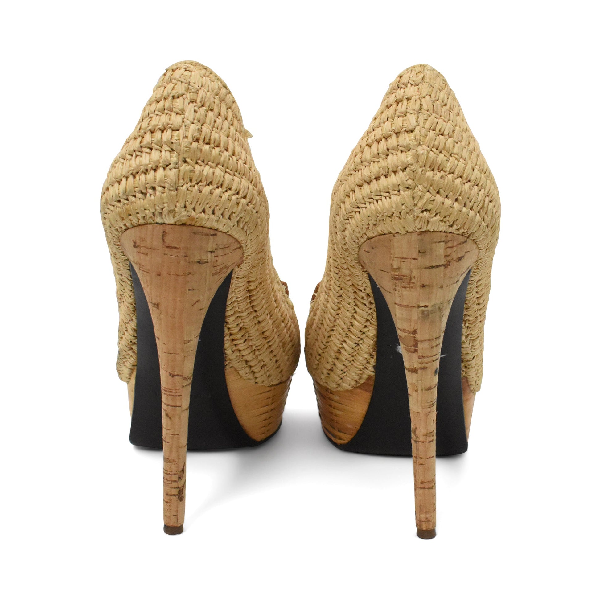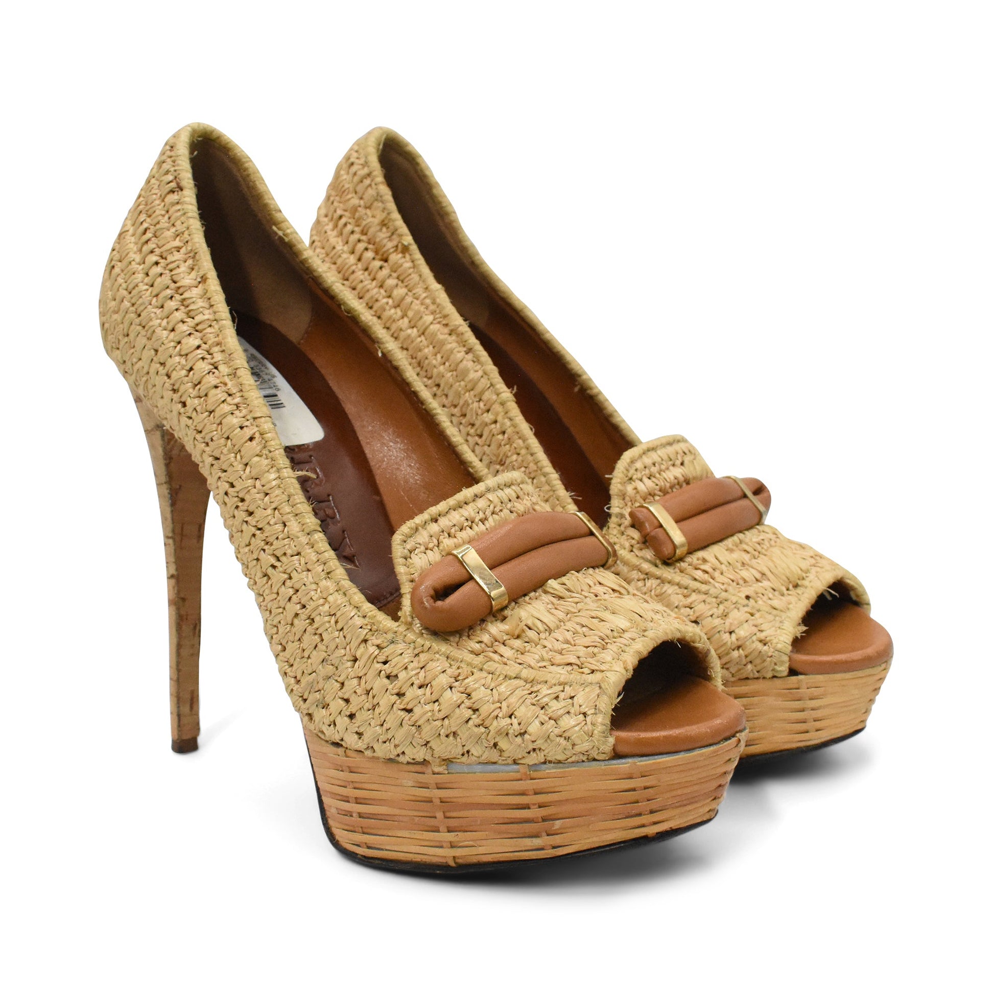 Burberry platform pumps in tan woven raffia with brown leather trim, a cork stiletto heel, and a peep-toe.