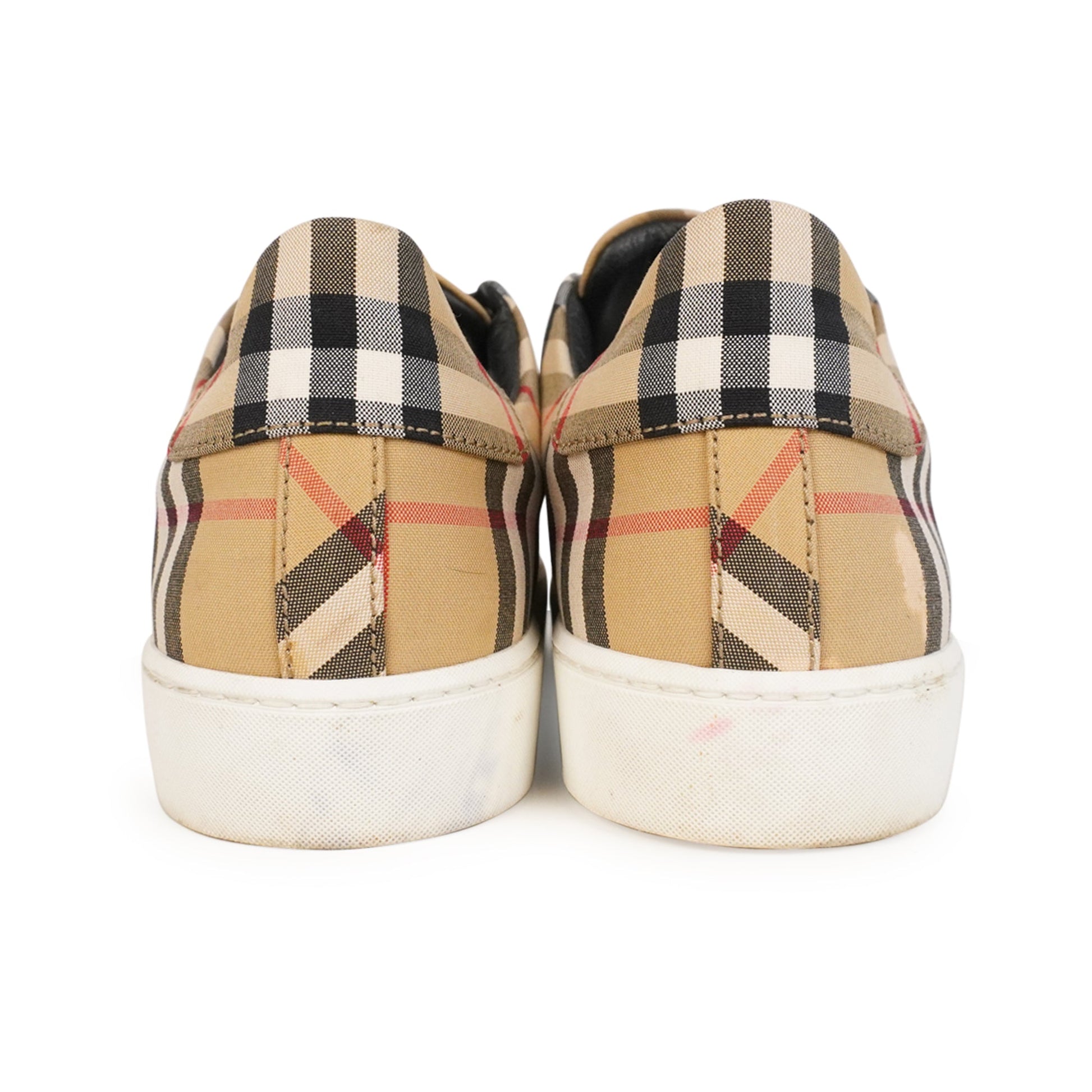 Burberry low-top sneakers in beige novacheck canvas with white rubber soles. Features black flat laces and black leather lining.