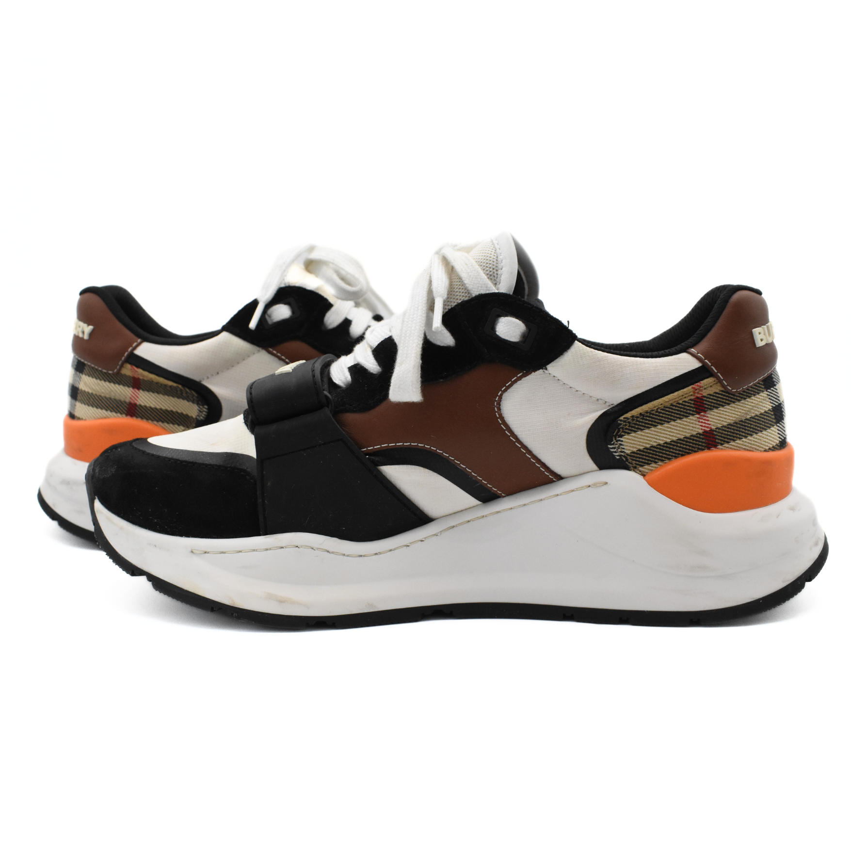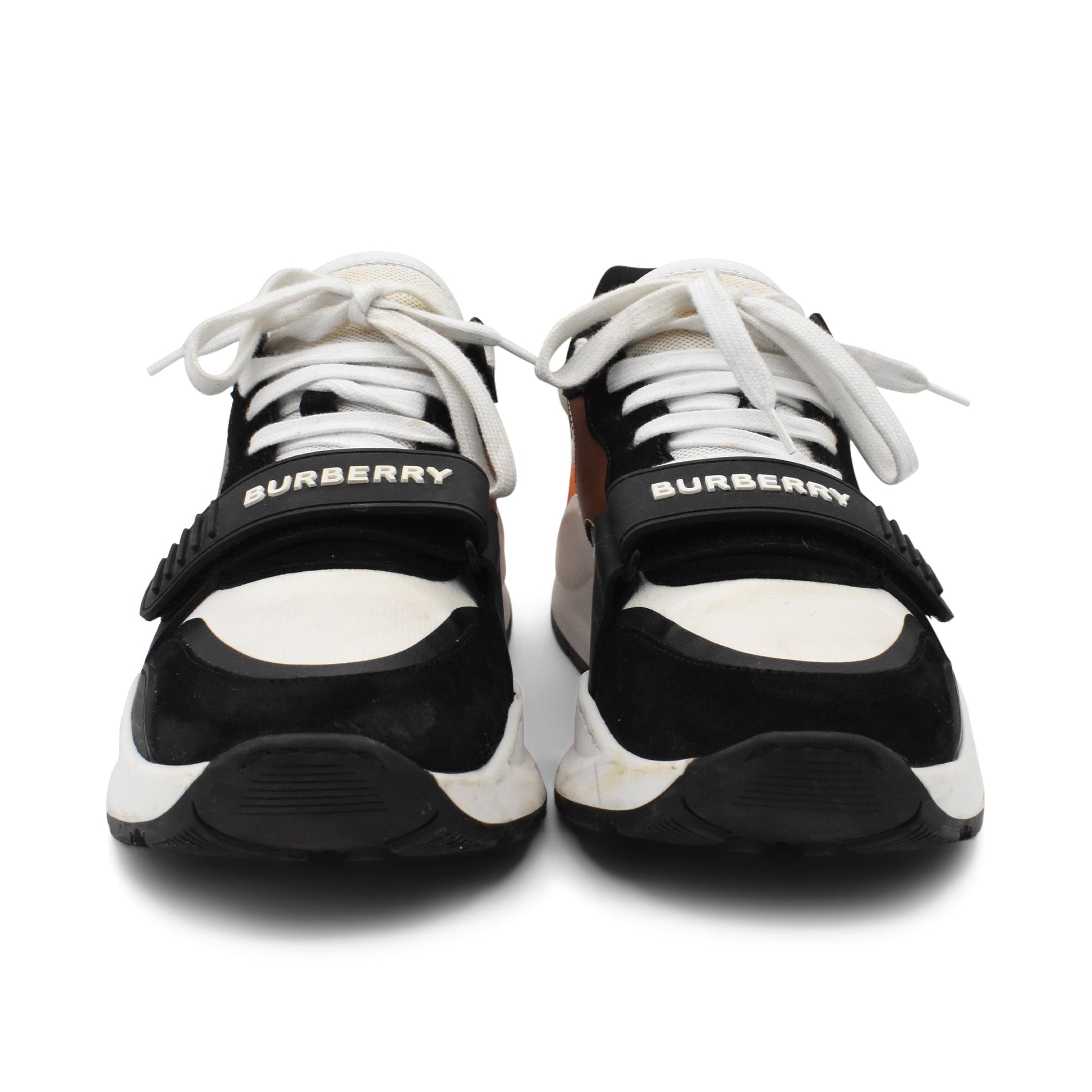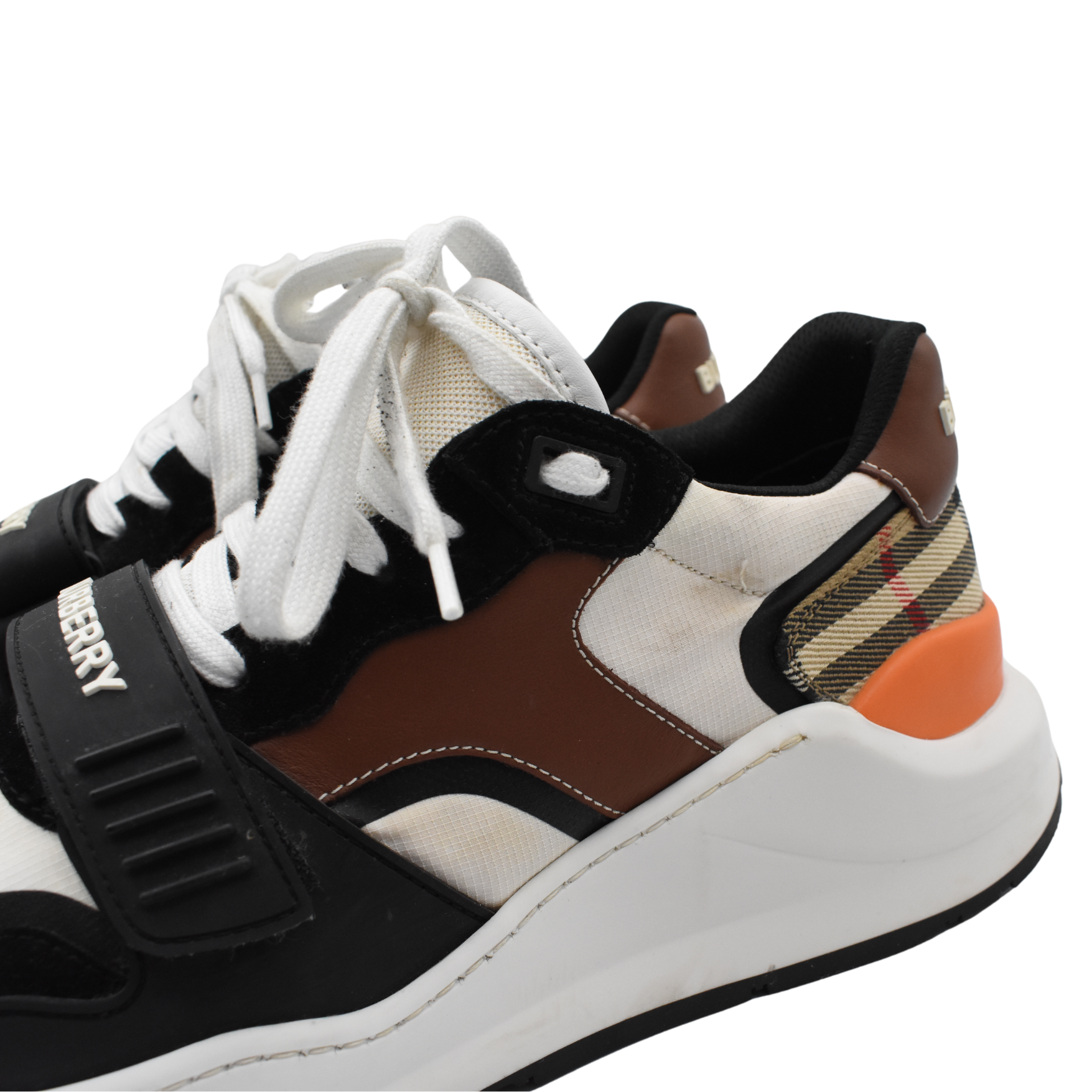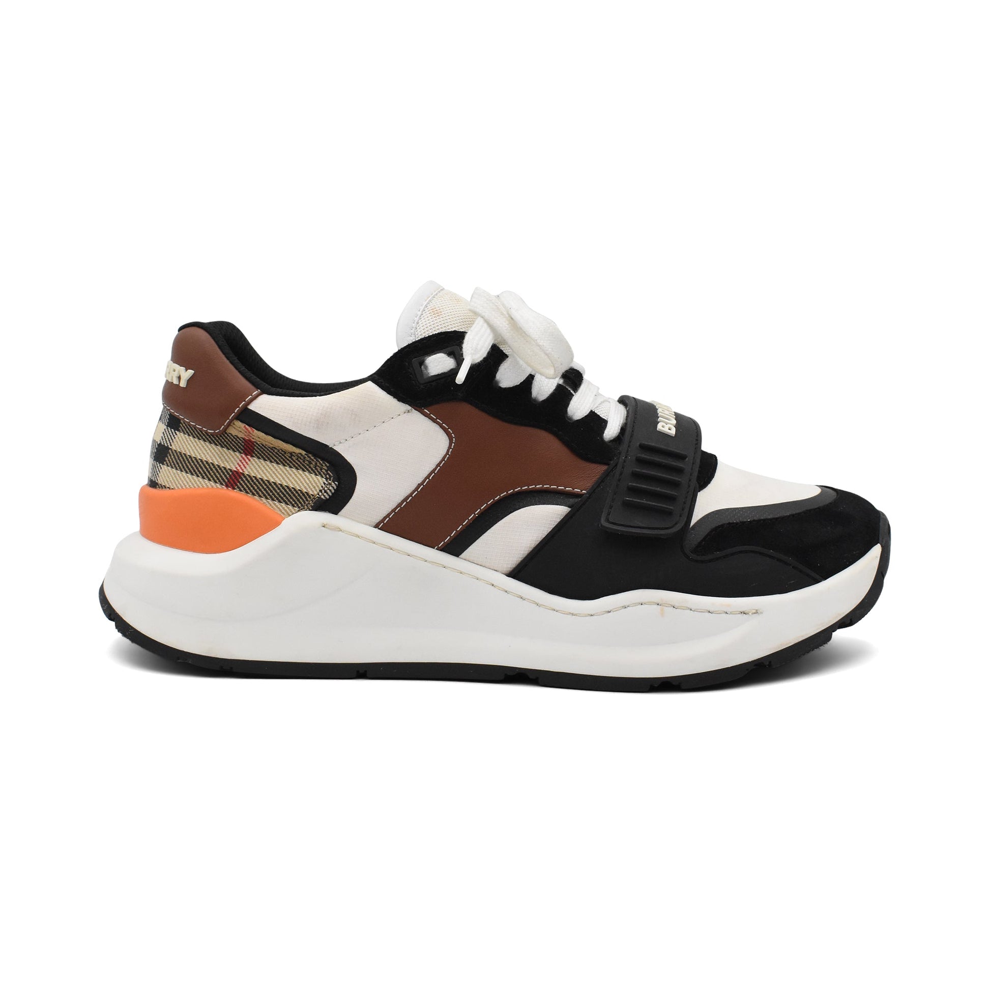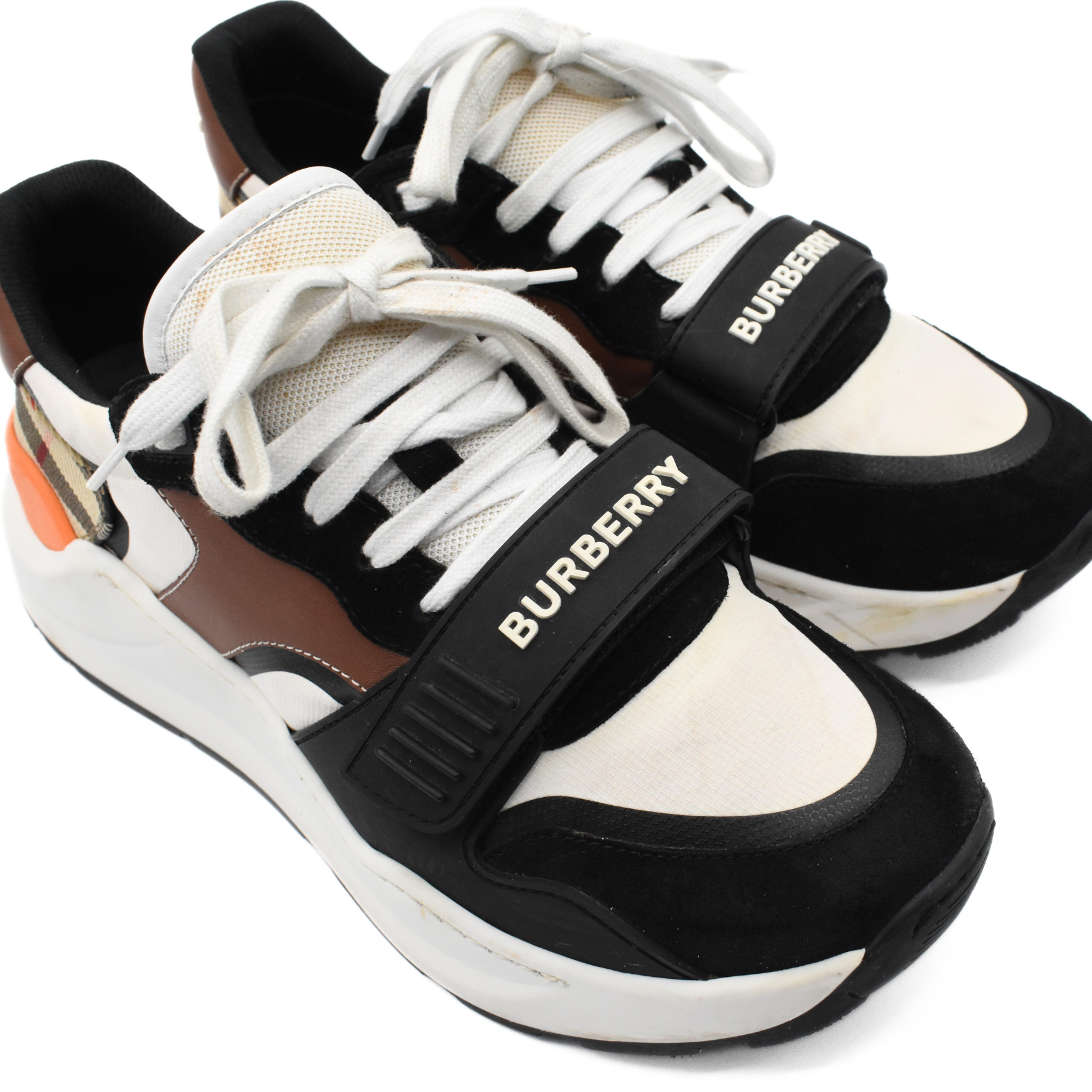 Burberry 'Regis' sneakers in black suede and rubber with white mesh, brown leather, orange rubber, and beige novacheck canvas panelling. The shoes have a chunky rubber sole, white laces, and a velcro toe strap with a logo graphic across.