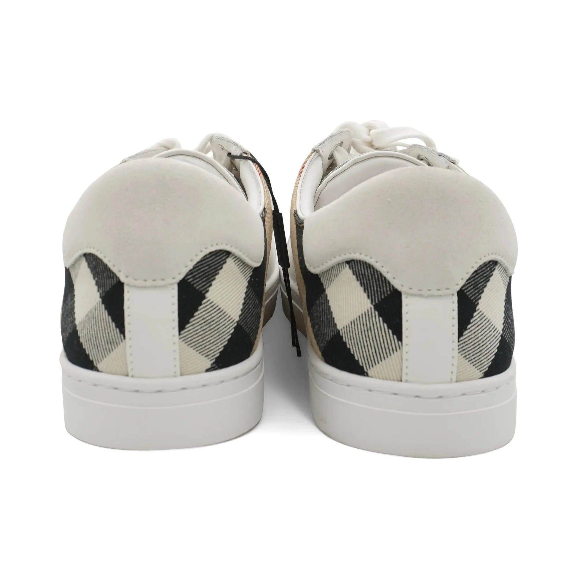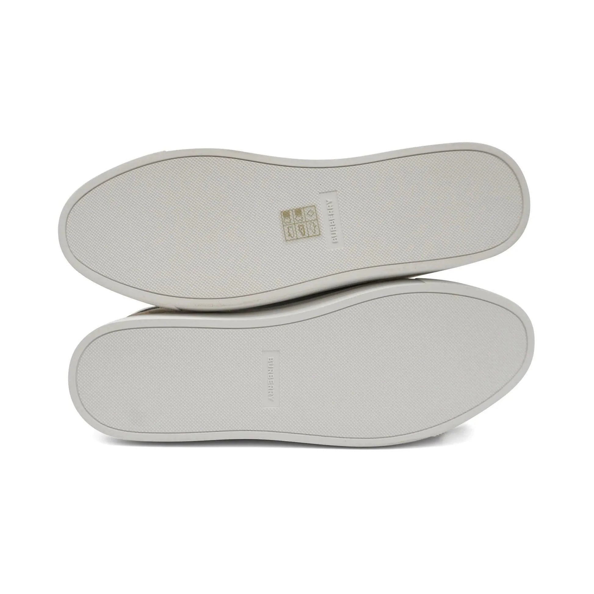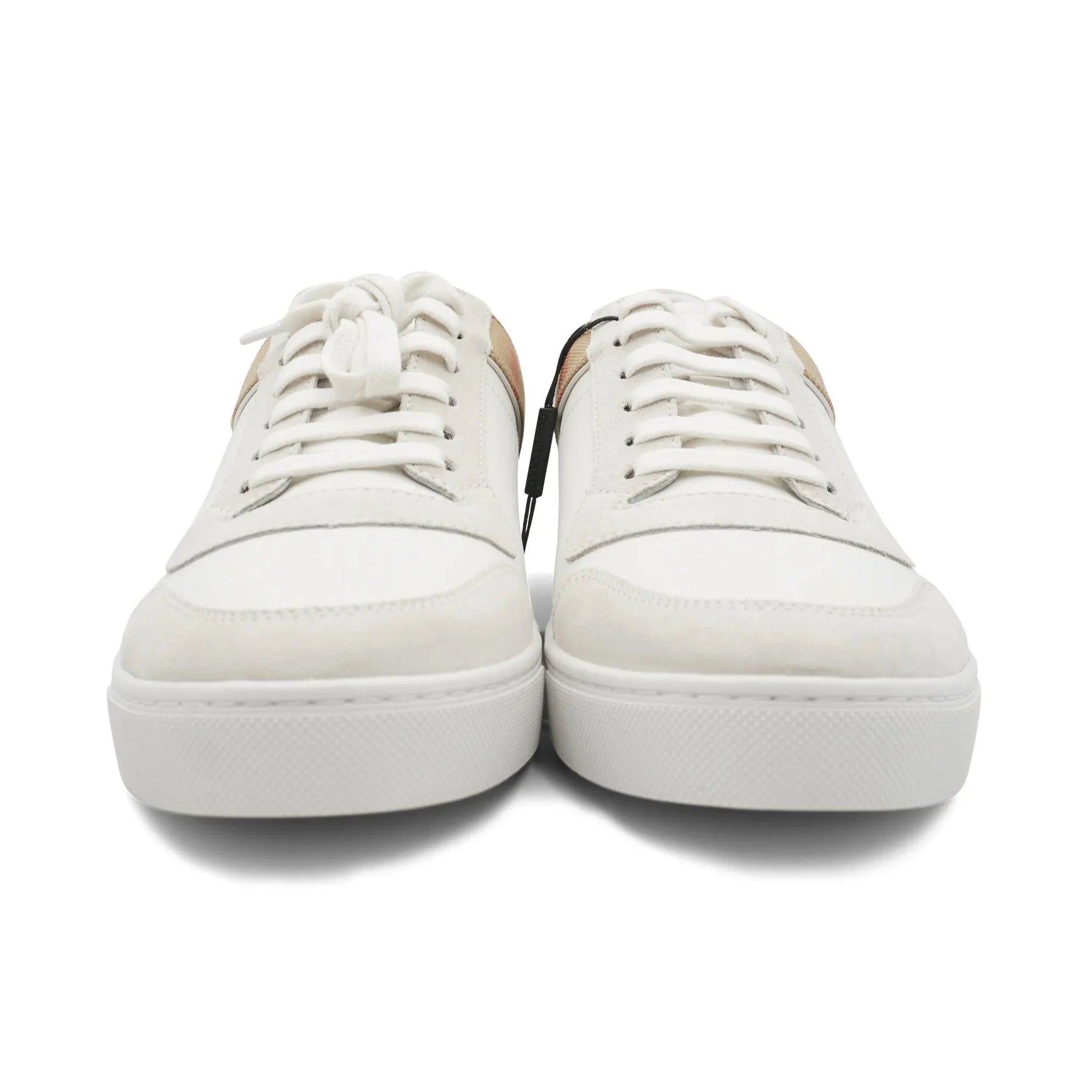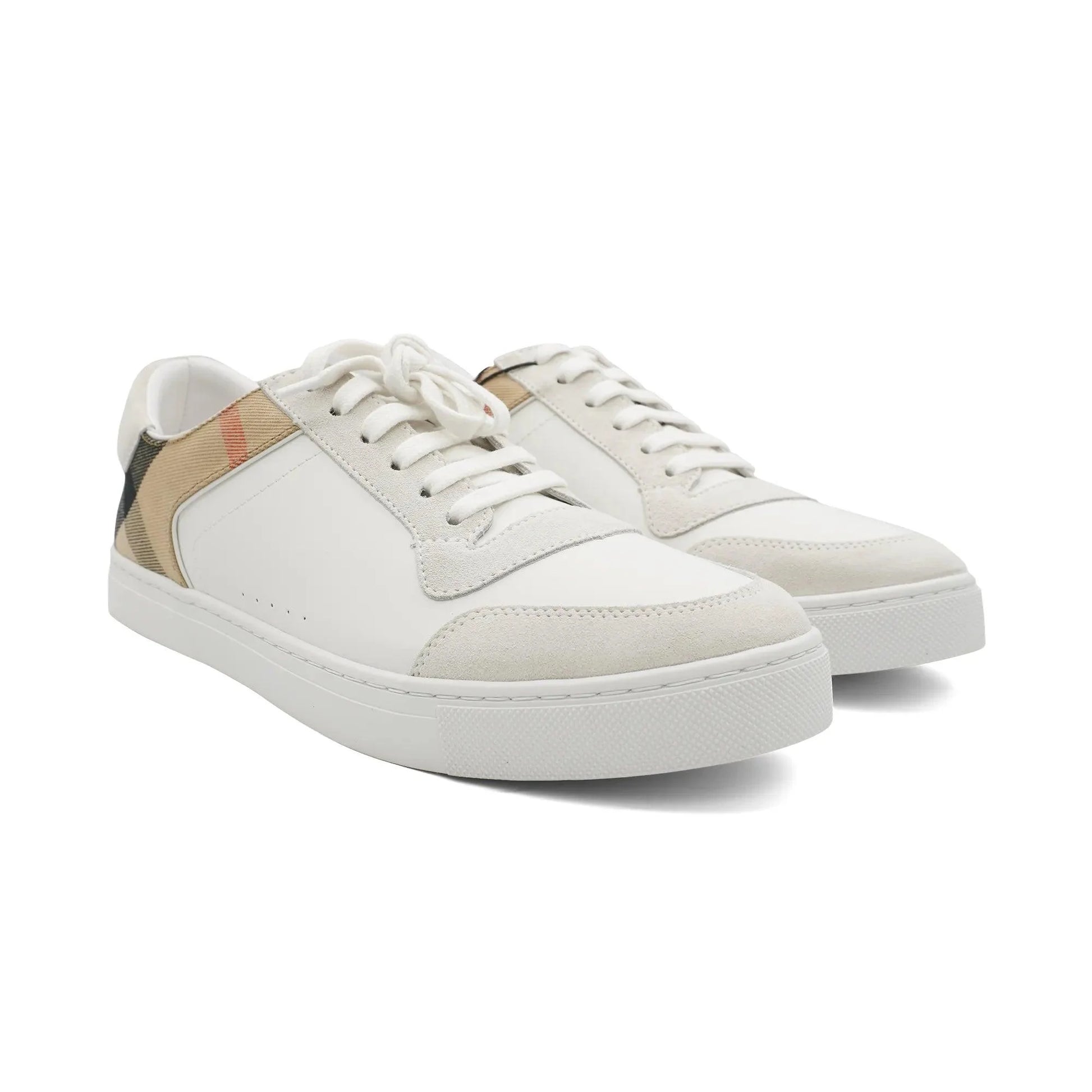 Burberry low-top sneakers in white leather with light grey suede detailing and brown novacheck canvas panel.
