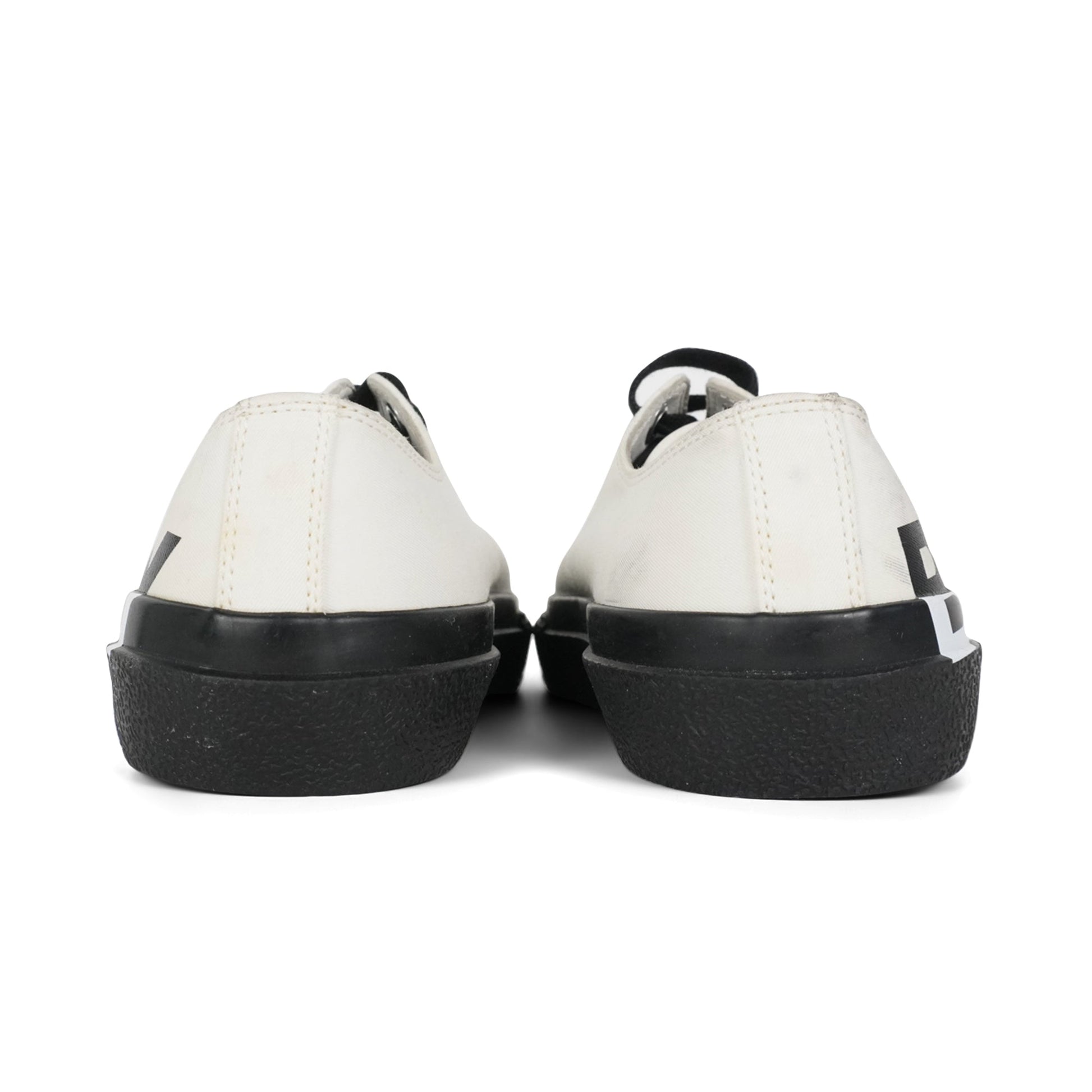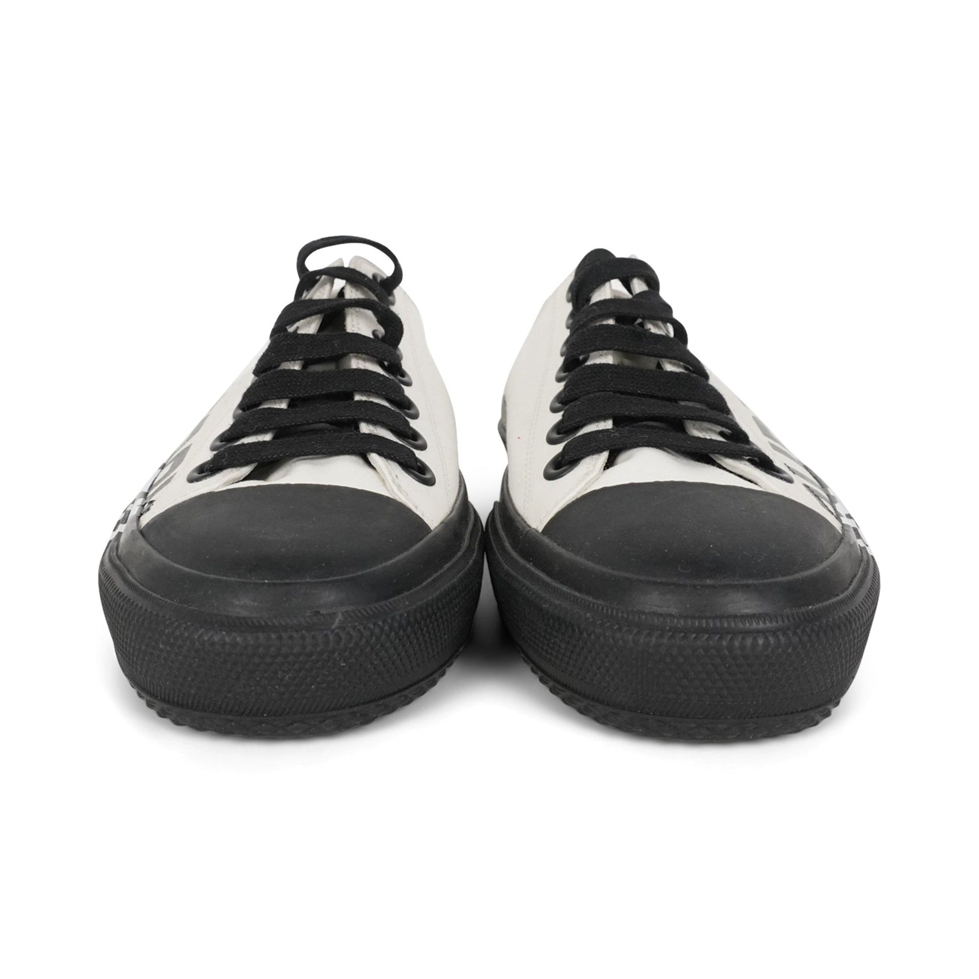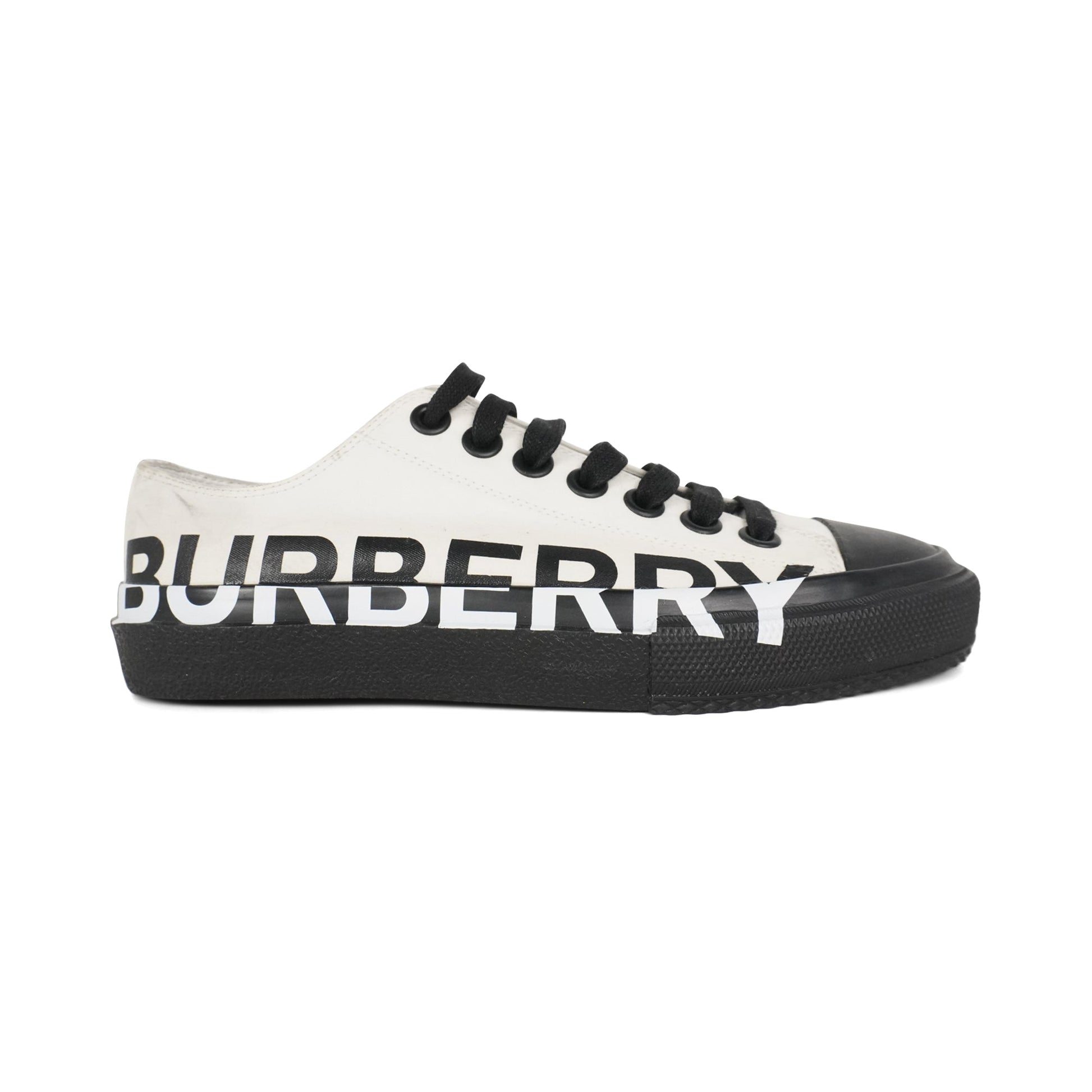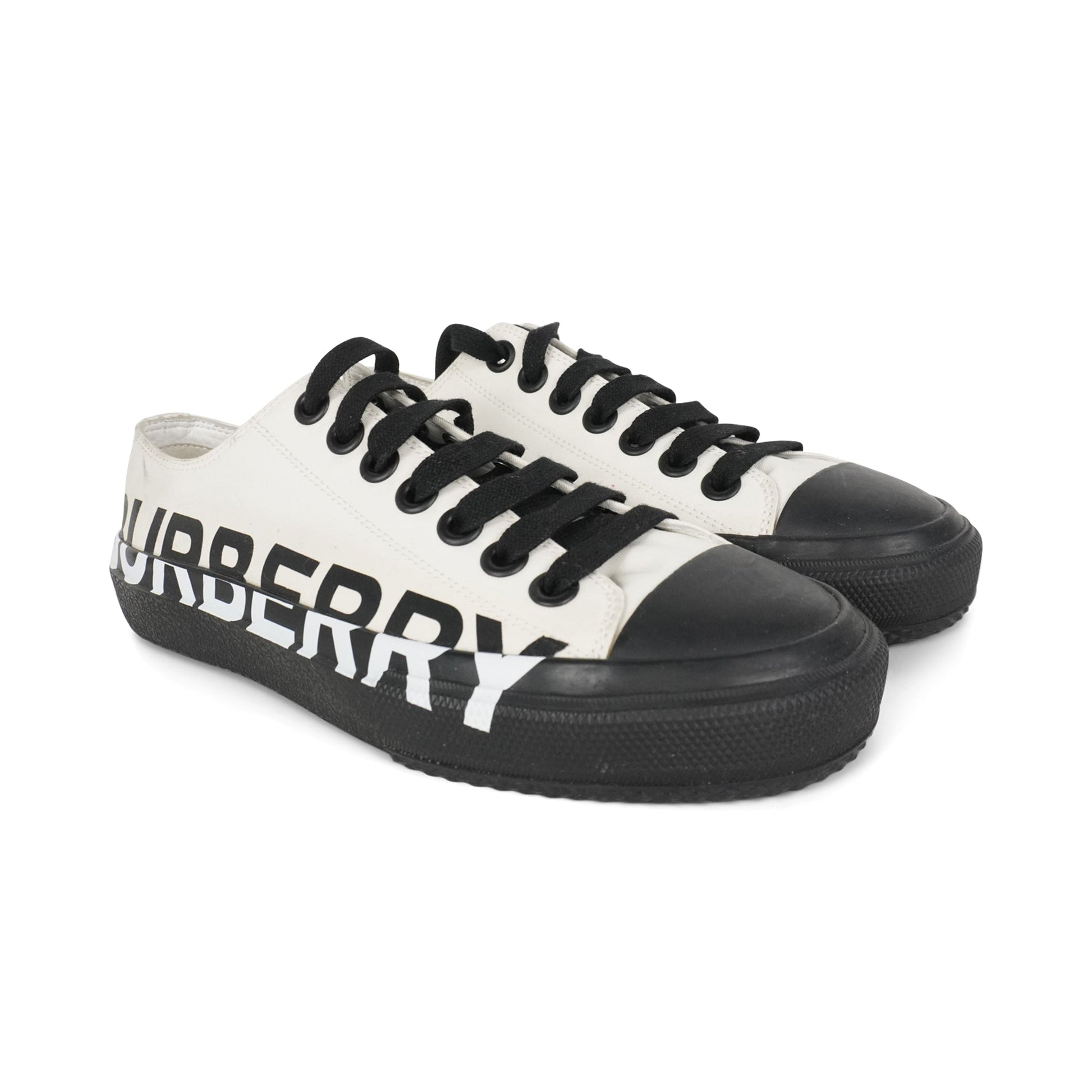 Burberry Low-Top Sneakers in white canvas with a black rubber sole and monogram logo across. Features a black lace-up closure.