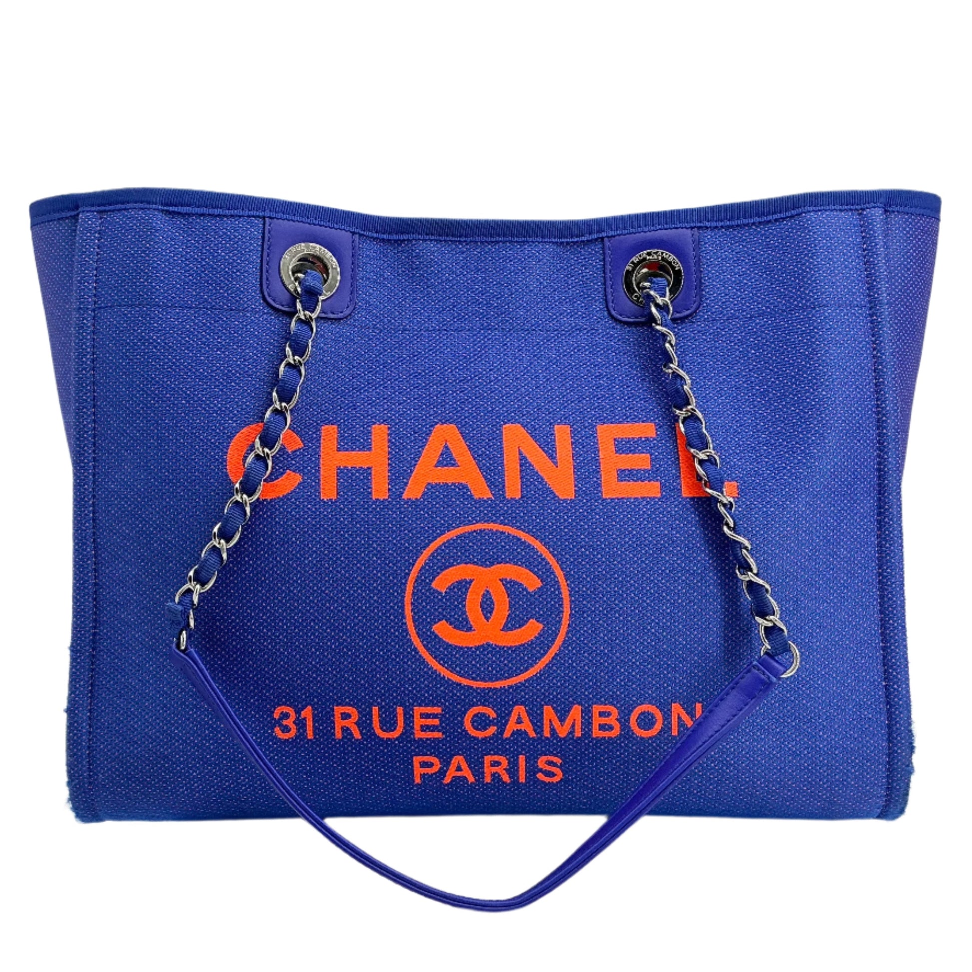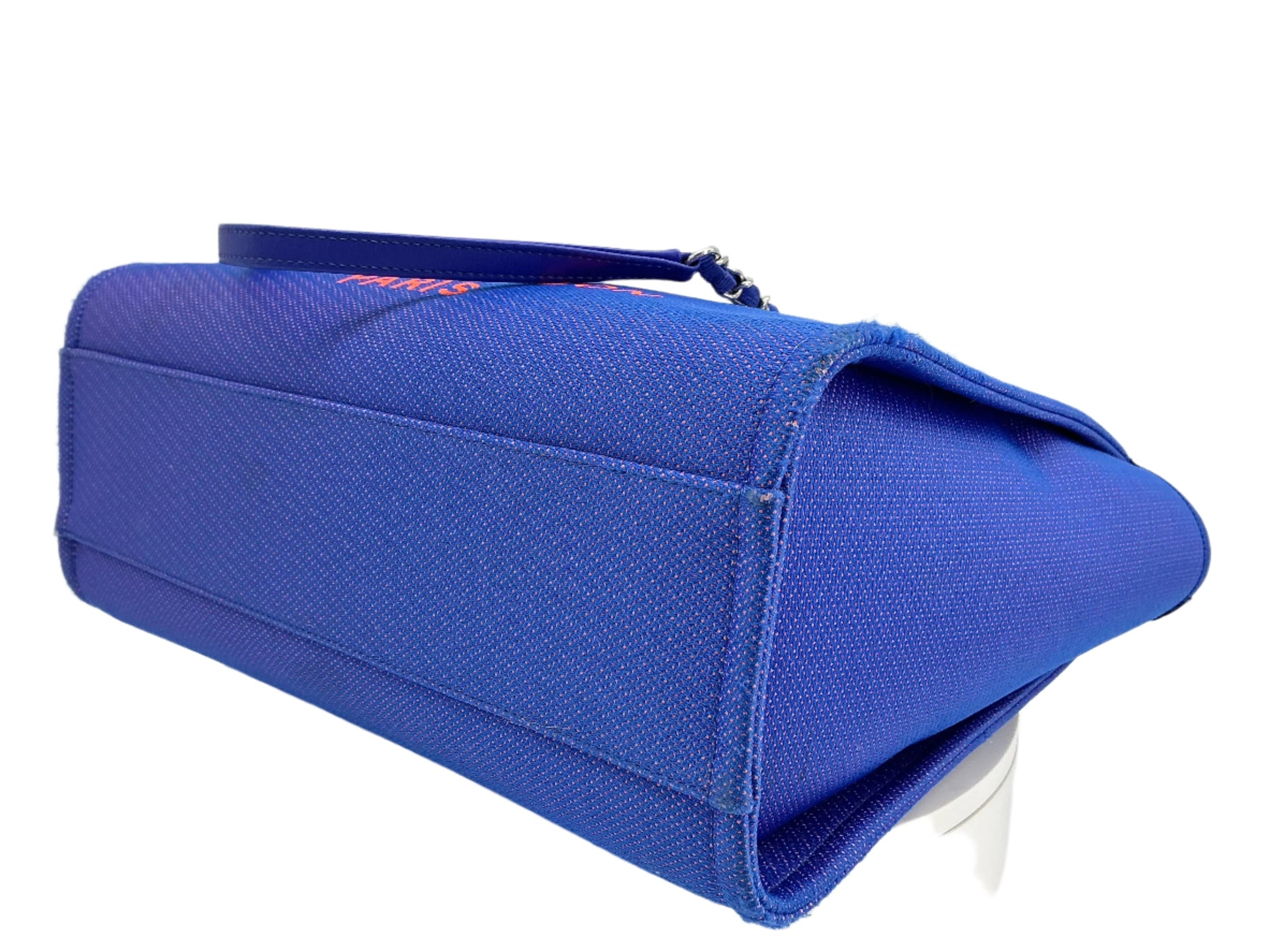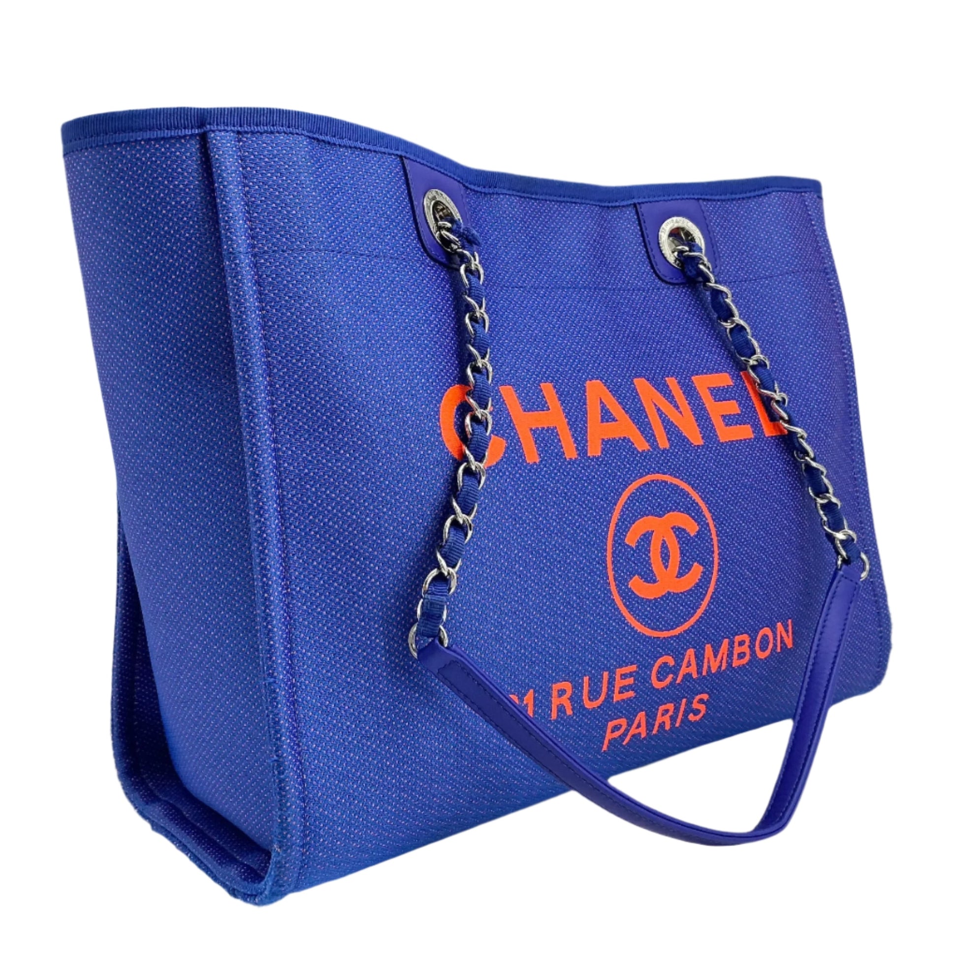 This Chanel Small Deauville Tote is meticulously crafted from durable mixed fiber canvas in rich blue, accented by a striking orange Chanel logo printed boldly on the front. Elegant blue leather top handles combined with polished silver-tone chain-link straps threaded with fabric provide versatile carrying options and classic Chanel sophistication.