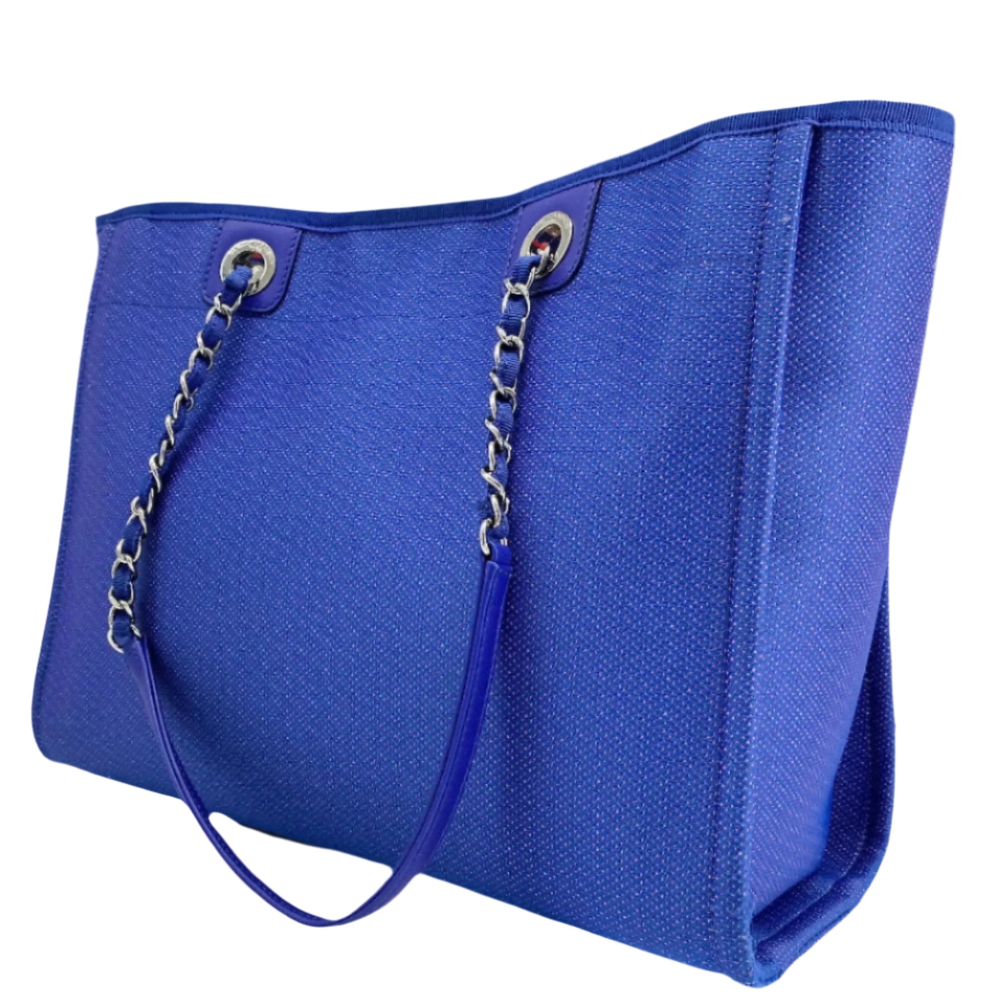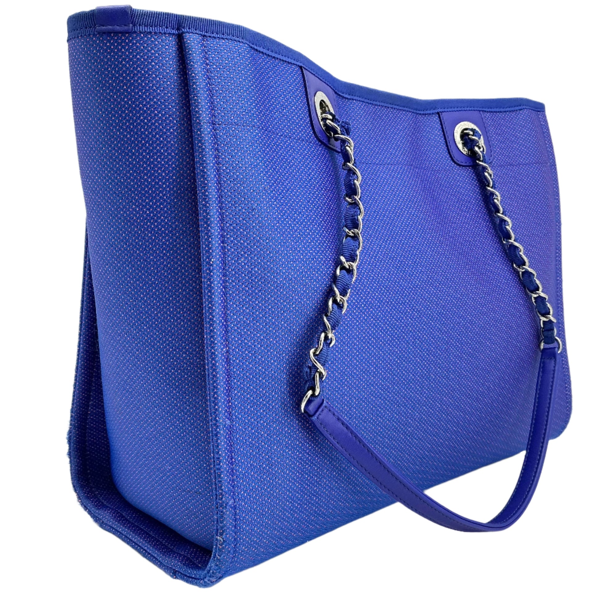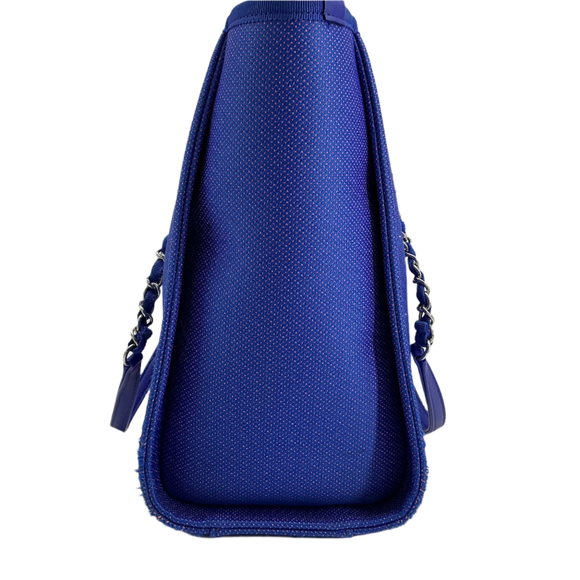This Chanel Small Deauville Tote is meticulously crafted from durable mixed fiber canvas in rich blue, accented by a striking orange Chanel logo printed boldly on the front. Elegant blue leather top handles combined with polished silver-tone chain-link straps threaded with fabric provide versatile carrying options and classic Chanel sophistication.