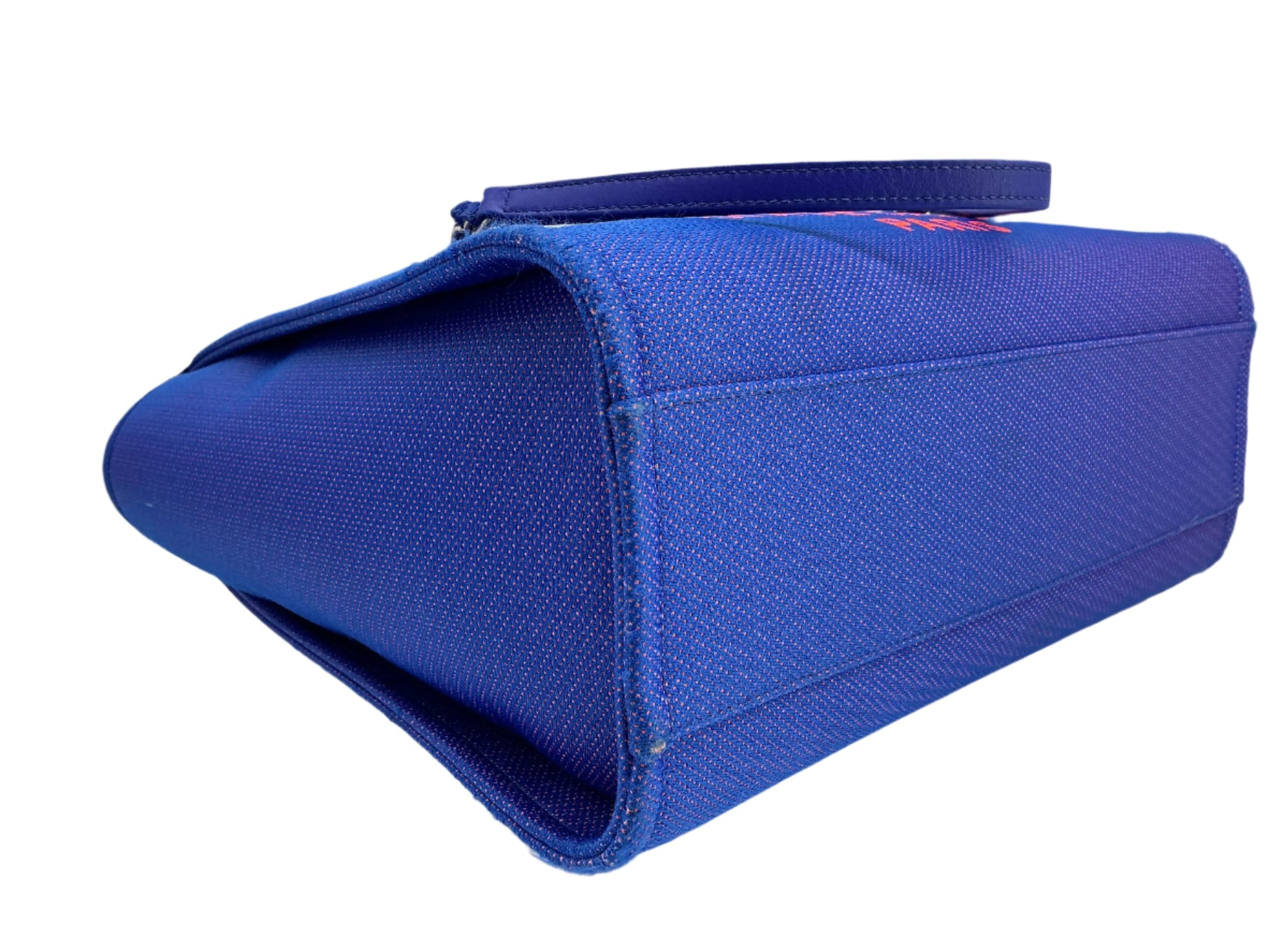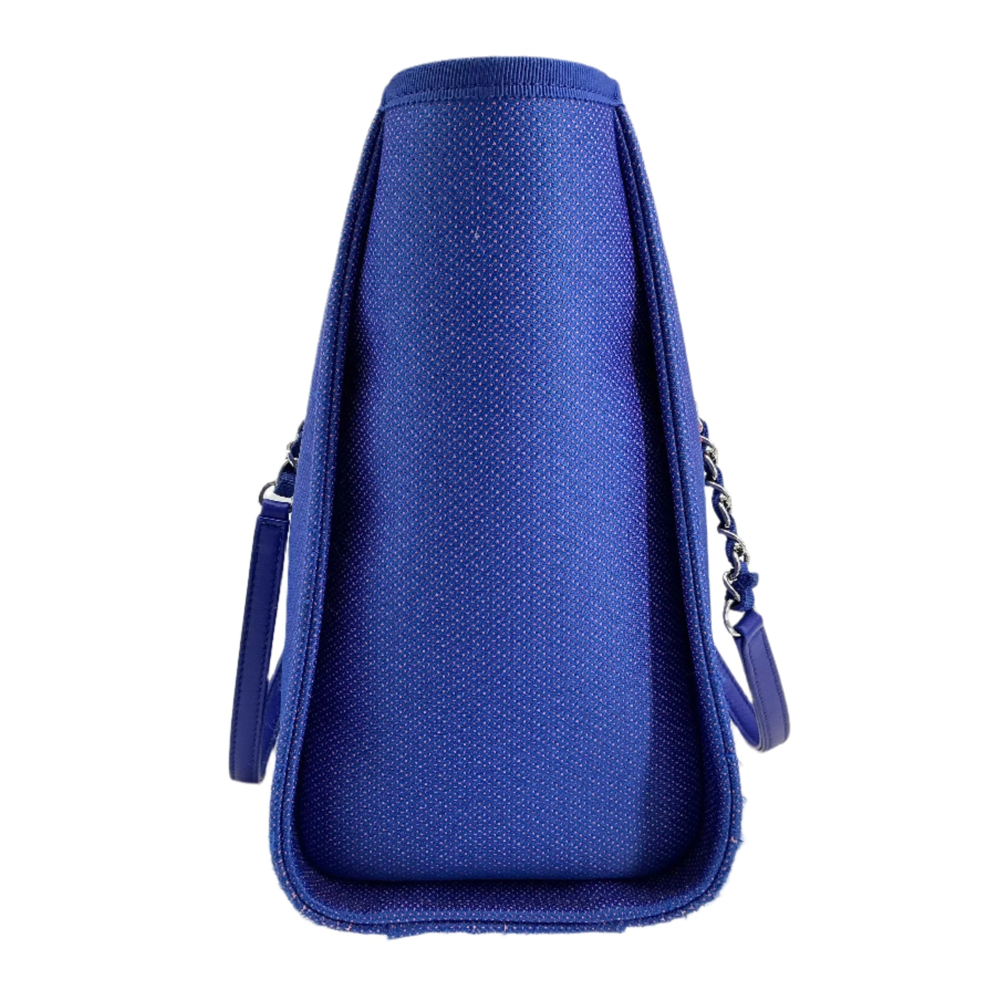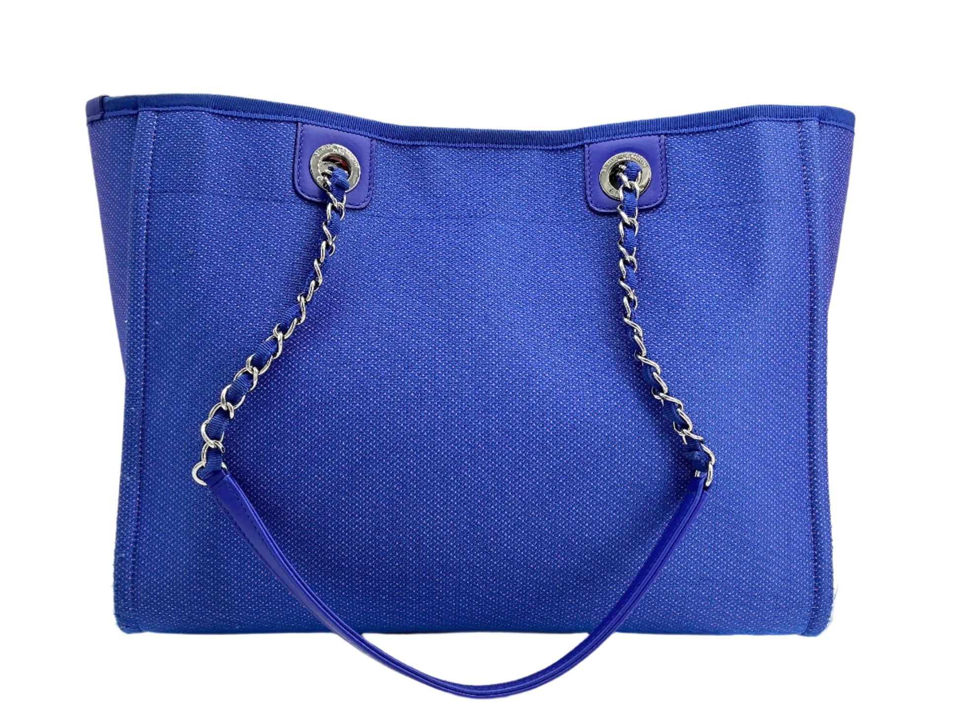 - Exterior Features: Blue canvas, printed orange Chanel logo, leather handles, silver-tone chain-link straps threaded with fabric