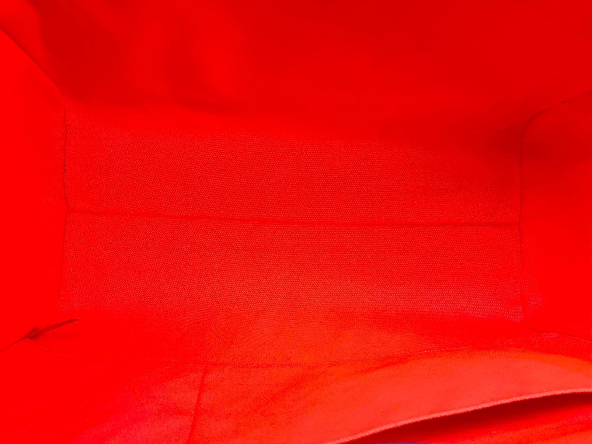 The spacious open-top reveals a bright orange fabric-lined interior, thoughtfully designed with convenient zipper and patch pockets to keep essentials organized. A stylish and practical statement piece, perfect for daily errands or weekend escapes.