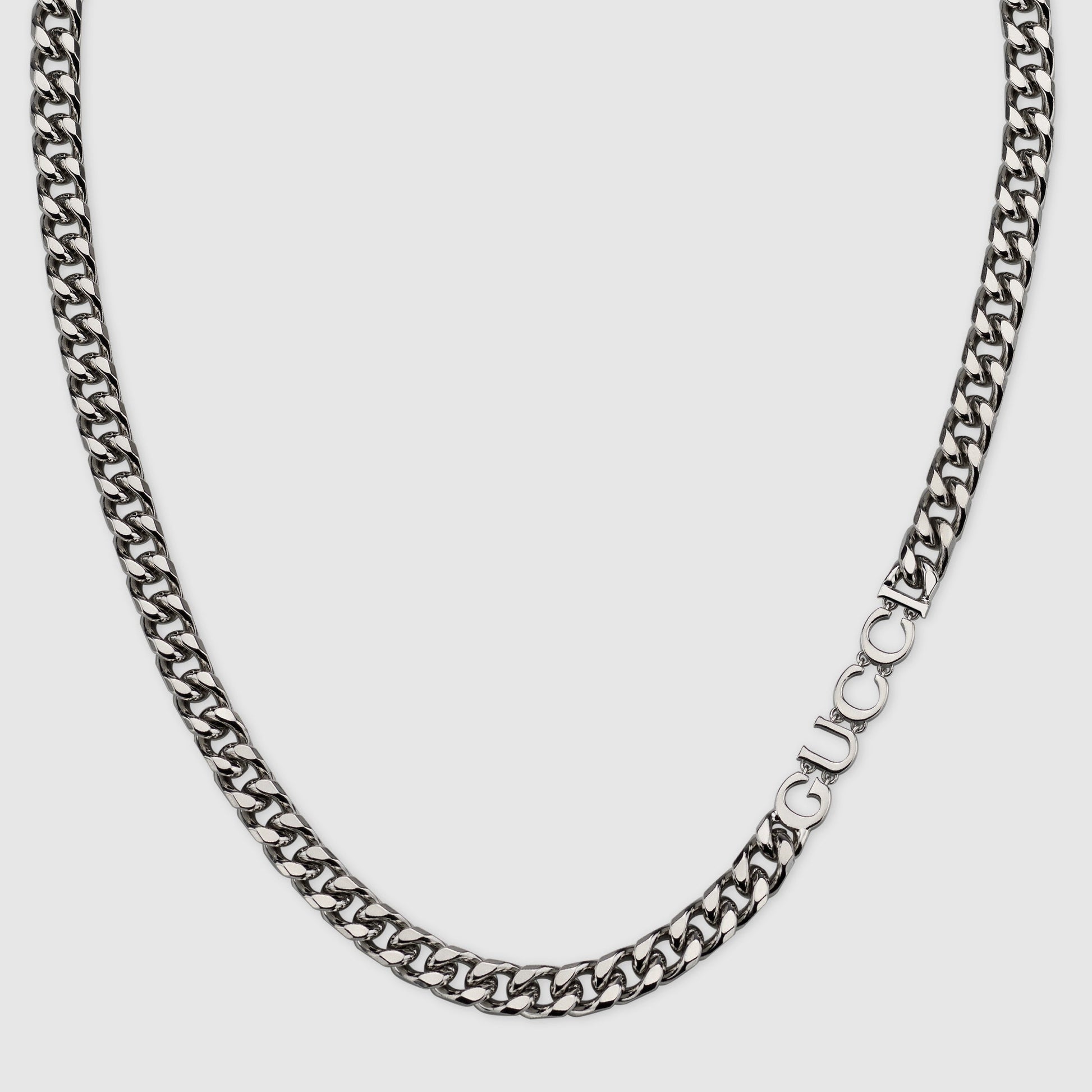 The signature fashion jewelry line featuring the Gucci script appears in a shiny new finish, with the name of the House enriching necklaces and bracelets as a central charm or pendant. Here it defines this gourmette chain necklace with clasp closure in palladium metal.