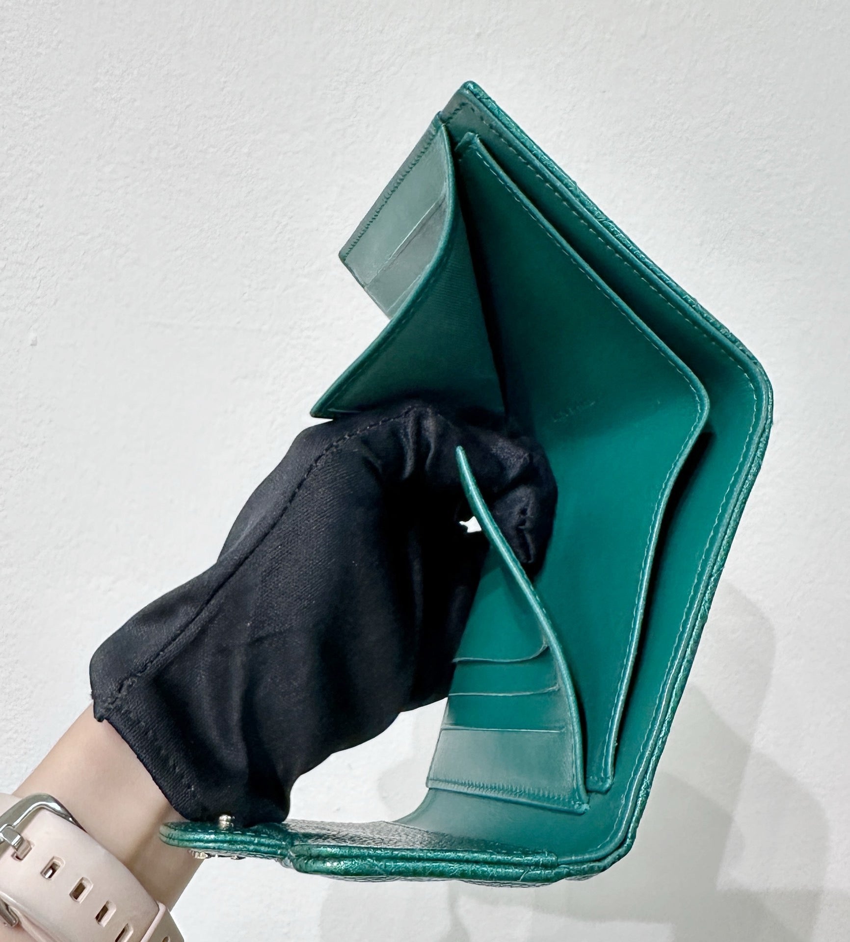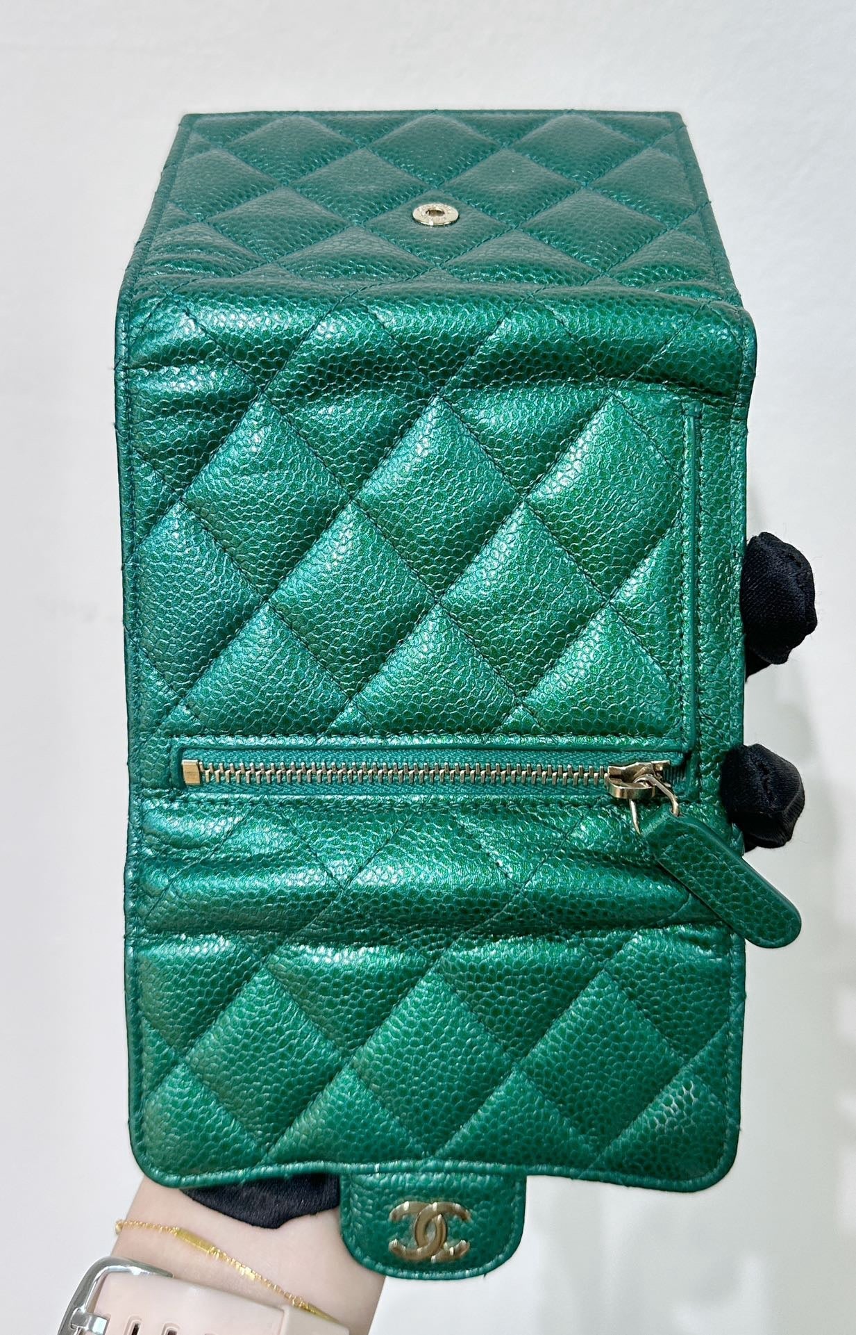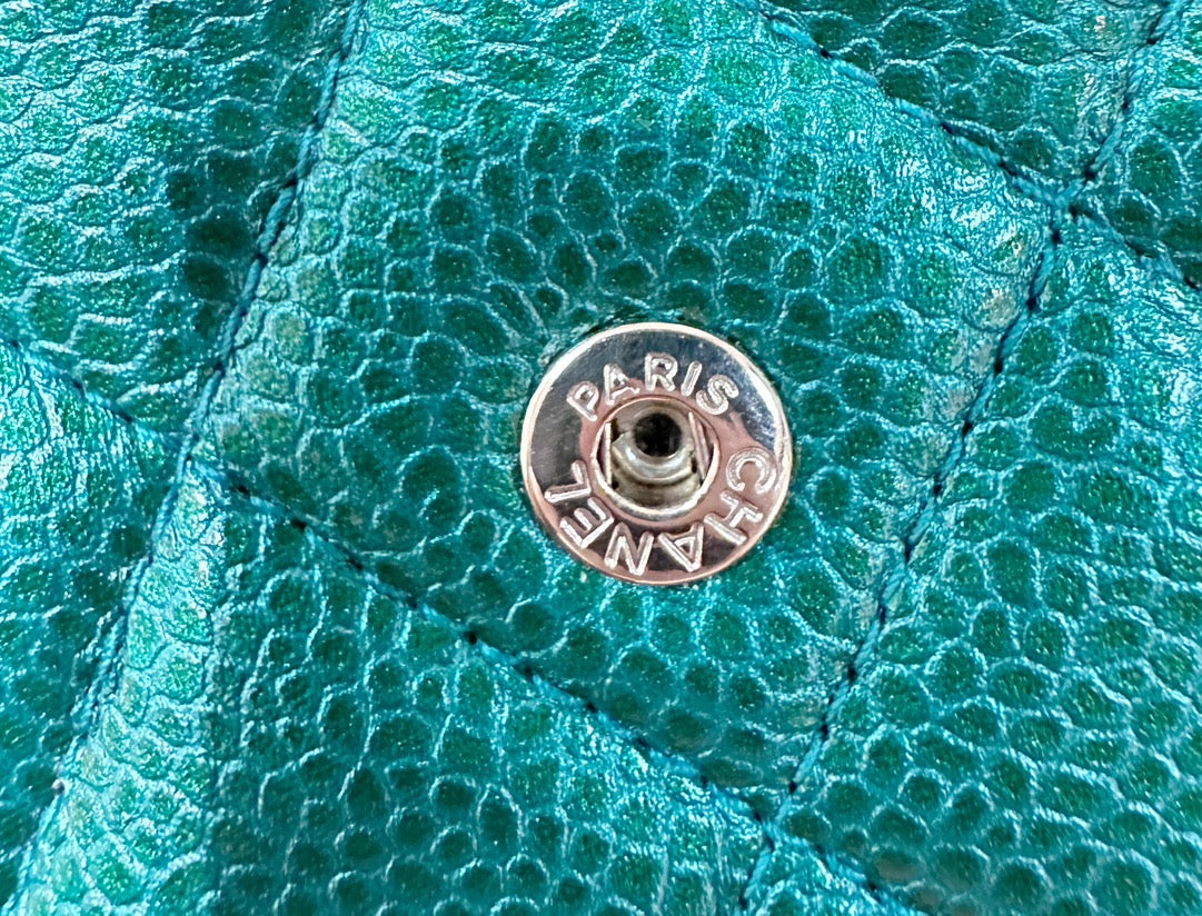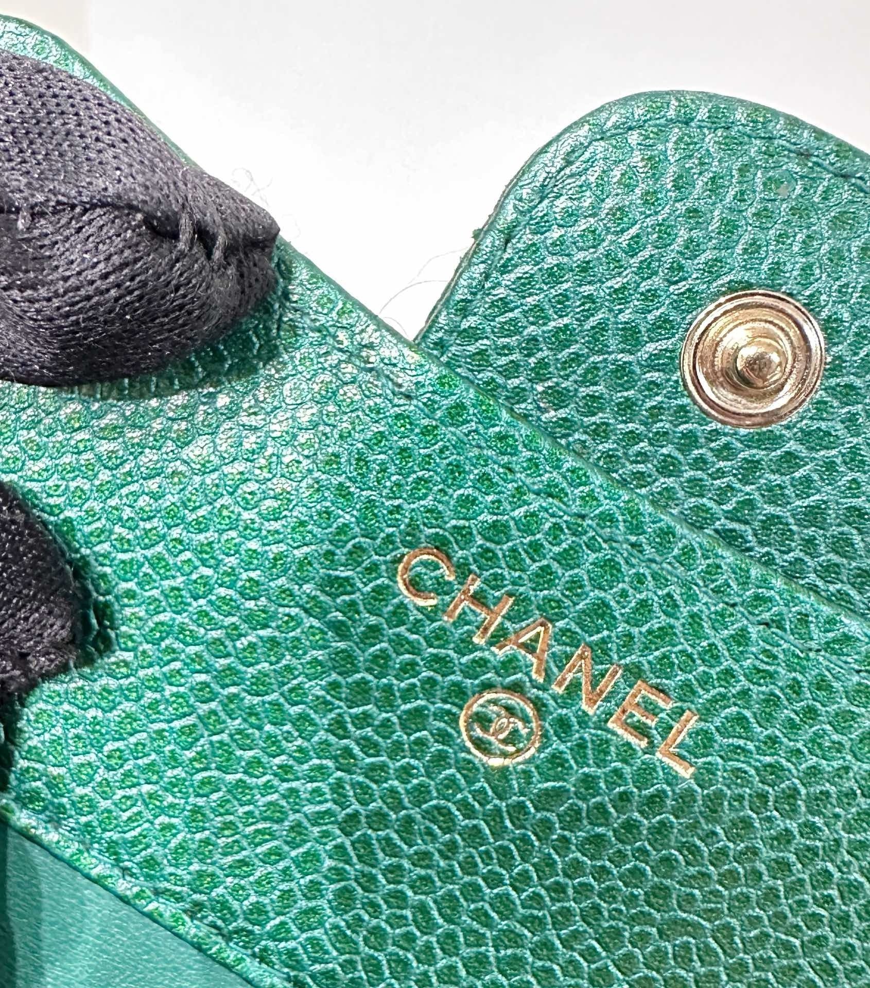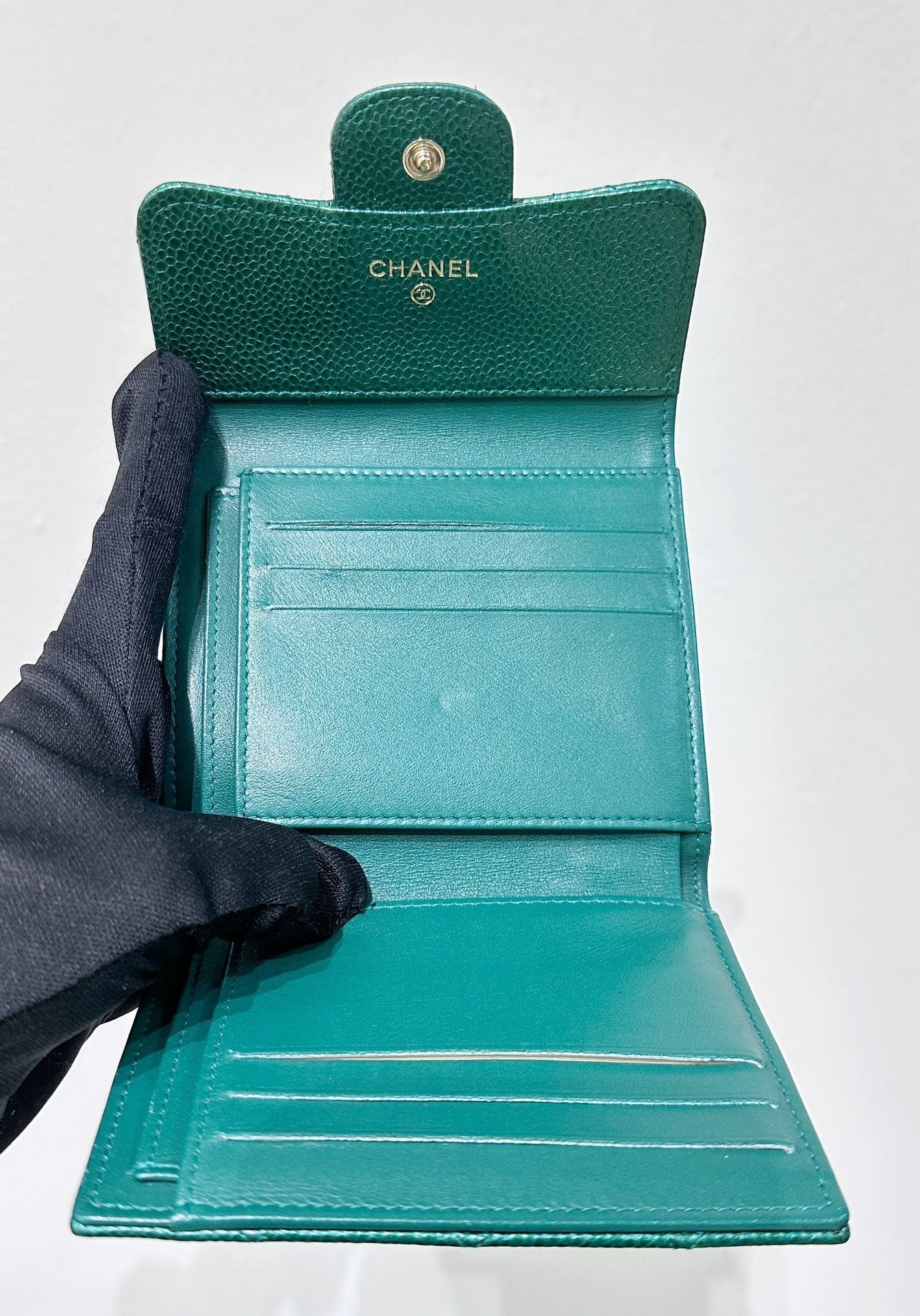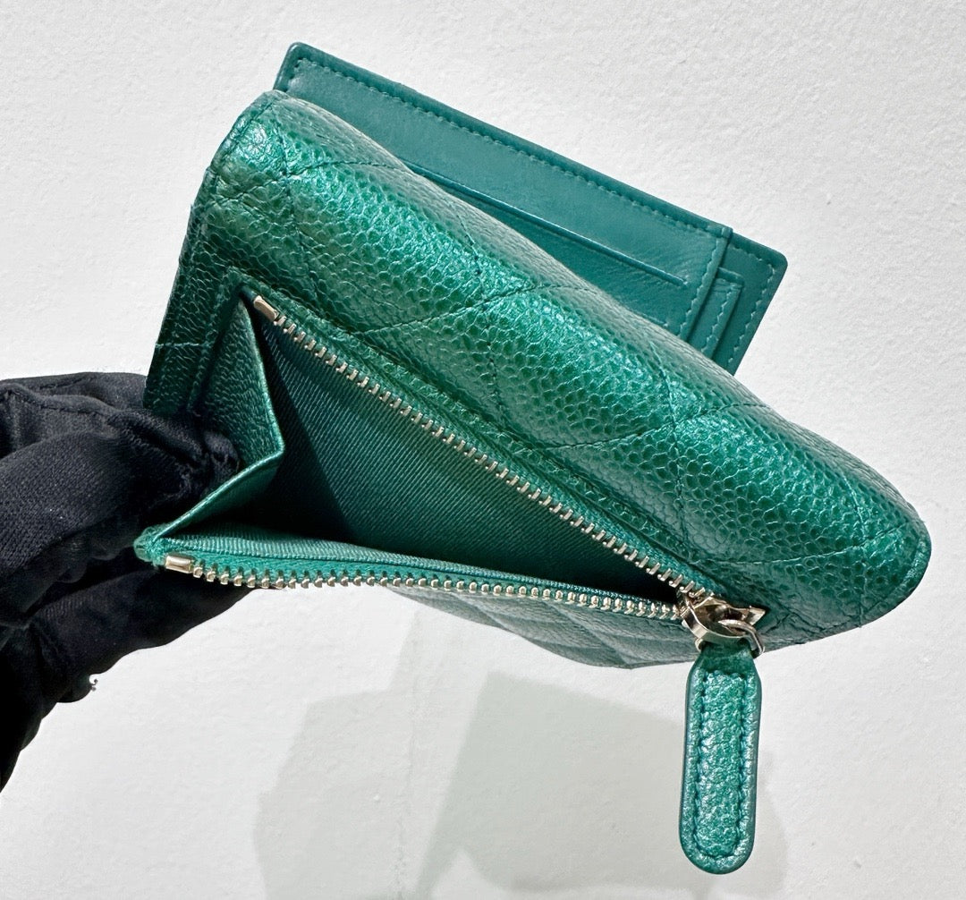 CHANEL 18S Iridescent Green Caviar Trifold Wallet Light Gold Hardware