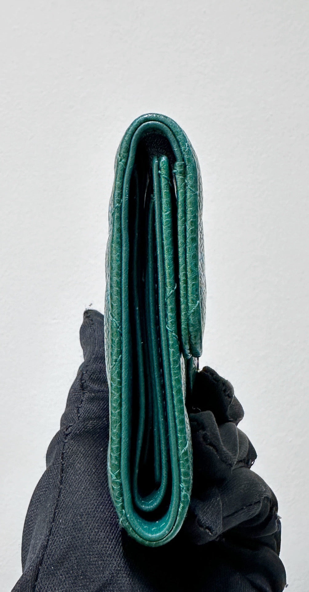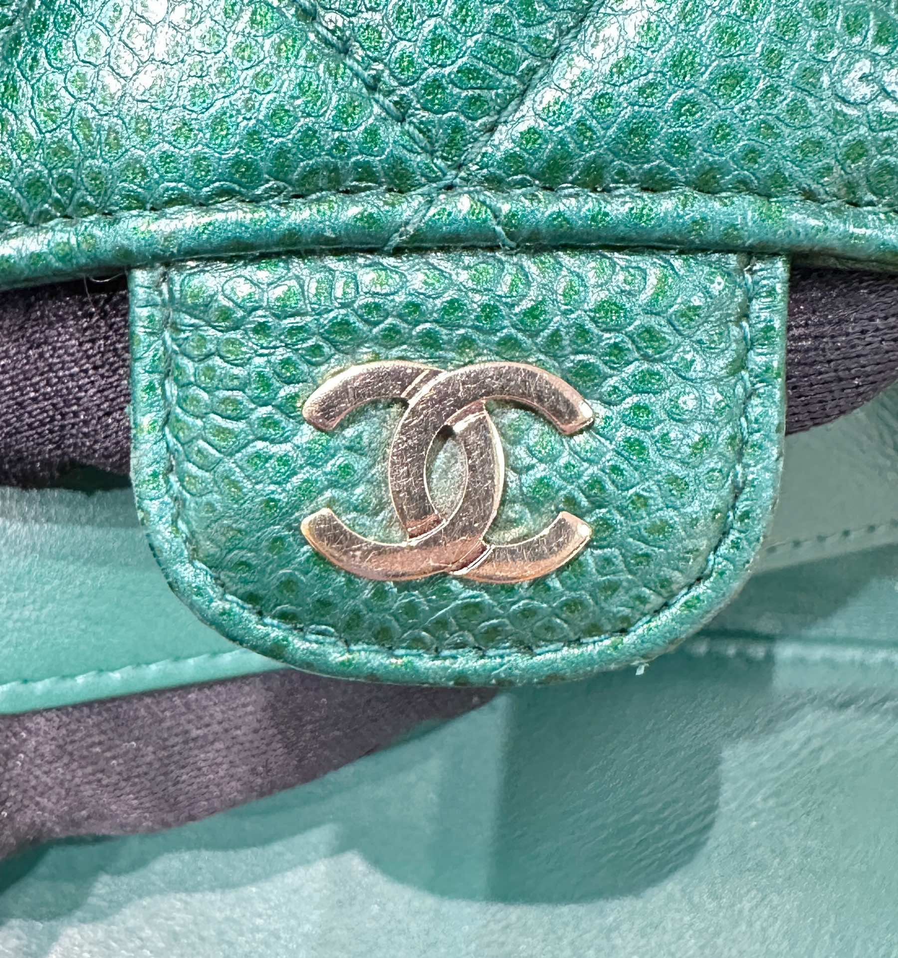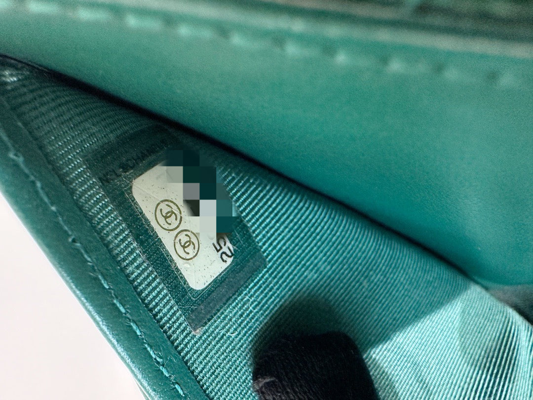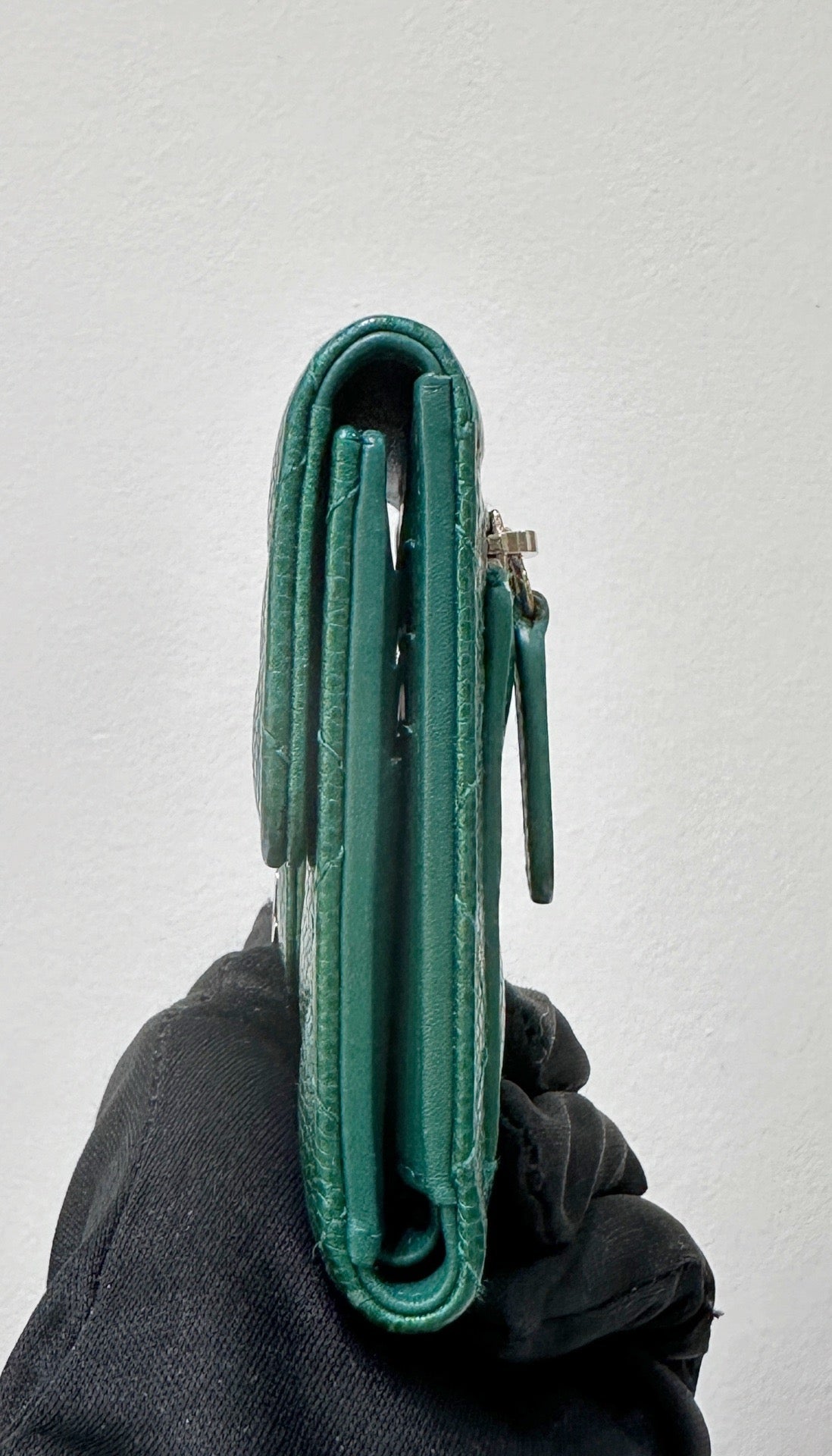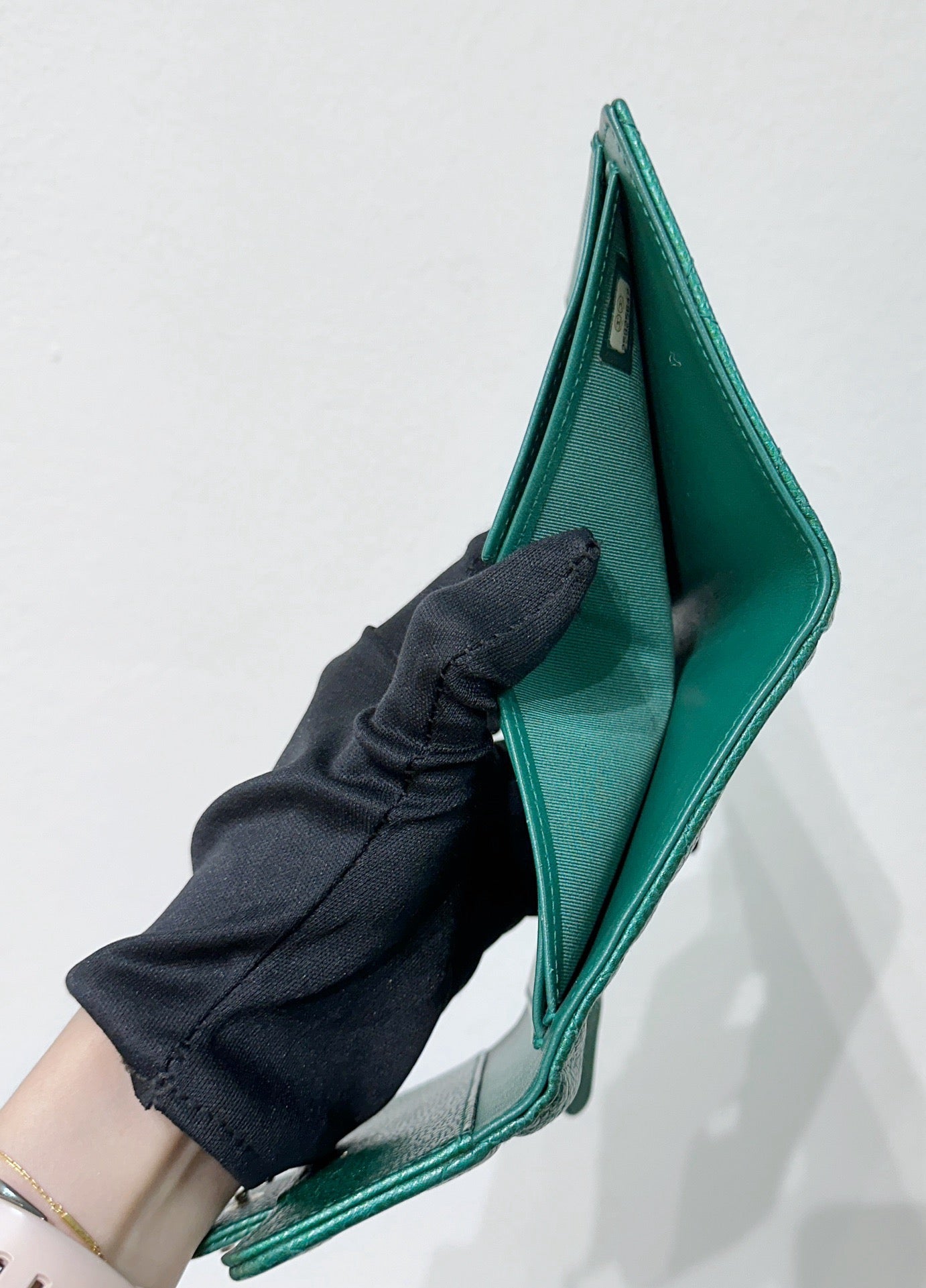 CHANEL 18S Iridescent Green Caviar Trifold Wallet Light Gold Hardware