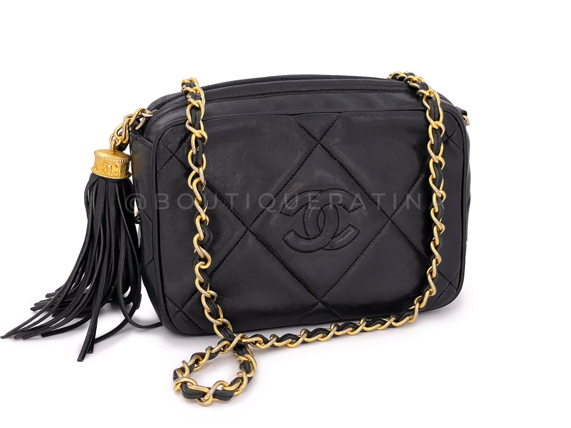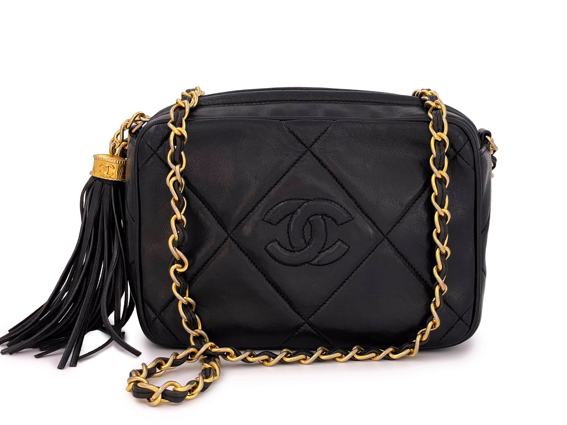 This is THE classic vintage Chanel lambskin camera case bag. It has all of the features of the signature classic camera and is most popular compared to other deviations - the tassel ball charm zipper pull, the woven chain strap in 24k gold plated hardware which can be carried on the shoulder or crossbody, and the large CC stitched logo framed in the giant diamond, surrounded by diamond quilts throughout the front and back.
