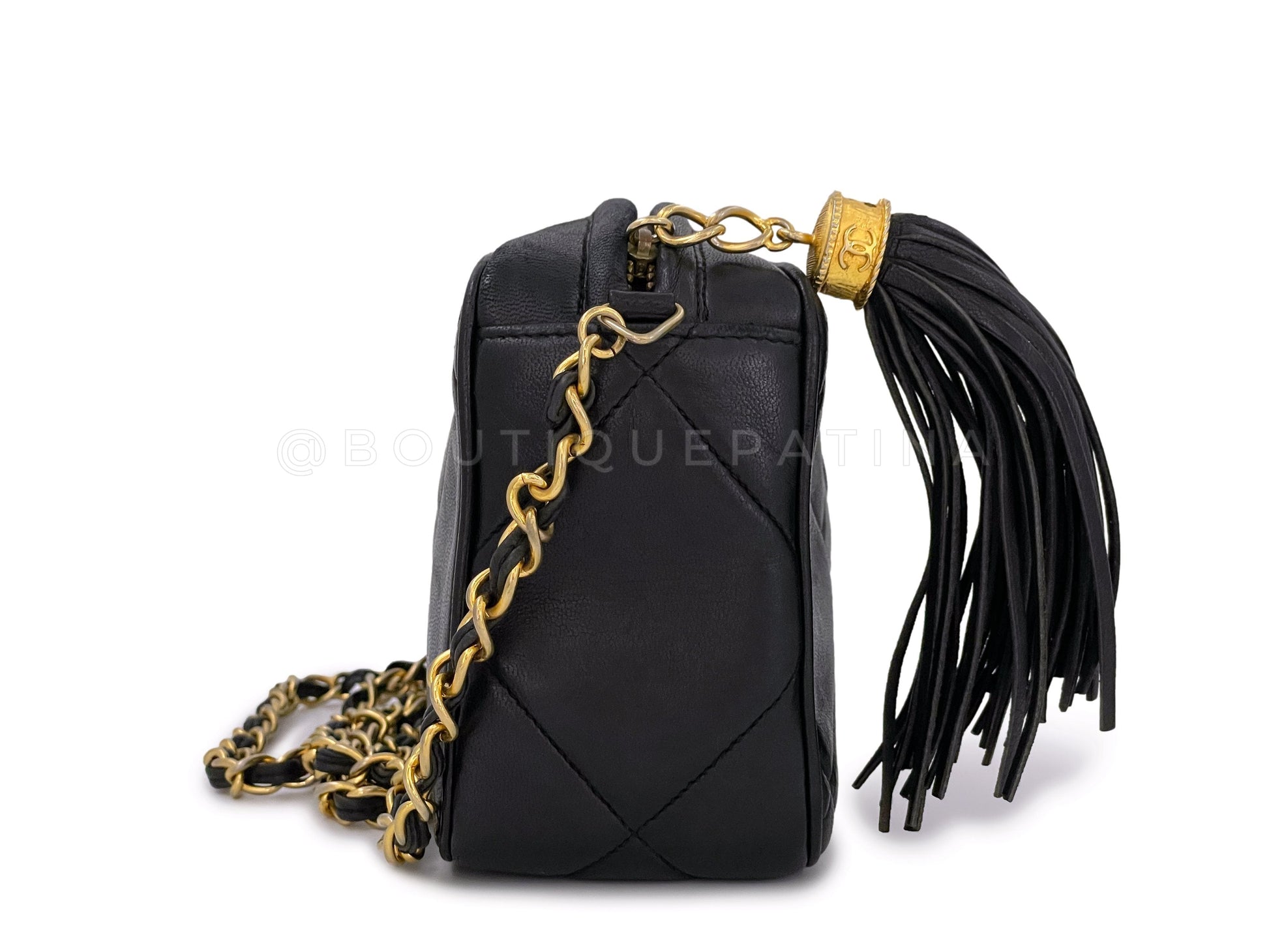 In Black lambskin leather and 24k gold plated hardware. Boutique Patina specializes in sourcing and curating the best condition preowned vintage Chanel leather treasures by searching closets around the world.