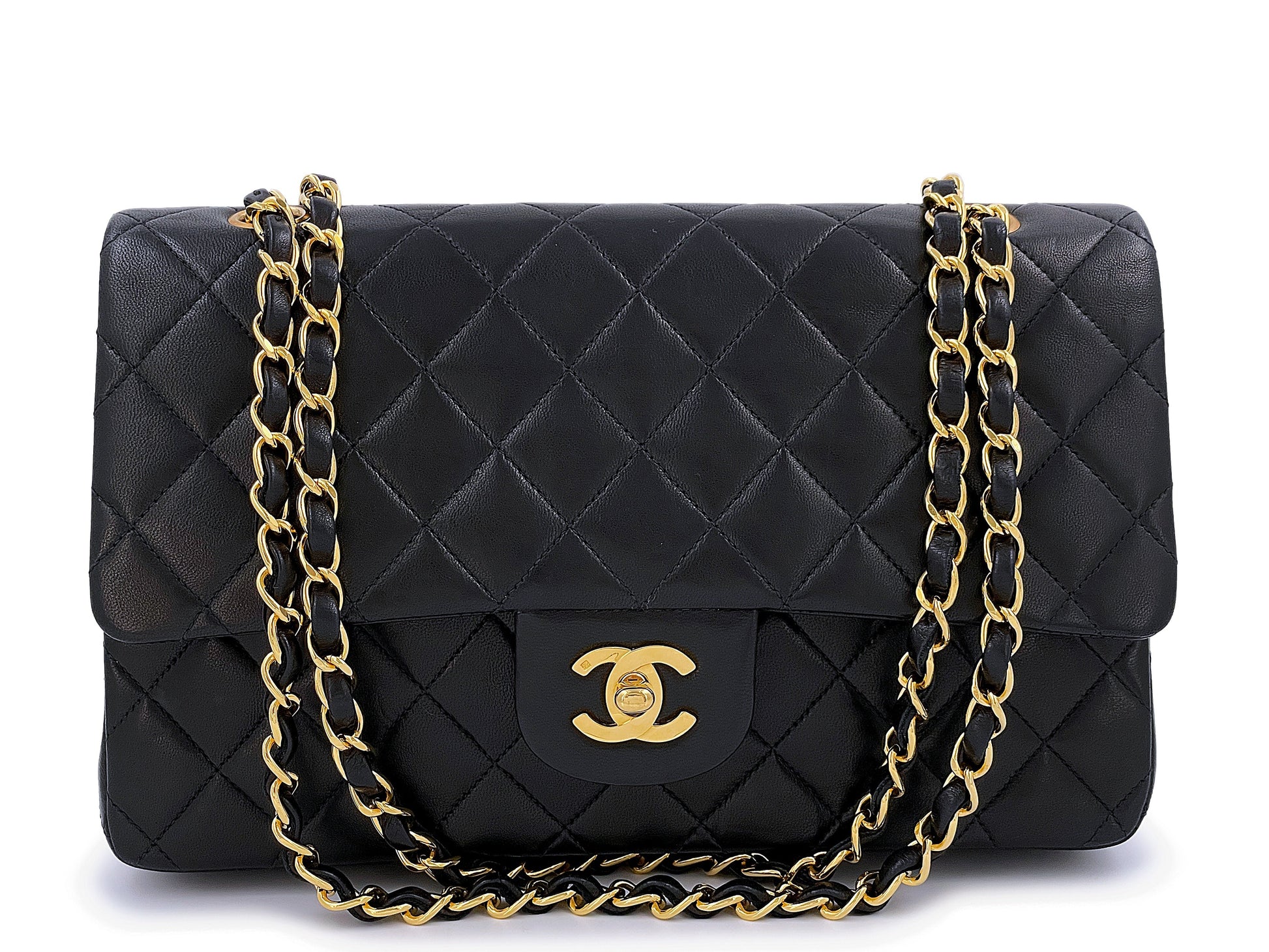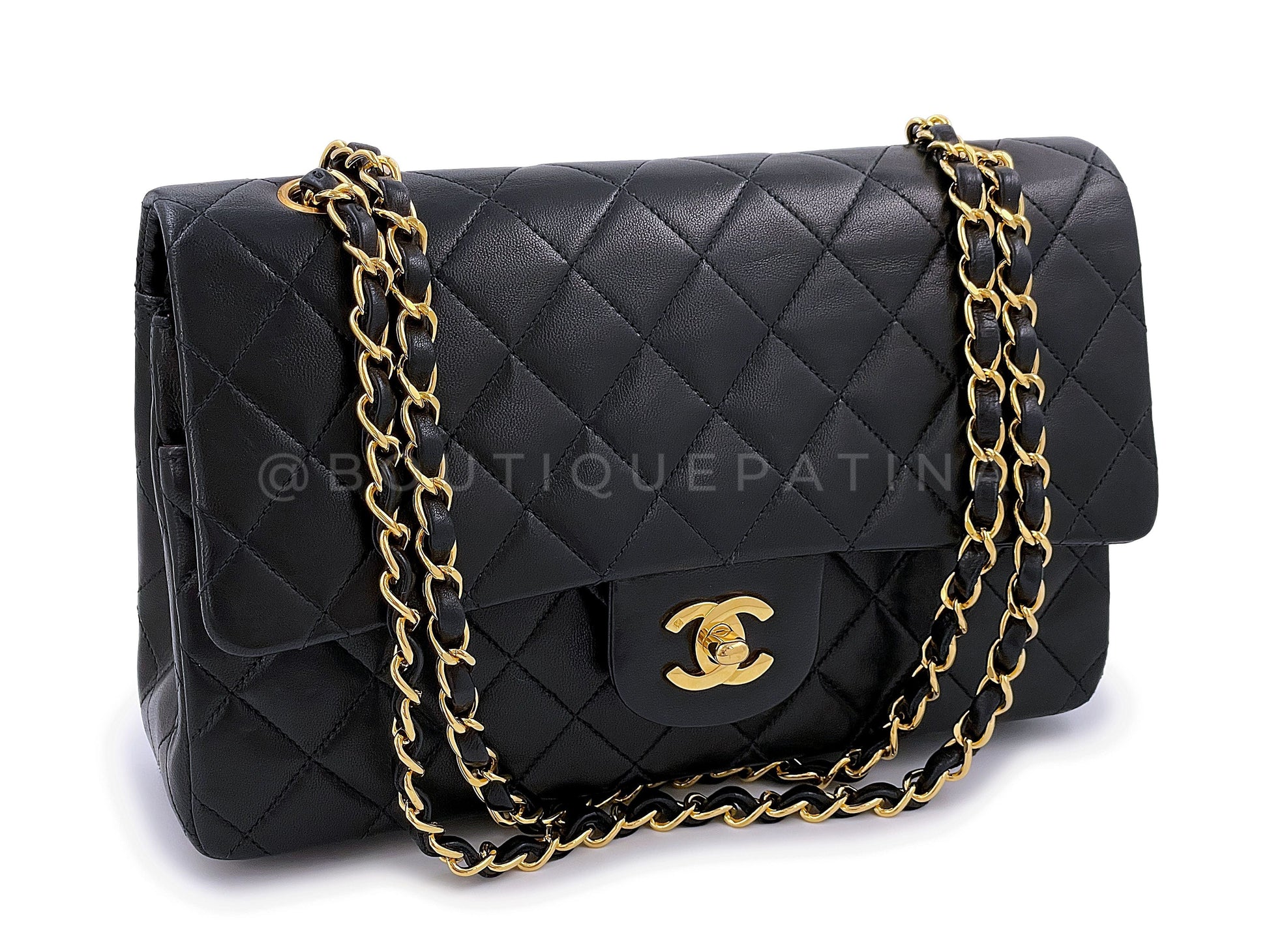 In Black lambskin leather and 24k gold plated hardware. In lambskin leather, the original classic flap in all its glory with its petal soft quilts, true luxury. Boutique Patina specializes in sourcing and curating the best condition preowned vintage Chanel leather treasures by searching closets around the world.