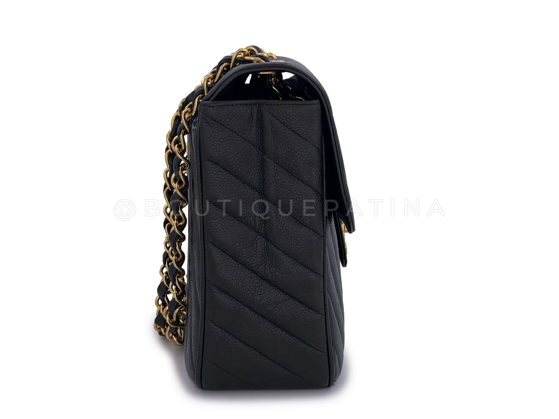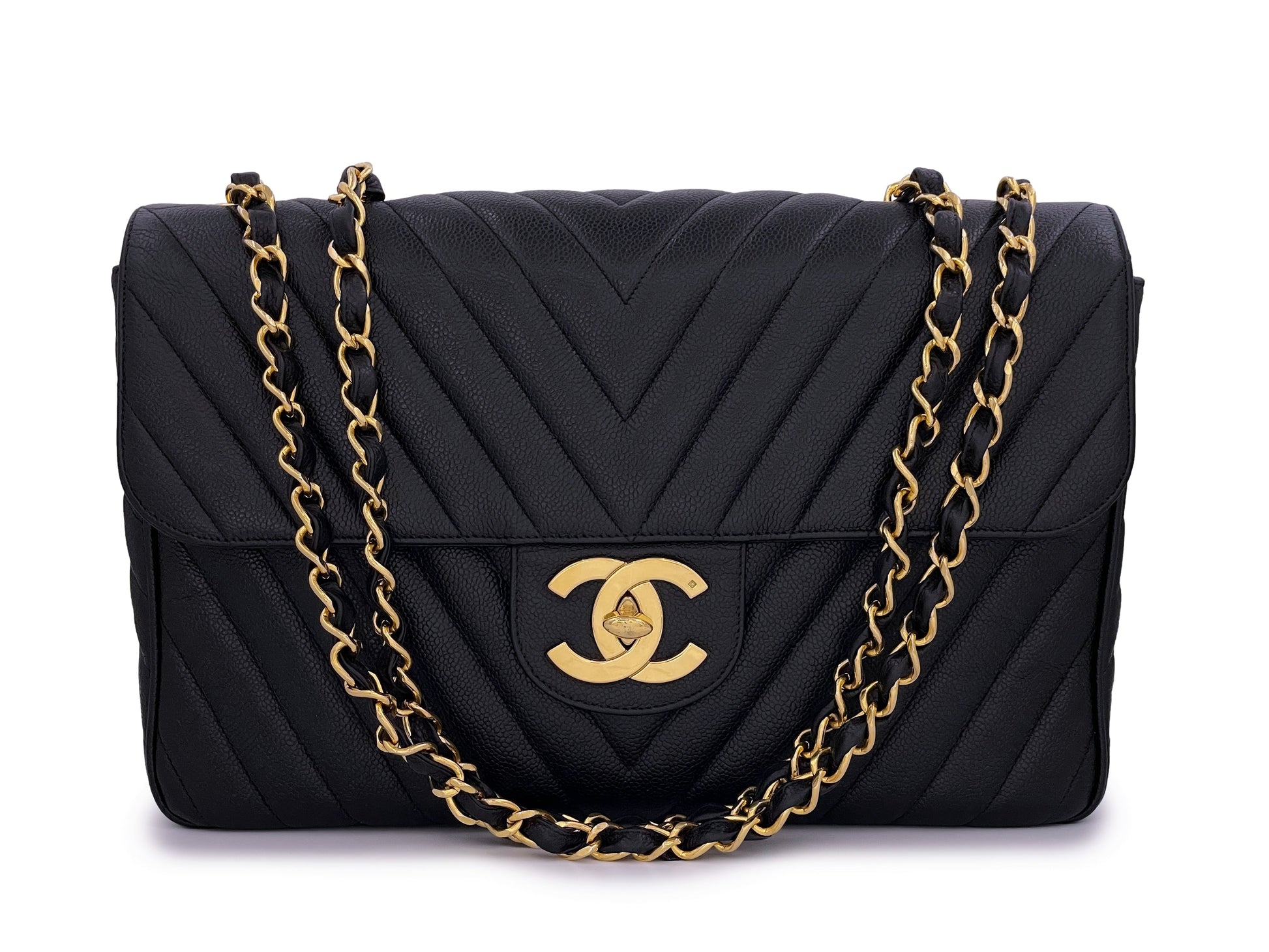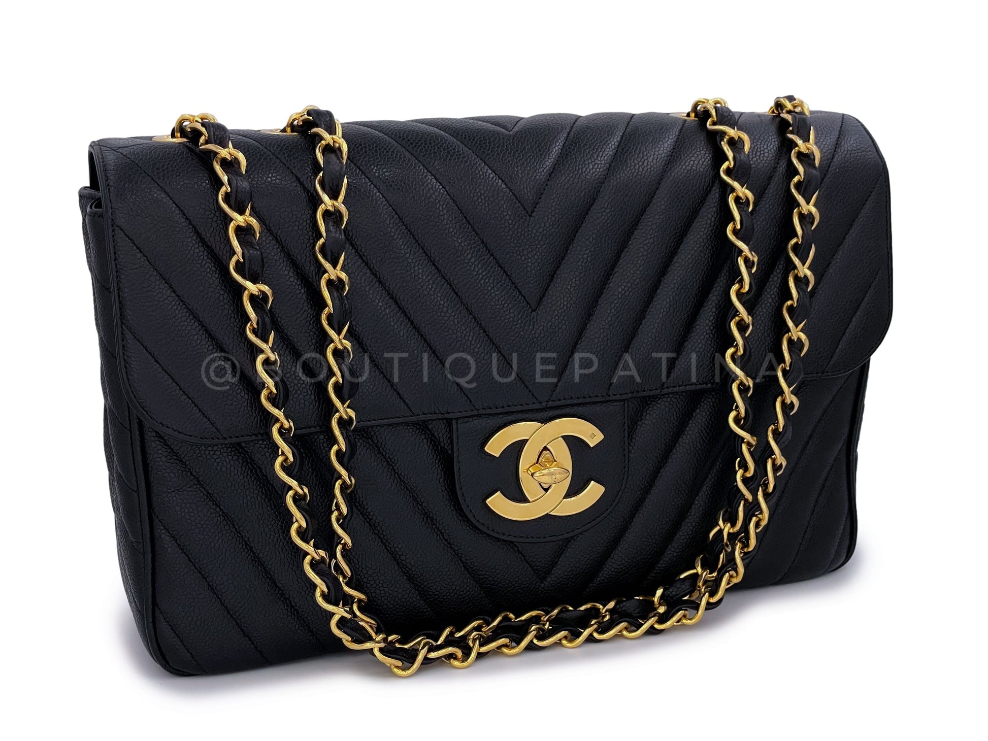 This is the "Maxi XL" 14 inch model of this bag. The chunky double woven chain strap can be worn single strap cross-body or doubled on the shoulder. Boutique Patina specializes in sourcing and curating the best condition preowned vintage Chanel leather treasures by searching closets around the world.