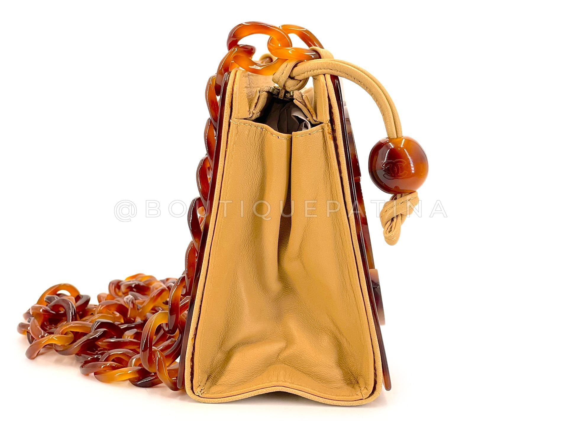 Chanel 1994 Vintage Tortoise CC Logo Crossbody Mini Bag is a whimsical yet practical and very obviously vintage Chanel number with brown tortoise resin chain strap, brown tortoise resin front and back panels with oversized CC on front, and beige lambskin interior.