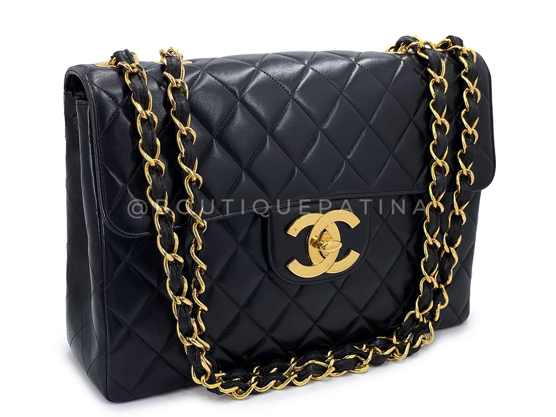 This is the jumbo 12" model of this bag (there is the jumbo and the maxi size). Boutique Patina specializes in sourcing and curating the best condition preowned vintage Chanel leather treasures by searching closets around the world.