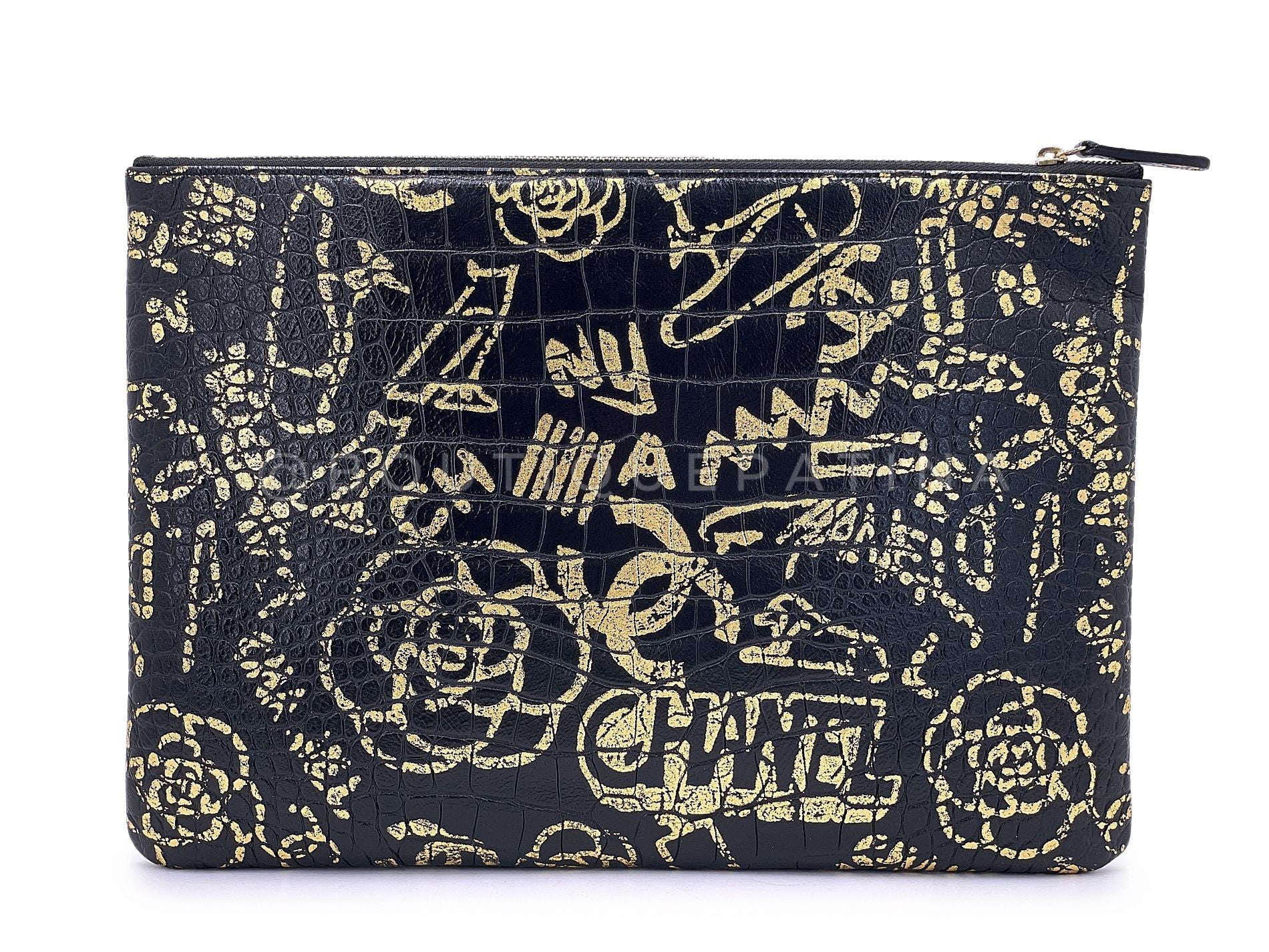 Chanel 19A Egypt Paris-New York Graffiti Print Black Gold Clutch Bag O Case Large 243