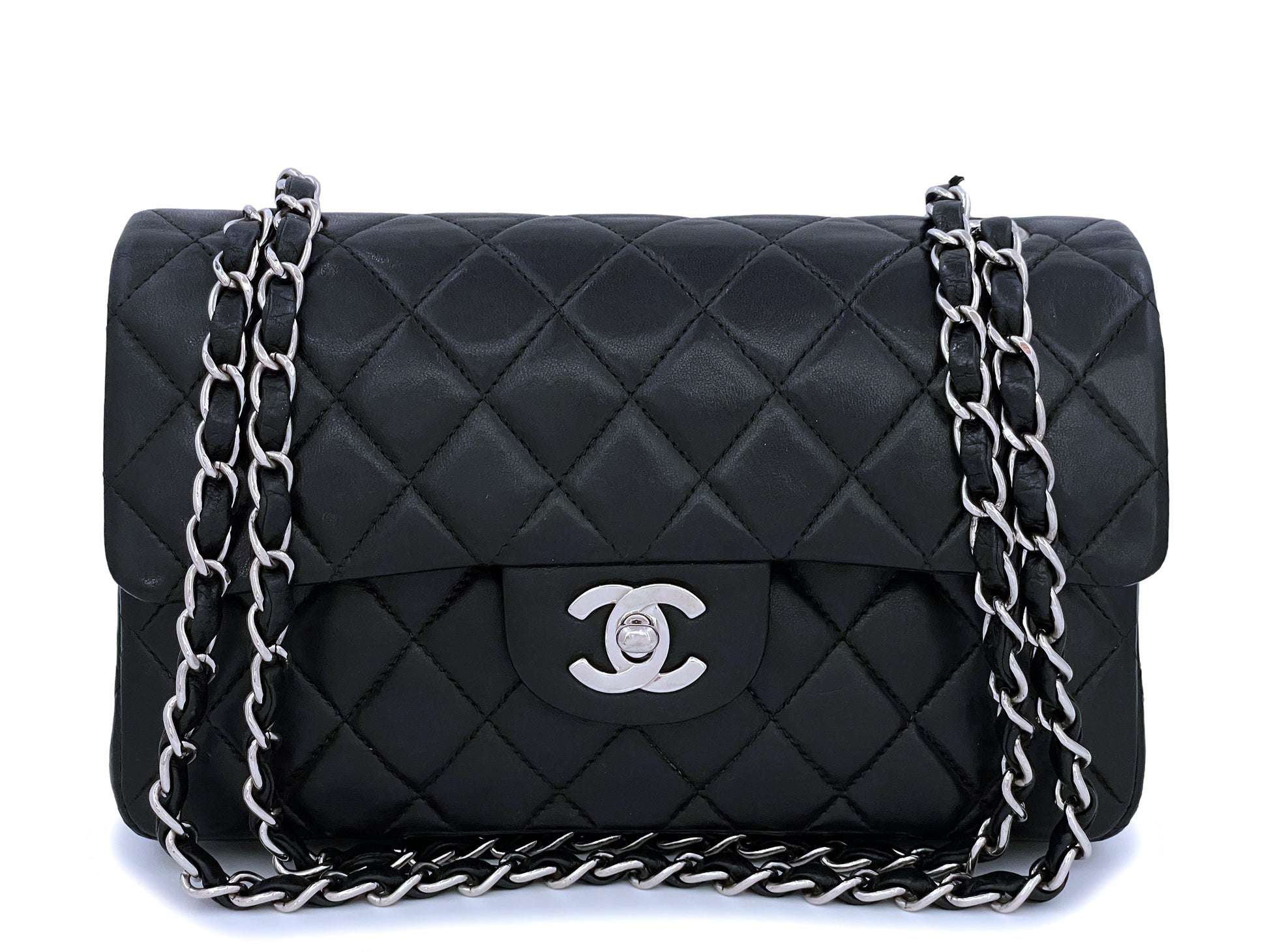 The small size of the classic double flap is harder to find than the medium -- at 9 inches wide, right in between the medium and the rectangular mini, it's the smaller size of the medium flap. Especially for vintage models, this size is harder to find than its medium counterparts. Boutique Patina specializes in sourcing and curating the best condition preowned vintage Chanel leather treasures by searching closets around the world.