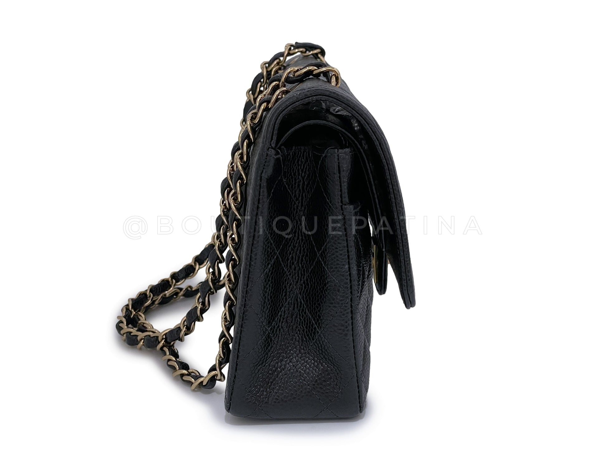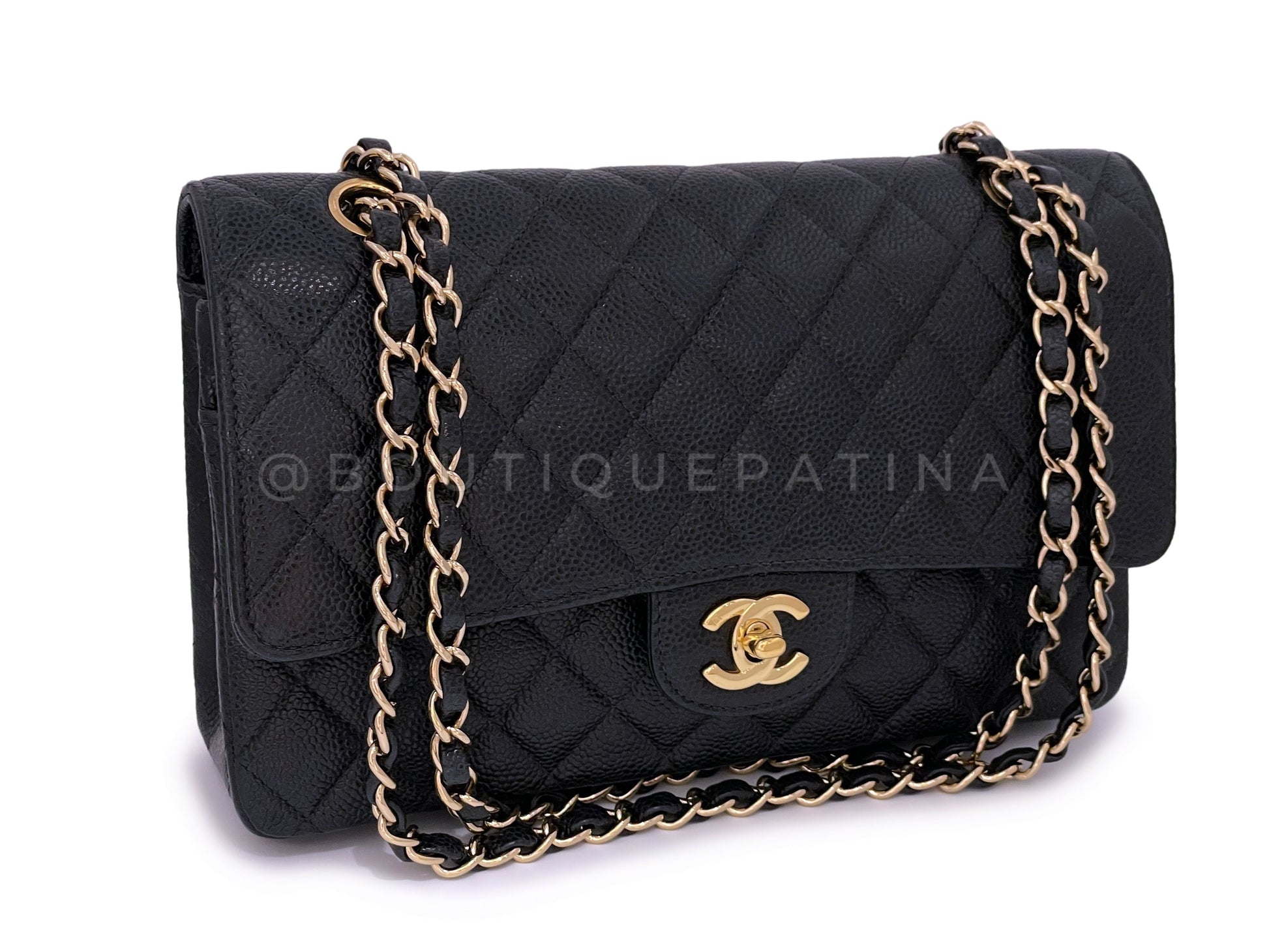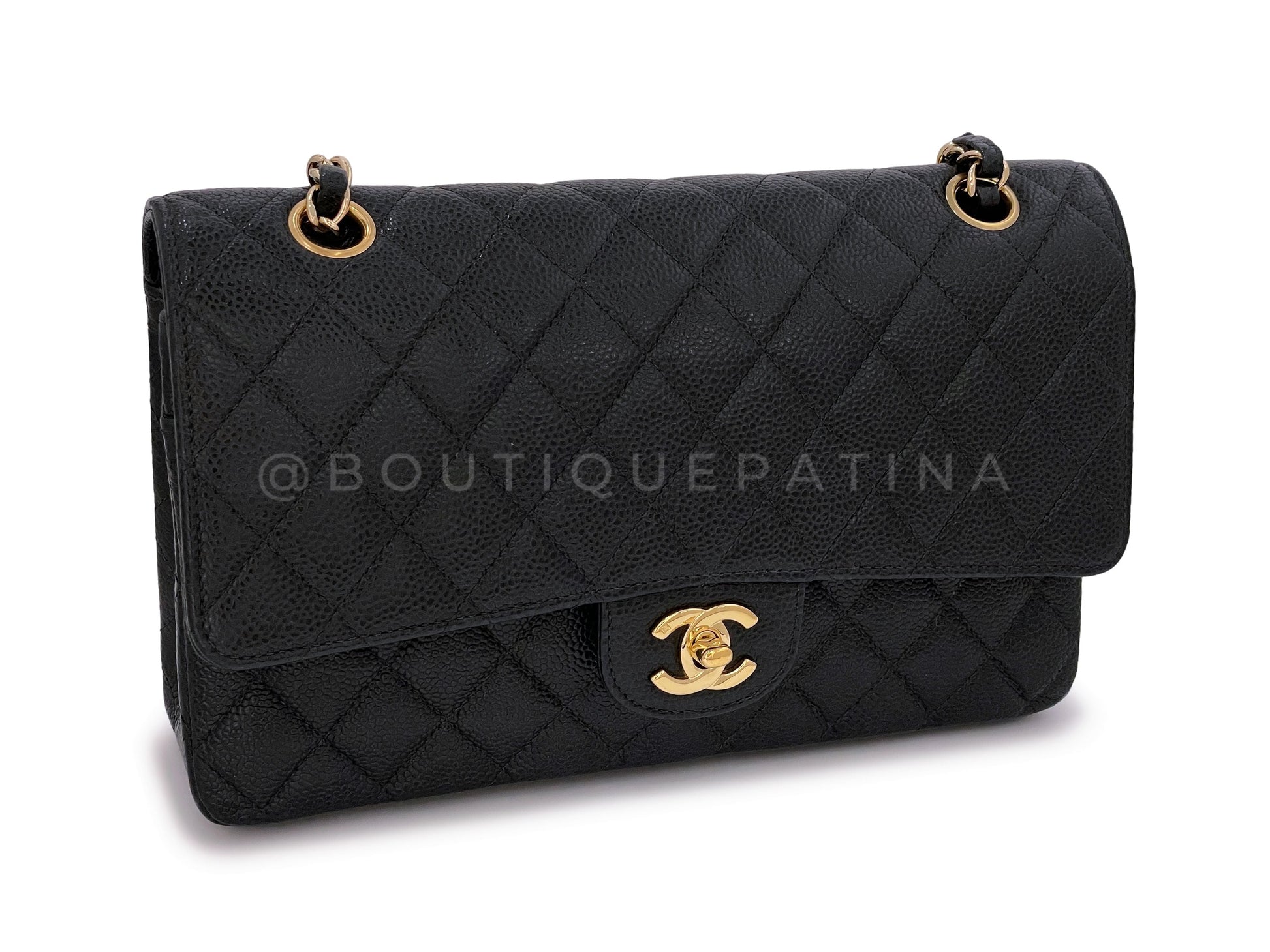 In Black caviar leather and 24k gold plated hardware. In caviar leather, the classic flap is durable with the pebbled grain nodes of calfskin leather. Boutique Patina specializes in sourcing and curating the best condition preowned vintage Chanel leather treasures by searching closets around the world.