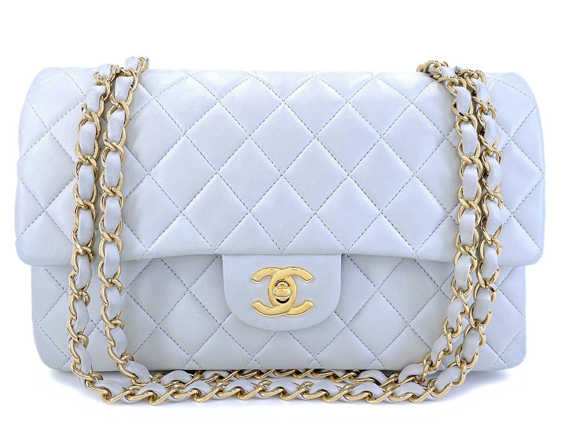 The medium classic flap size, now called the 11.12 model, in the original pale blue from 2002 with 24k gold plated hardware, and thick, buttery-soft lambskin leather. Untouched, never refurbished.