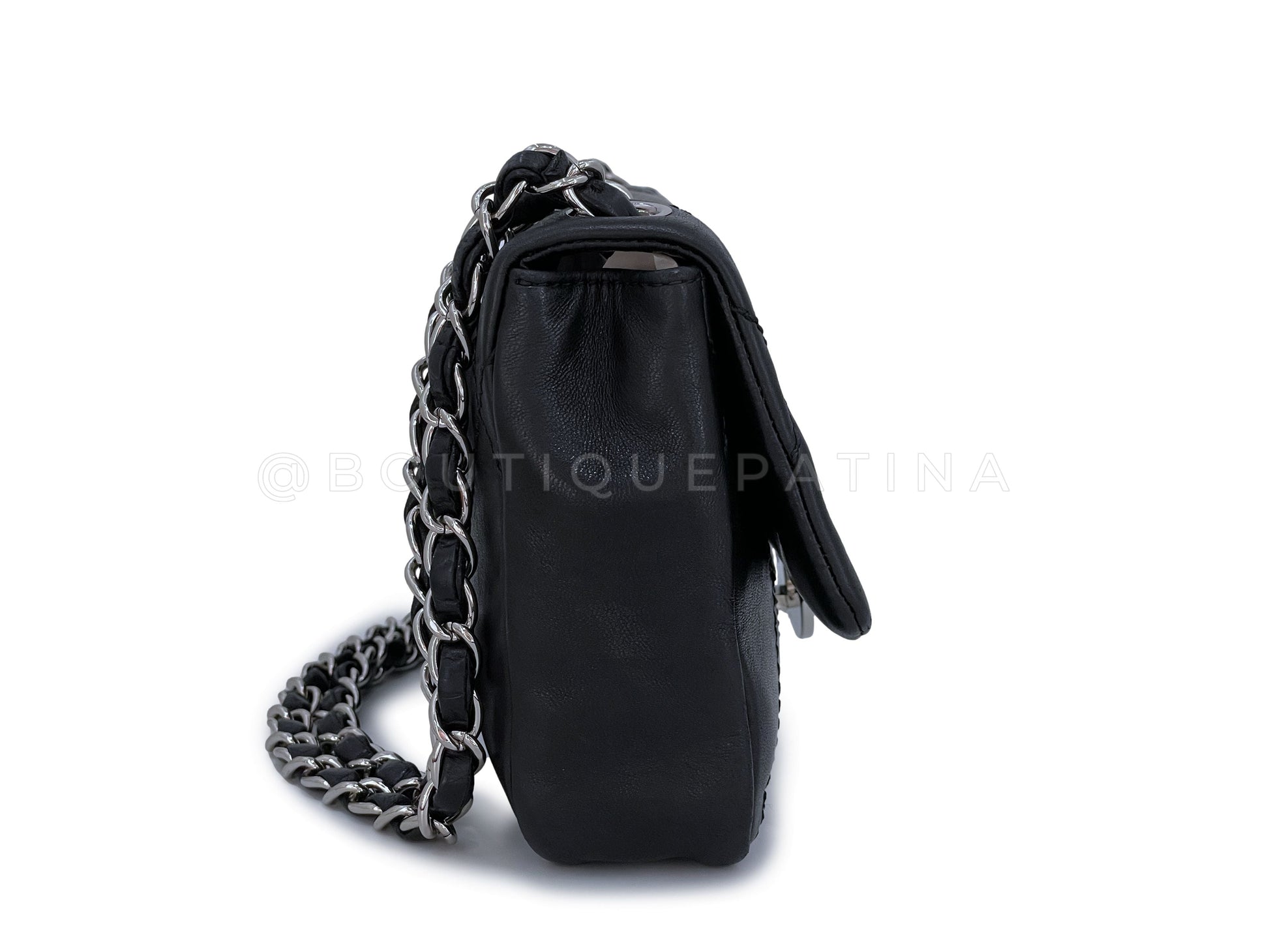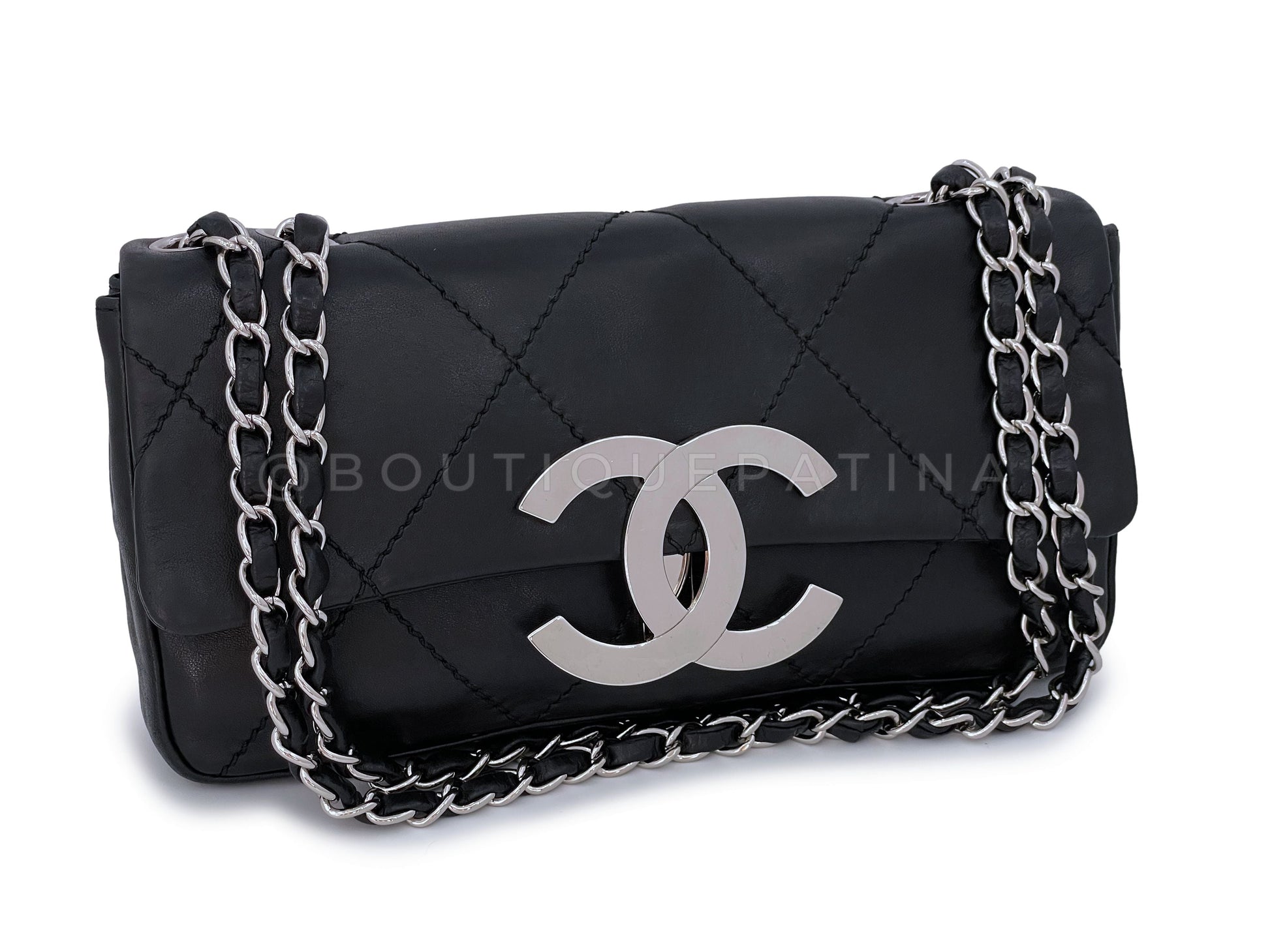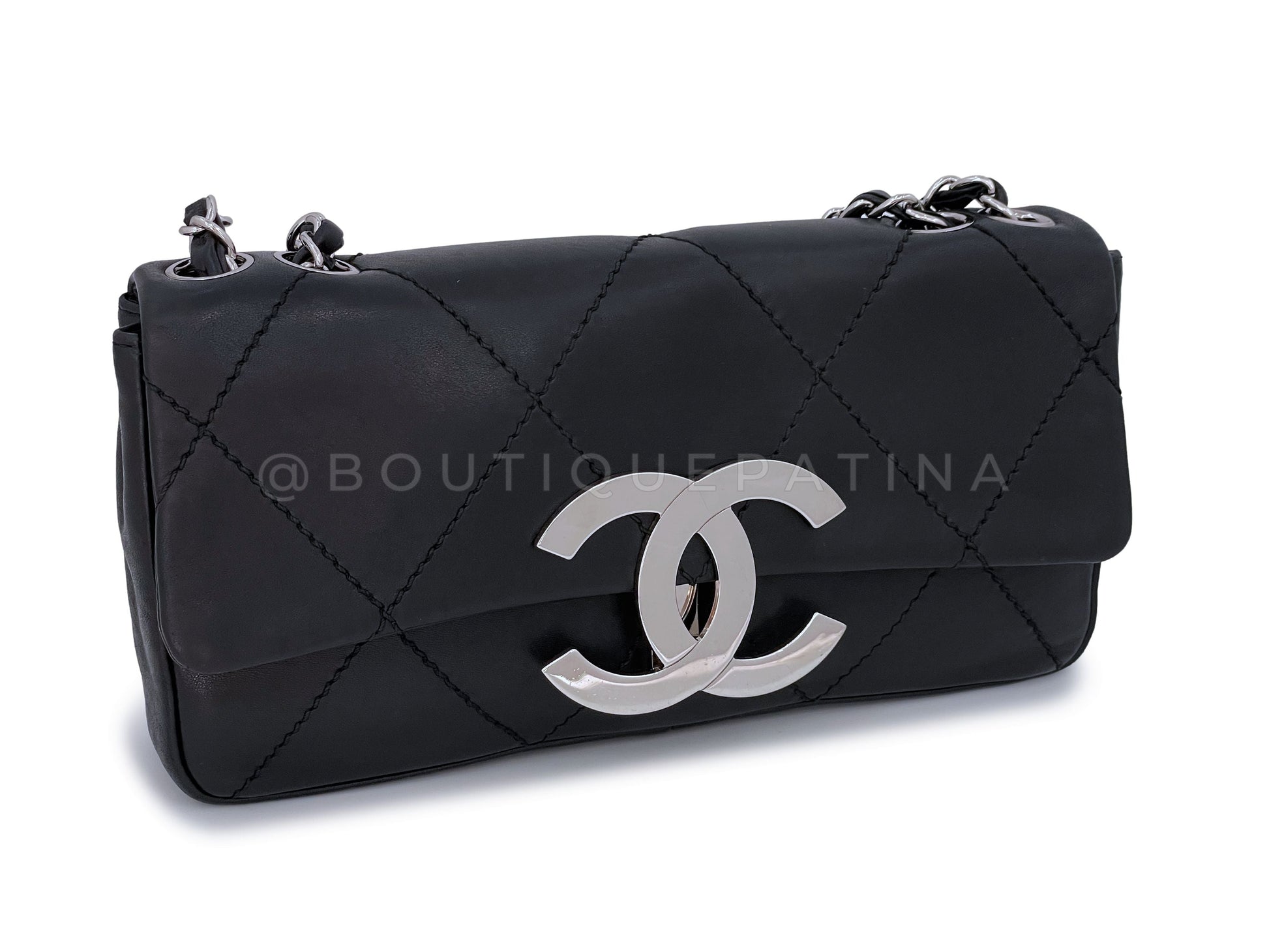 In Black baby calfskin and shiny ruthenium hardware. Boutique Patina specializes in sourcing and curating the best condition preowned vintage Chanel leather treasures by searching closets around the world.