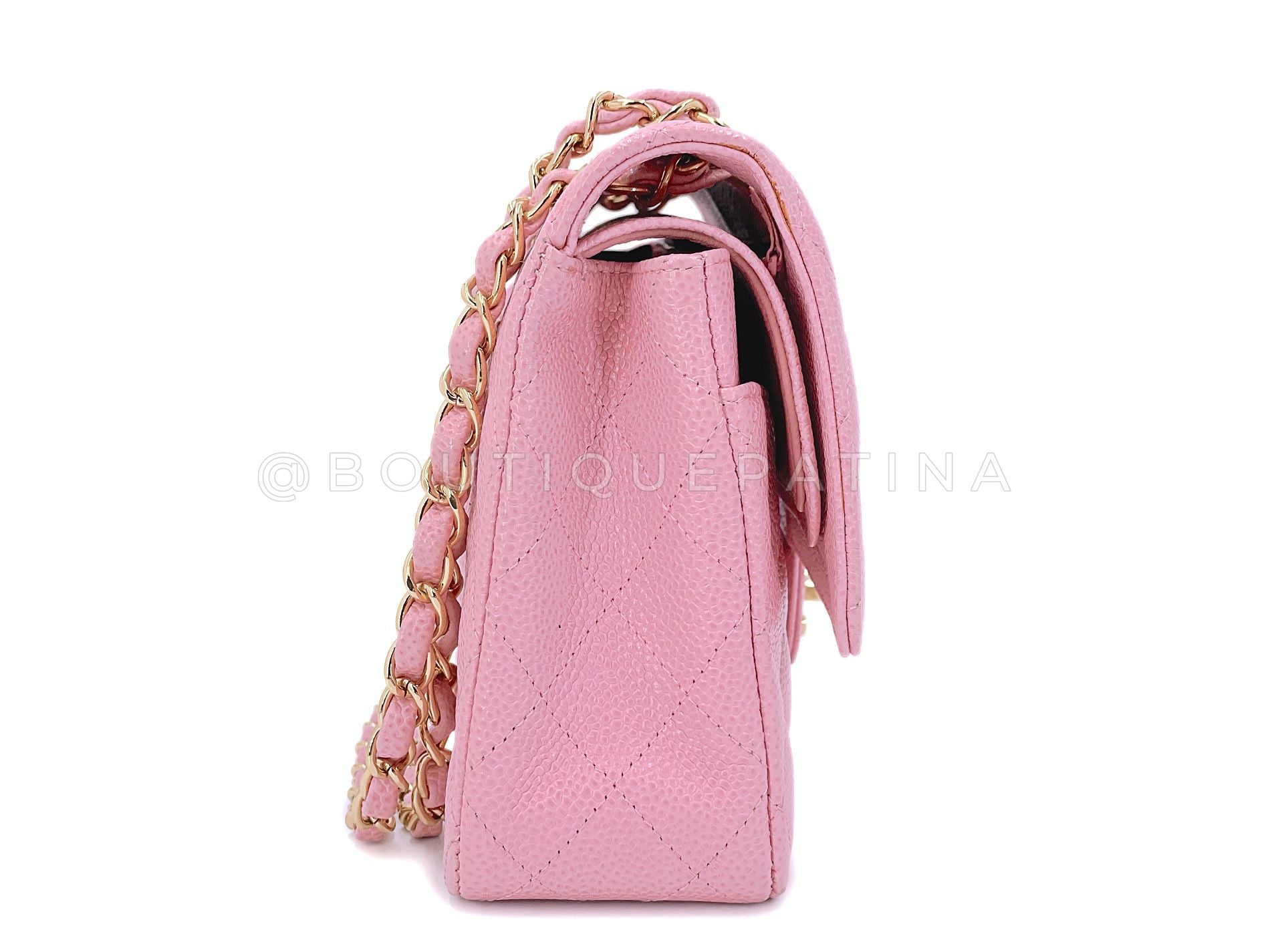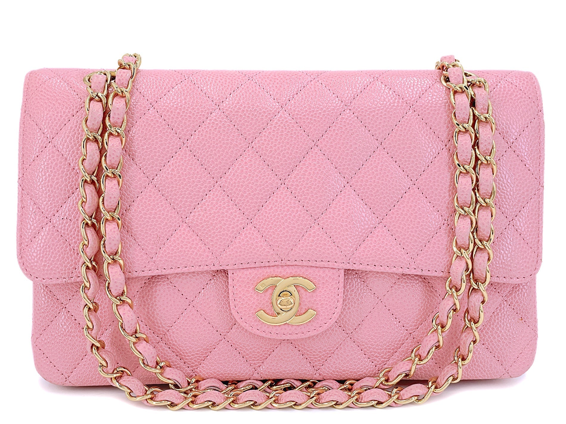 In sakura pink caviar leather and 24k gold plated hardware. In caviar leather, the classic flap is durable with the pebbled grain nodes of calfskin leather. Sakura Pink aka bubble gum pink is a color released in 2004-2005 with deep light pink undertones on a very sturdy durable caviar calfskin, unlike the soft small-noded glossy caviar quilts Chanel now makes today.