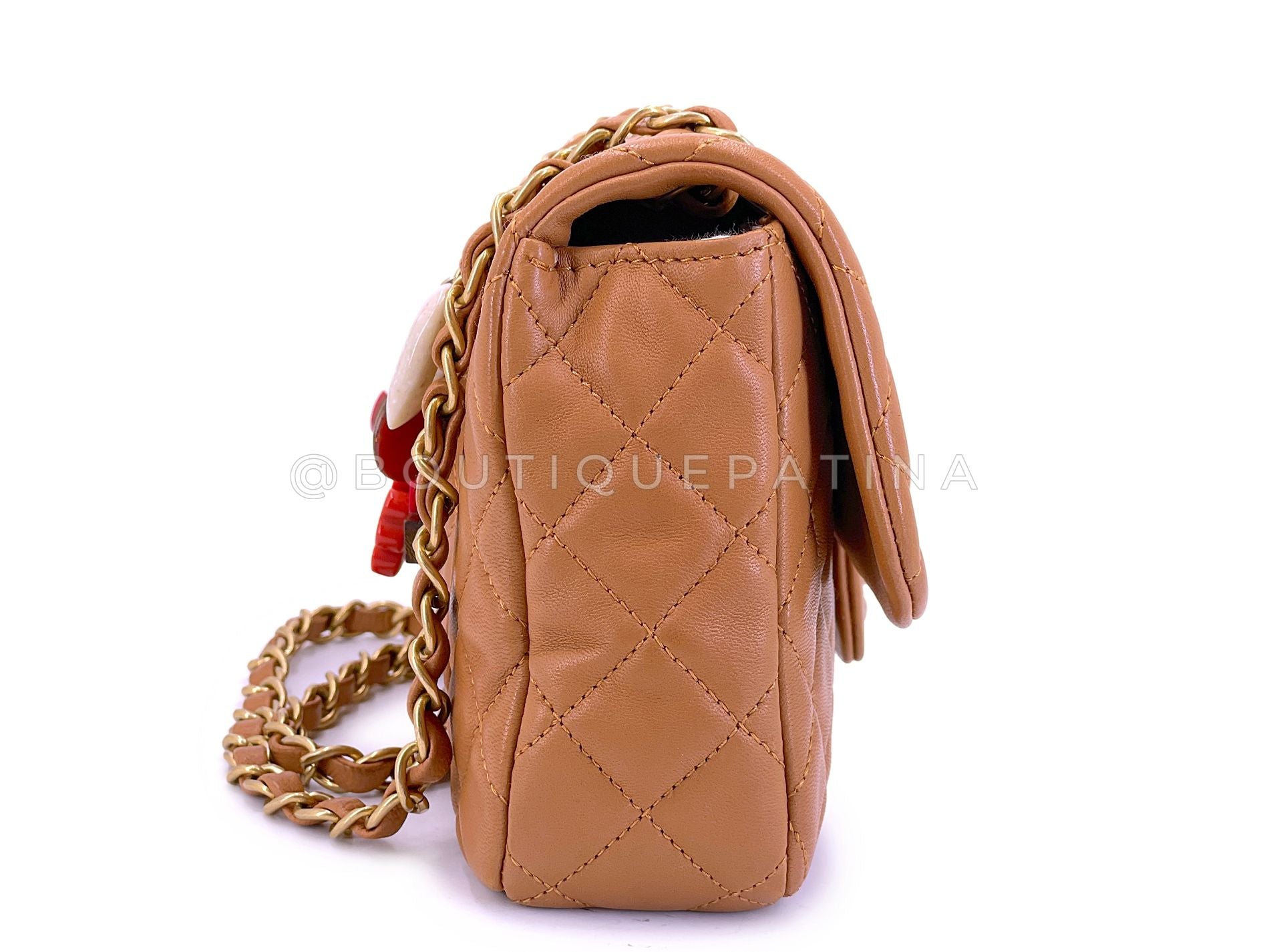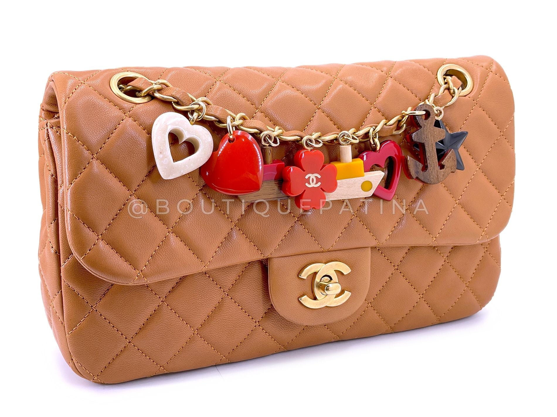 Limited in production, this whimsical flap is a twist on the Chanel Classic. In a beautiful beige lambskin and brushed gold hardware, the bag has a string of lucite and wooden charms that drape along one side of the chain. Double woven chain shoulder straps can be worn single or double strap, long or short on one shoulder.