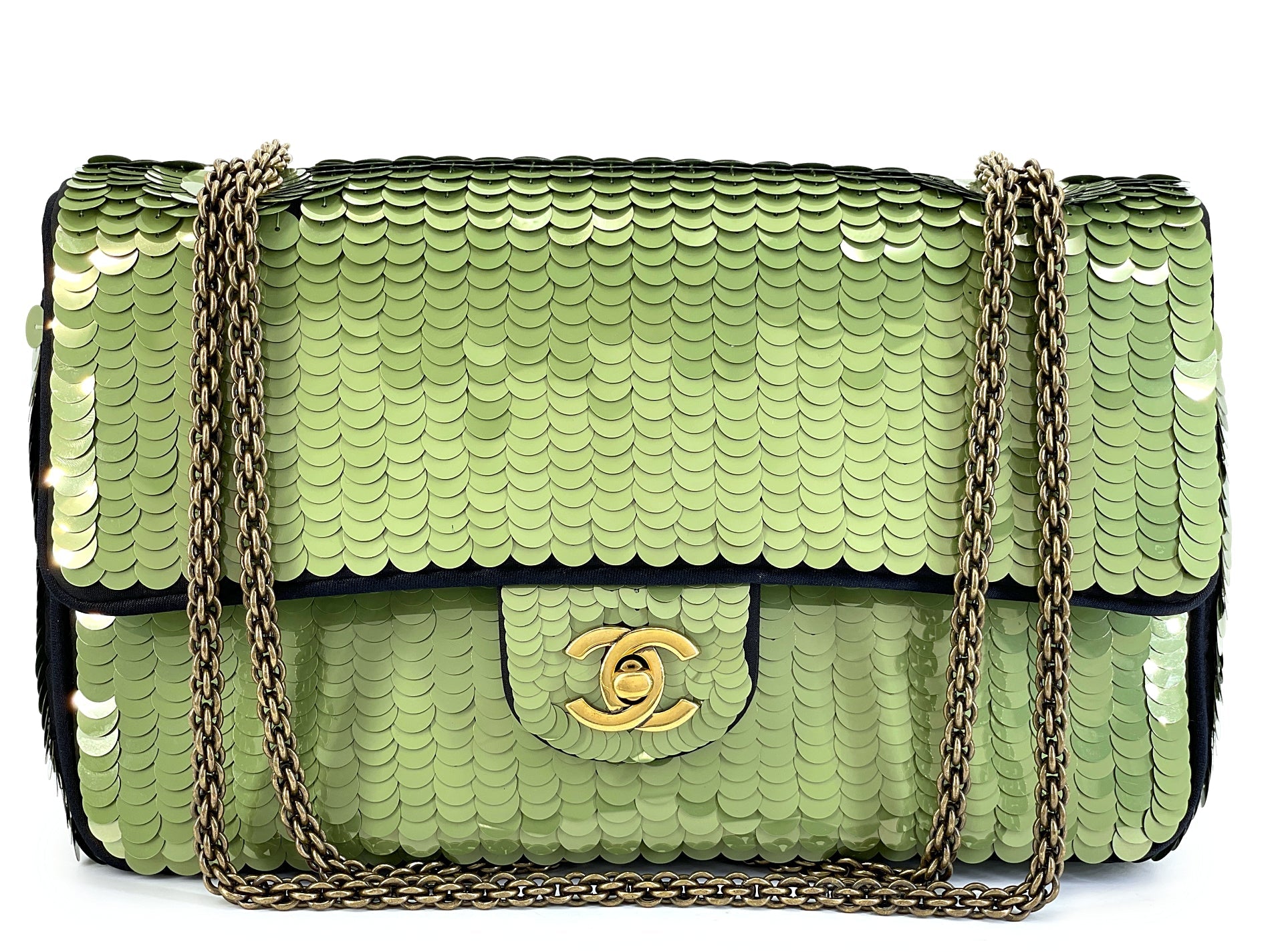 In pale green sequin and aged gold hardware.