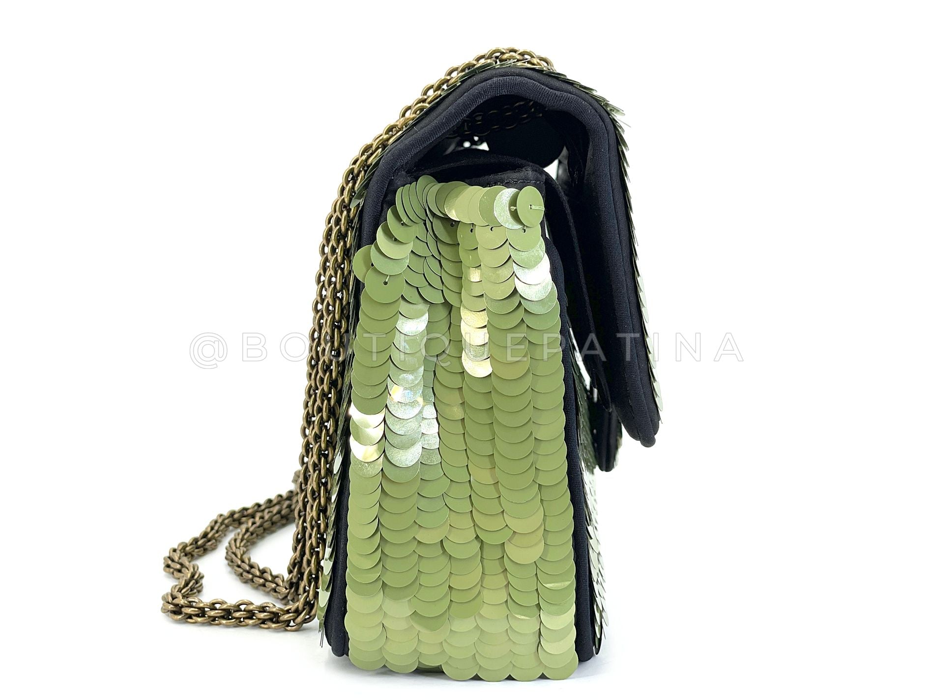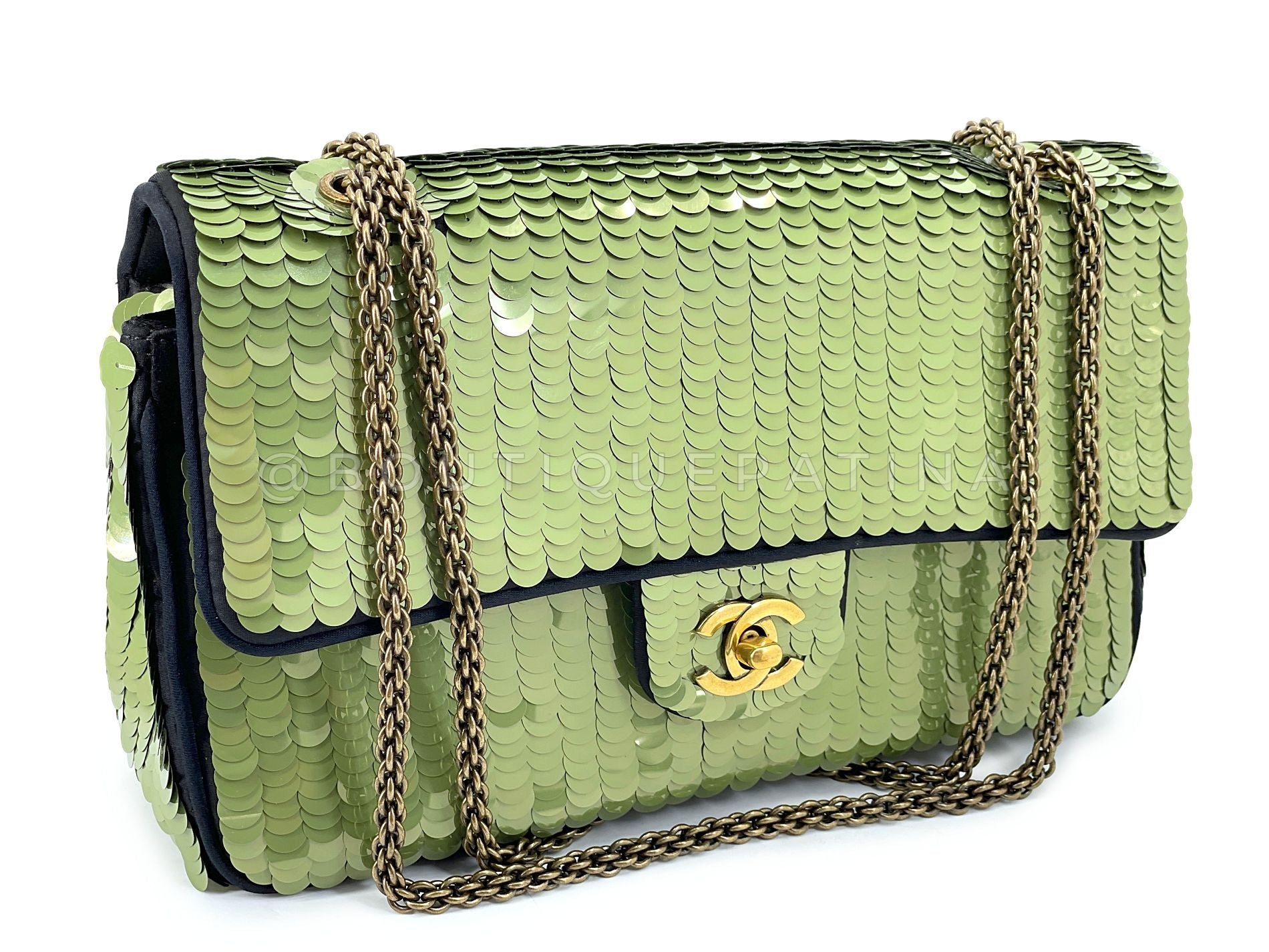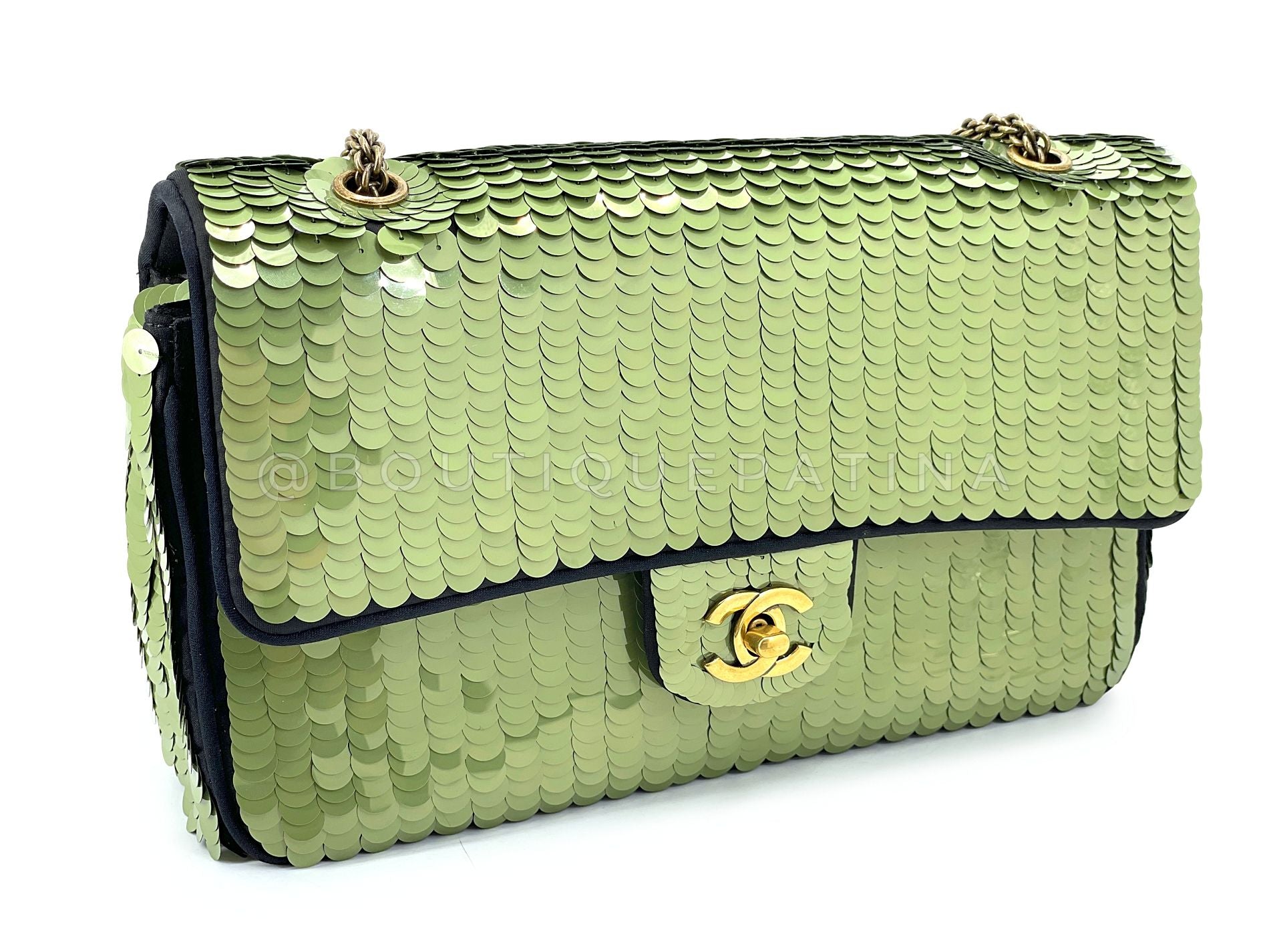 A reissued style from the vintage past but still unique to Karl Lagerfeld's 2010 Paris-Shanghai collection is the Chanel 2010 Green Sequin Satin Paris-Shanghai Medium Flap Bag GHW.