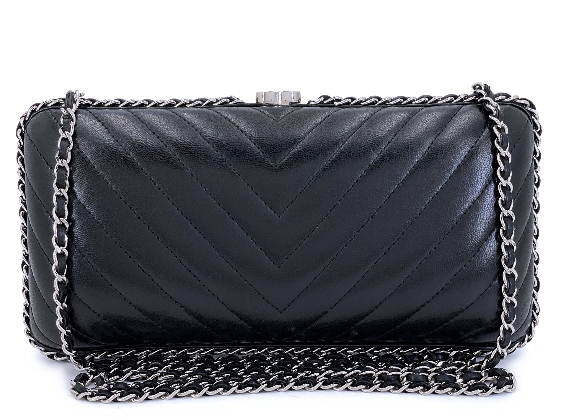 Chanel 2015 Black Chevron Hard Clutch on Chain Minaudière Evening Bag SHW - a hard clutch covered with the softest chevron quilted lambskin and have a double woven chain frame. The long crossbody strap can be hidden discreetly as an evening clutch, lined in black lambskin with the metal plaque label designated by Chanel for special material pieces.