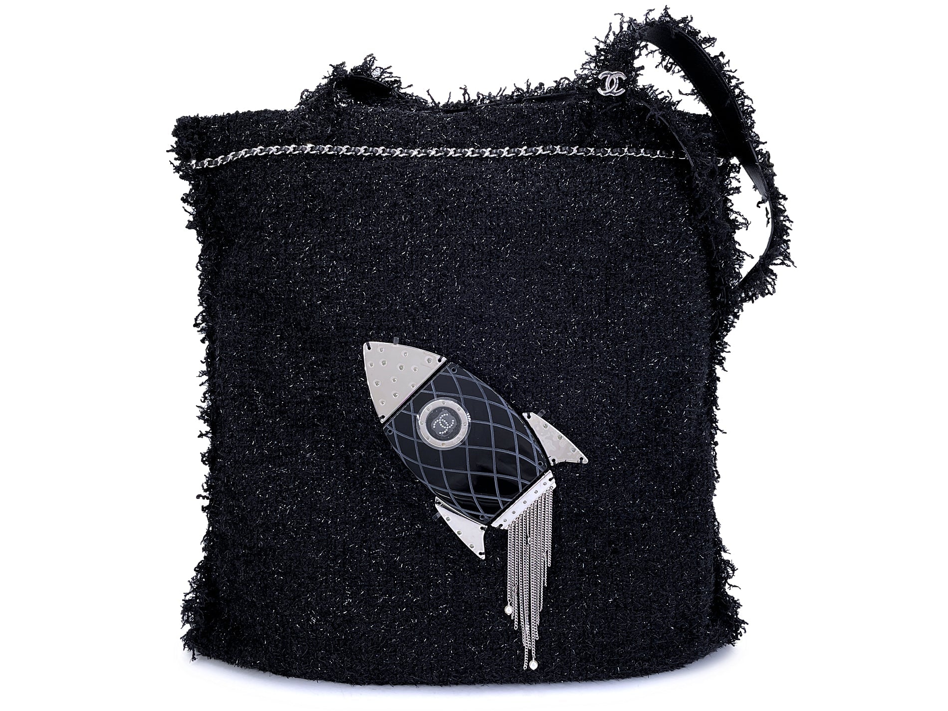 We still have stickers on the hardware, on this Chanel 2017 Rocket Tote Bag Black Tweed Boucle RHW. A whimsical simple tote from Karl's 2017 fall-winter rocket-themed collection.