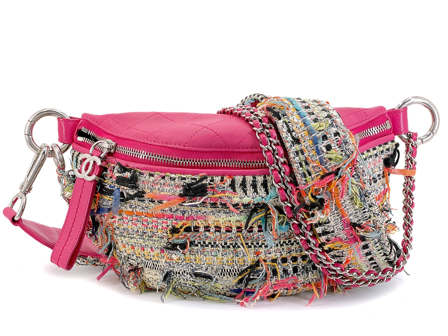 A whimsical and convertible bag is this Chanel 2017 Tweed Convertible Fanny Pack Waist Bag Pink Multicolor SHW.