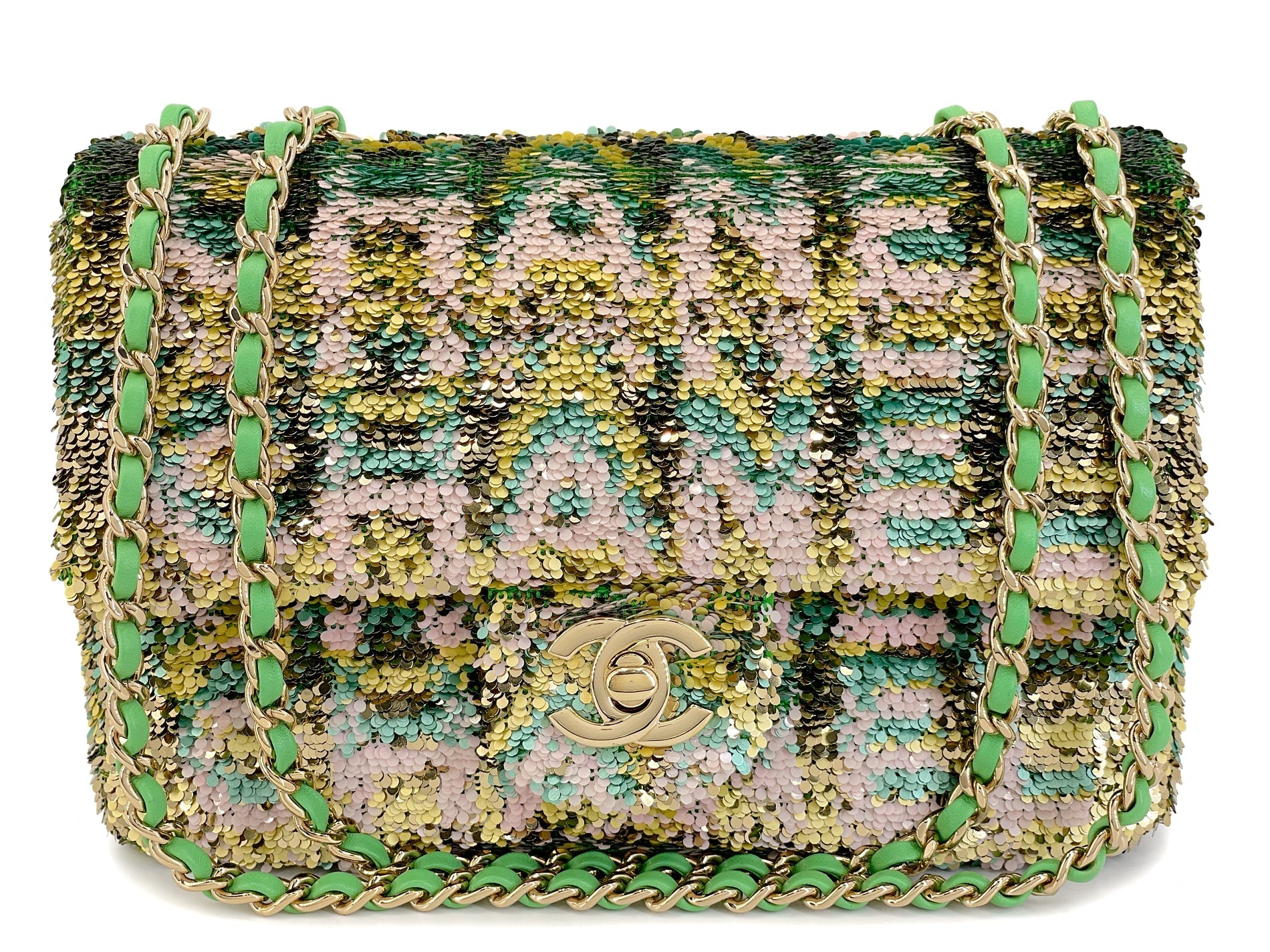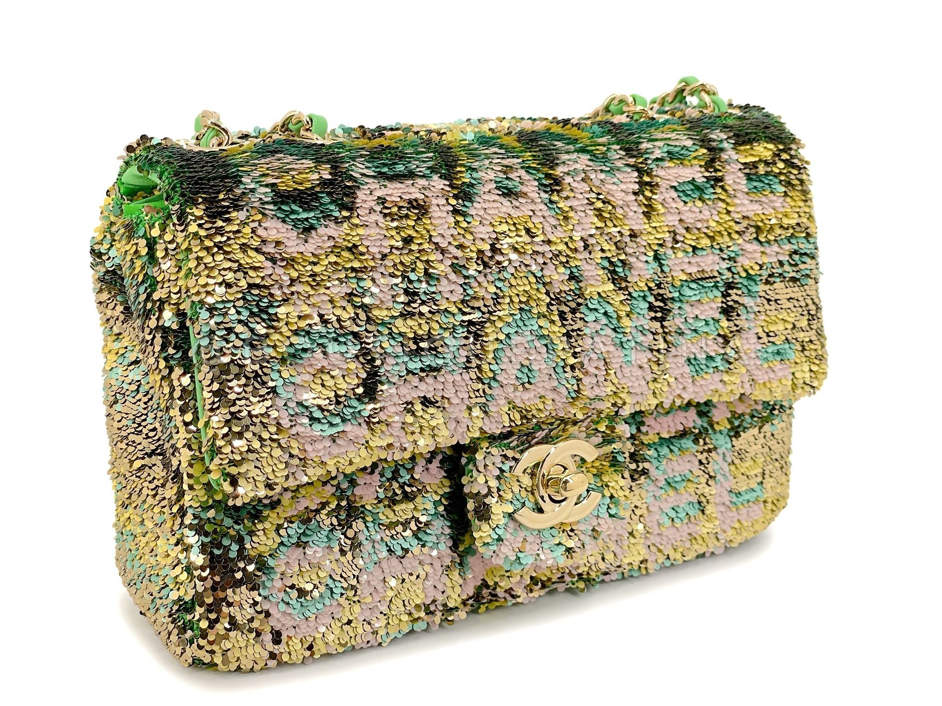 Chanel 2021 Iconic Green Pastel Letter Sequin Green Rectangular Mini Flap Bag GHW 2EE