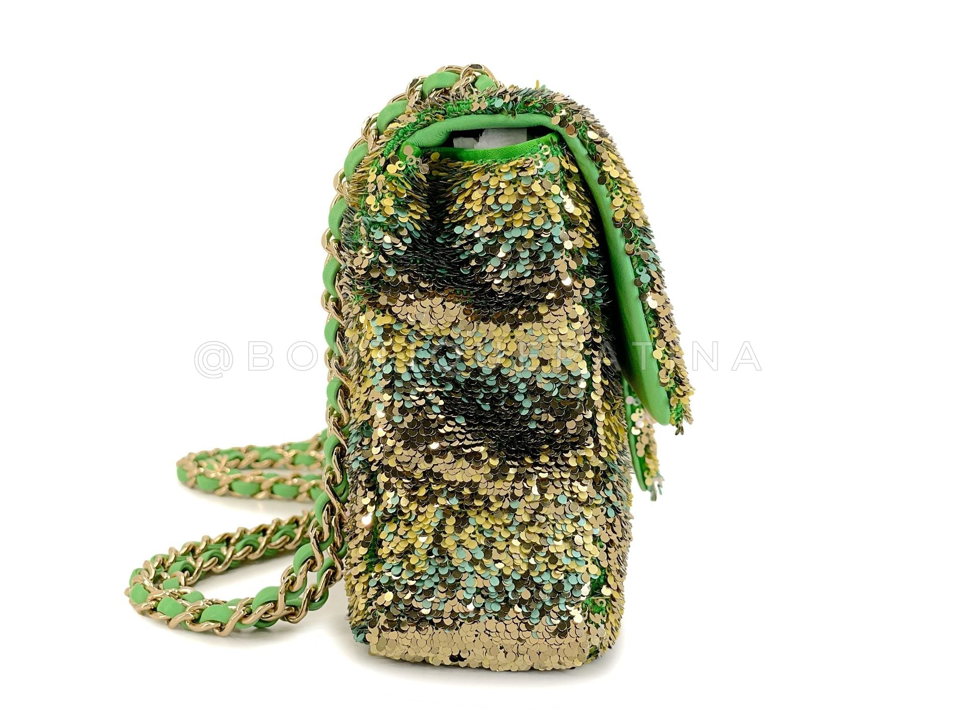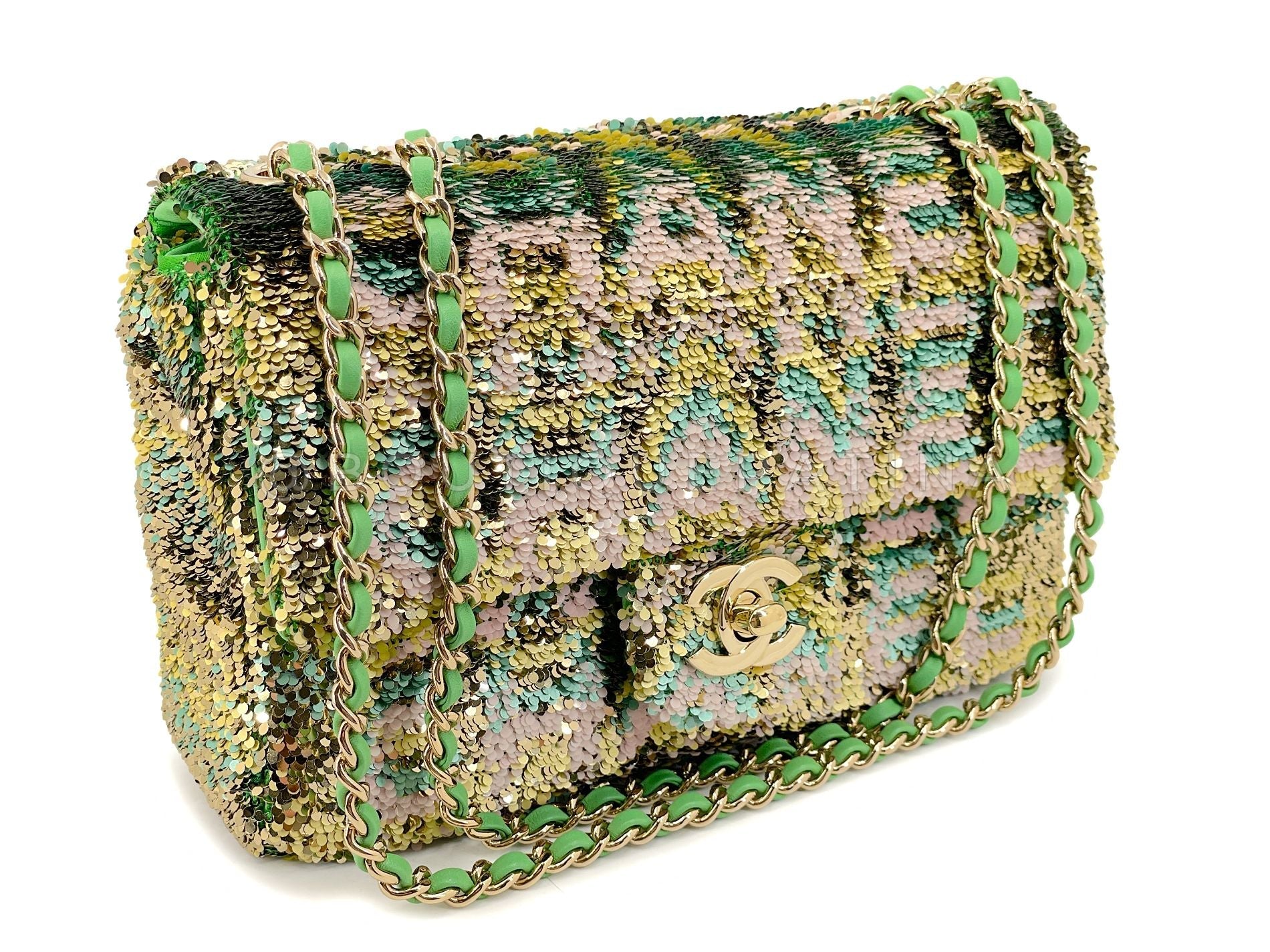 Listed as one of Chanel's "most iconic bags of 2021" by Pursebop is this Chanel 2021 Iconic Green Letter Sequin Green Rectangular Mini Flap Bag GHW.