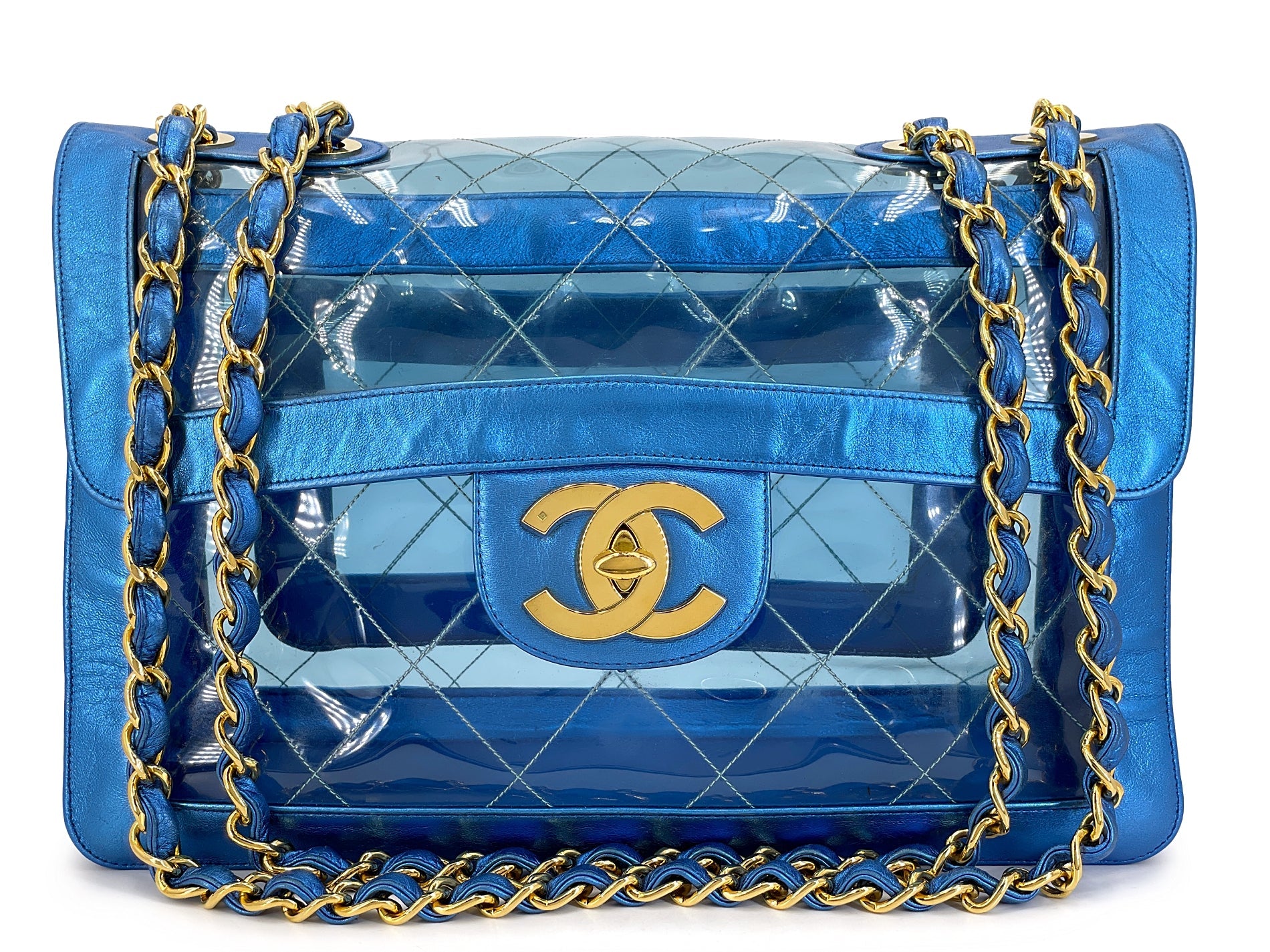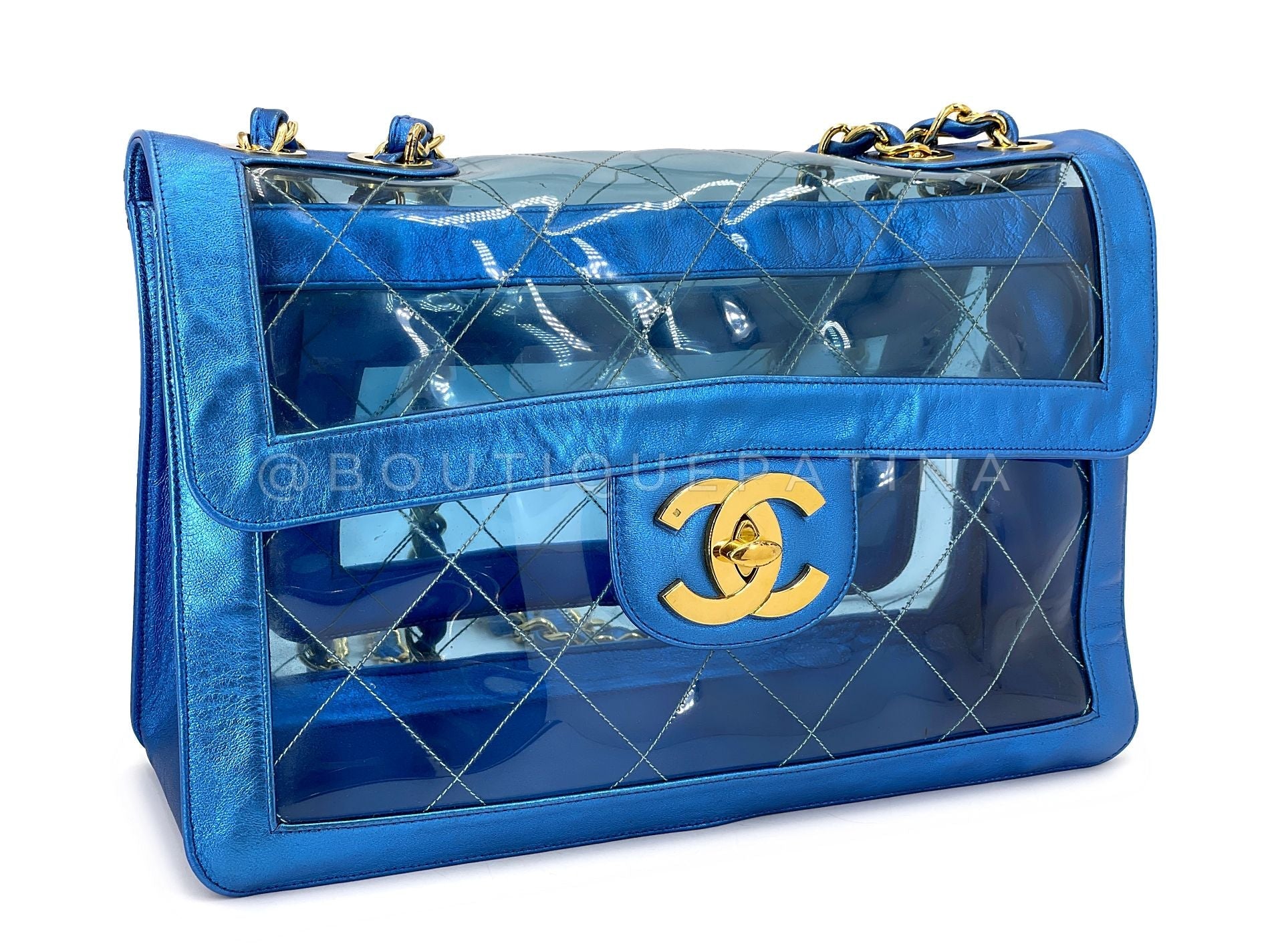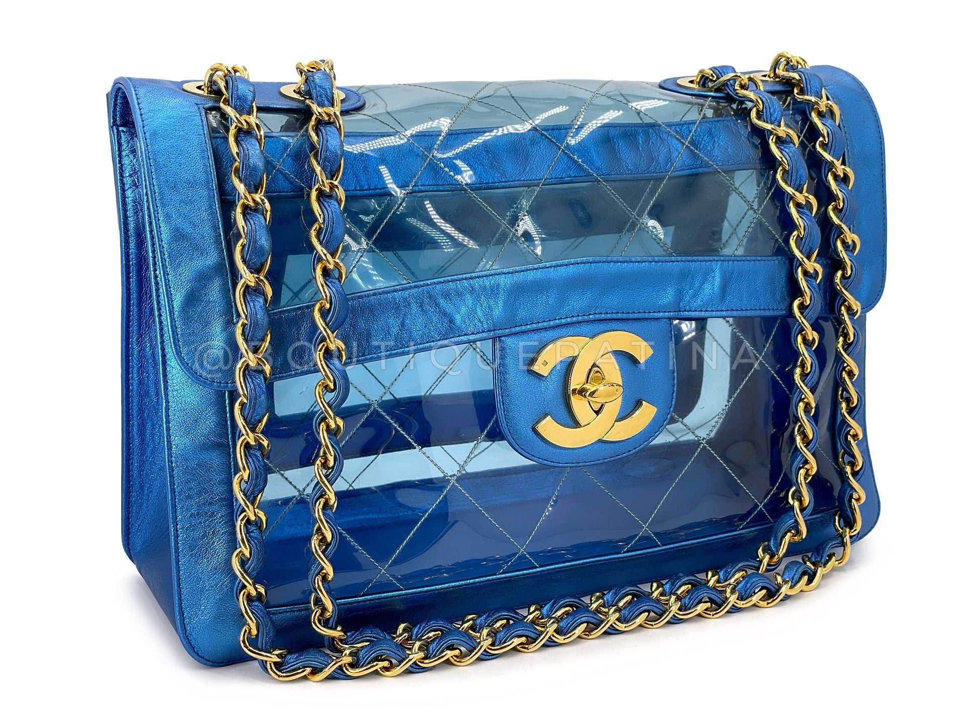 Exclusively from Karl Lagerfeld's 1995 Spring Barbie collection and runway, this vintage Chanel maxi classic flap with oversized CC in metallic blue lambskin leather and PVC is a part of fashion history.