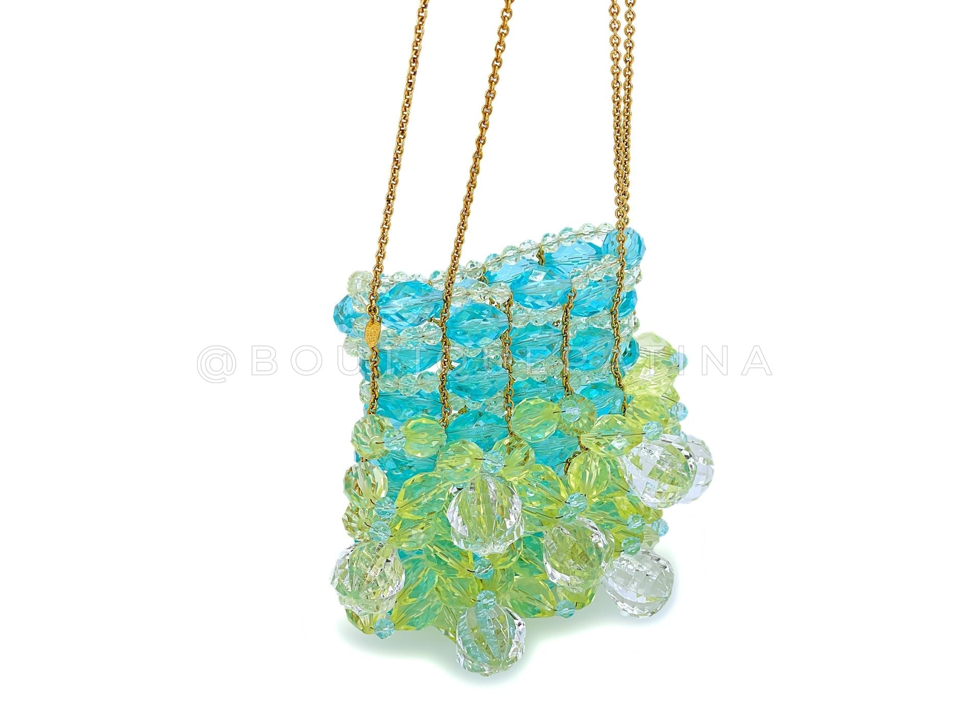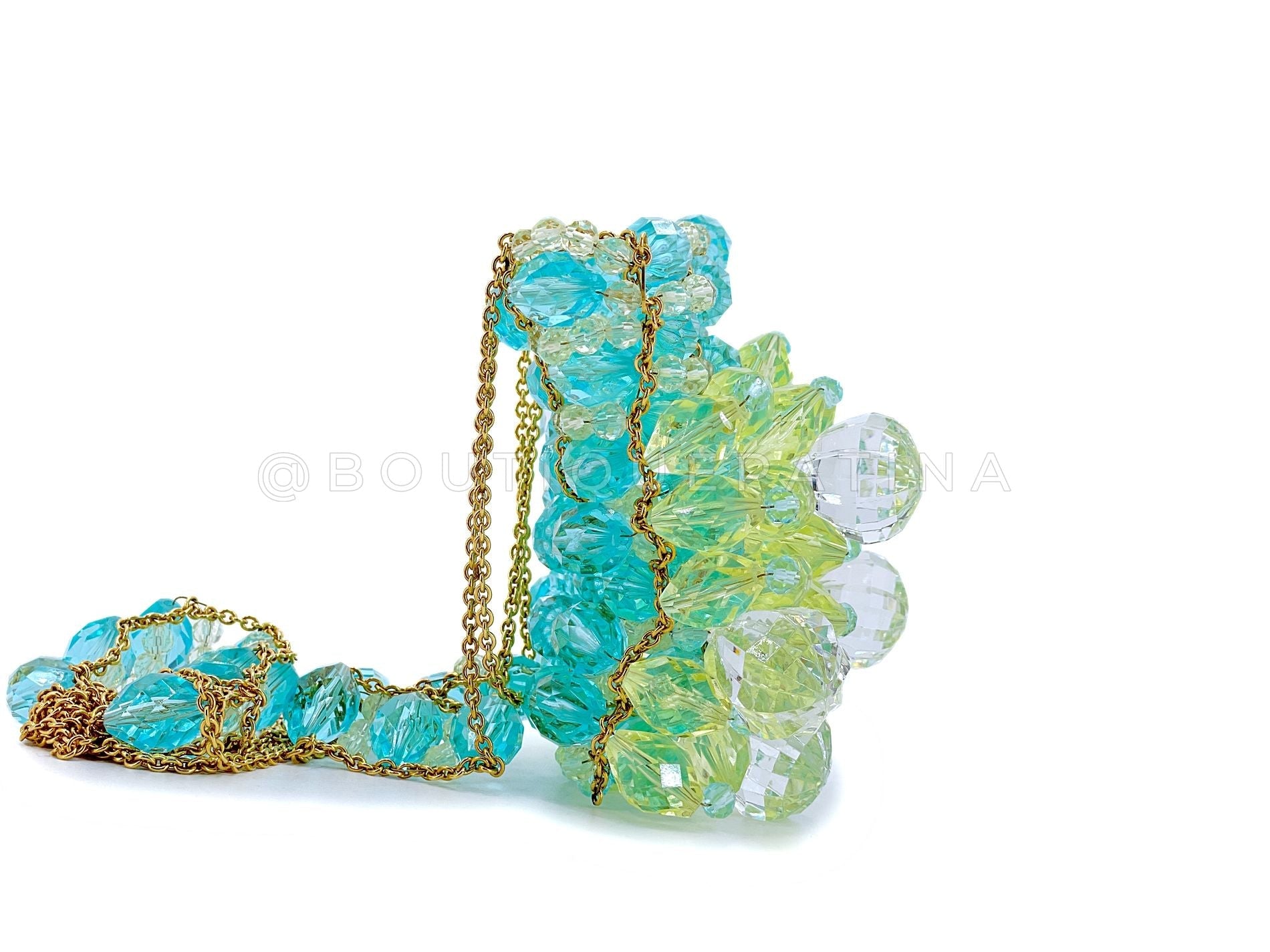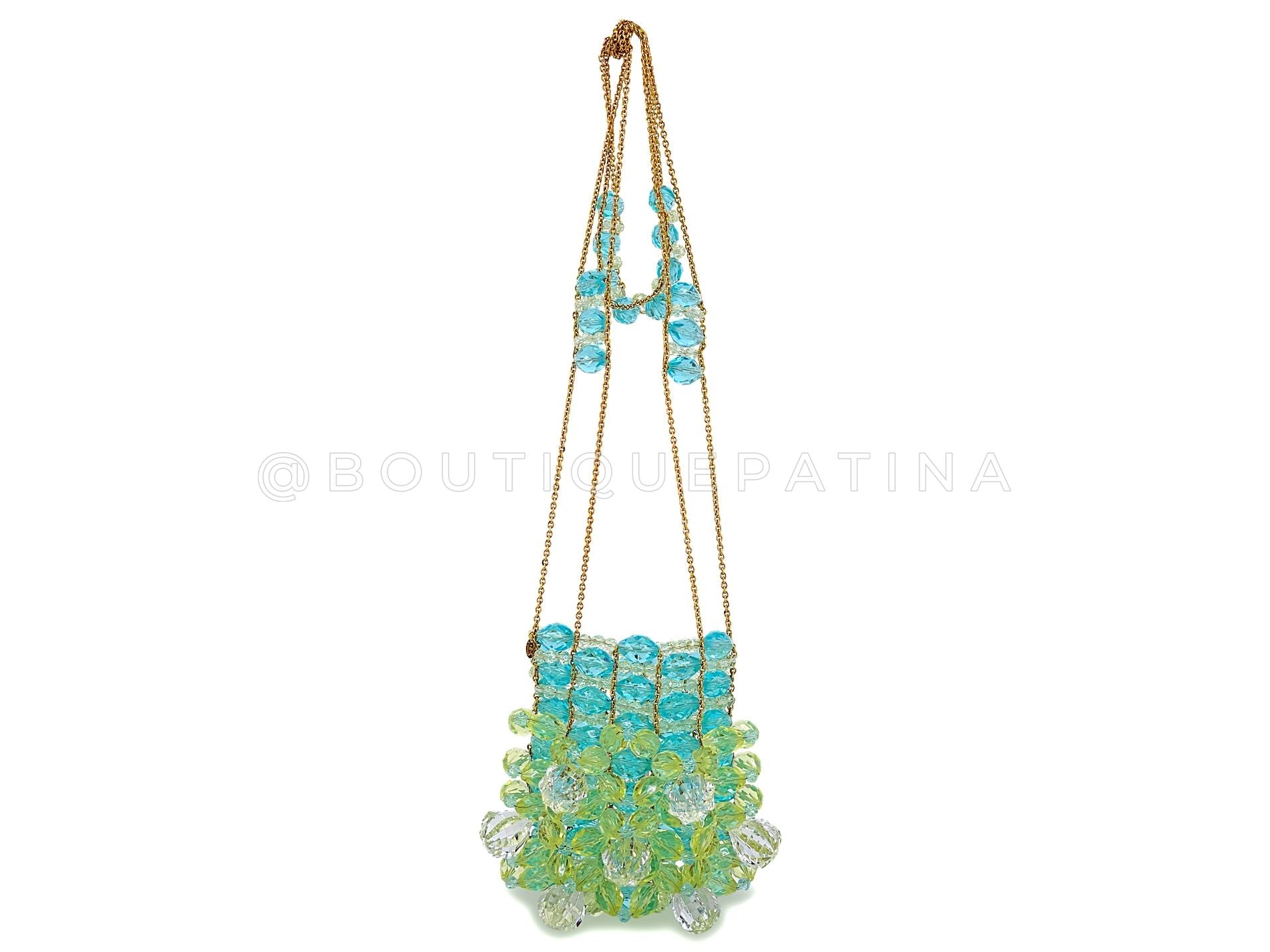 This Chanel 97P Vintage Lucite Crystal Beaded Evening Bag 24k GHW is a rare find. Made solely of faceted lucite beads in white, green and turquoise pastel hues joined by a 24k gold plated micro-chain, this evening bag was a super limited release shown in Chanel's 1997 Spring runway show.