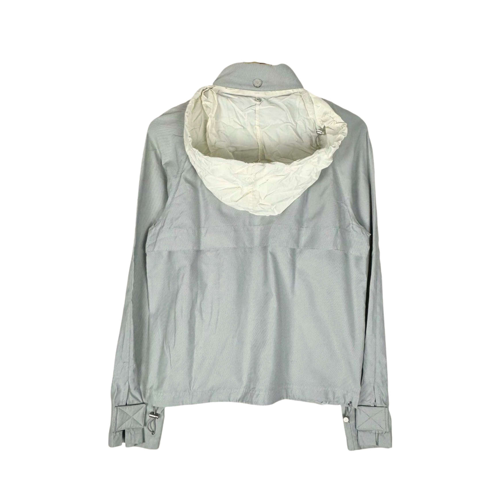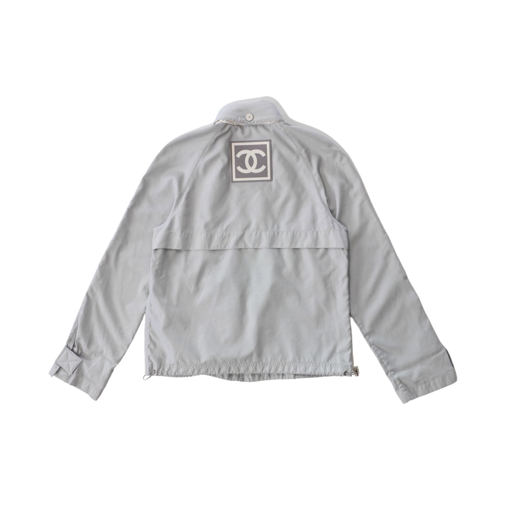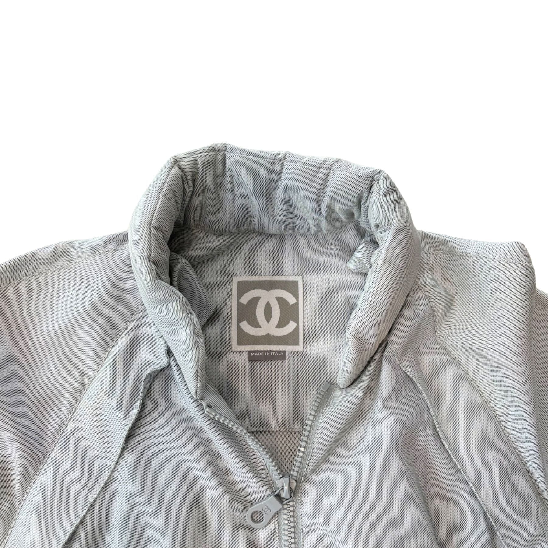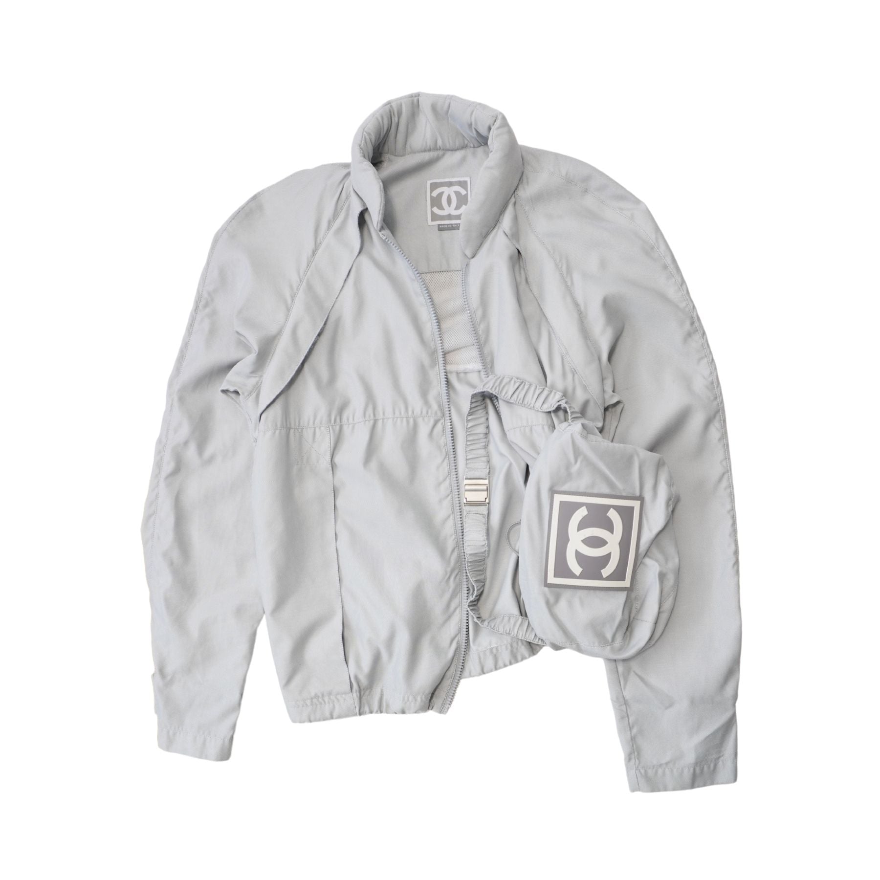 Chanel 'A/W 2001 Identification Convertible Sport' jacket in grey nylon with a front-zip opening in grey hardware, side zip pockets, and a packable hood. Features a drawstring waist and a large rubberized 'CC' logo on the back neckline. The jacket itself is packable and converts into a small side bag.