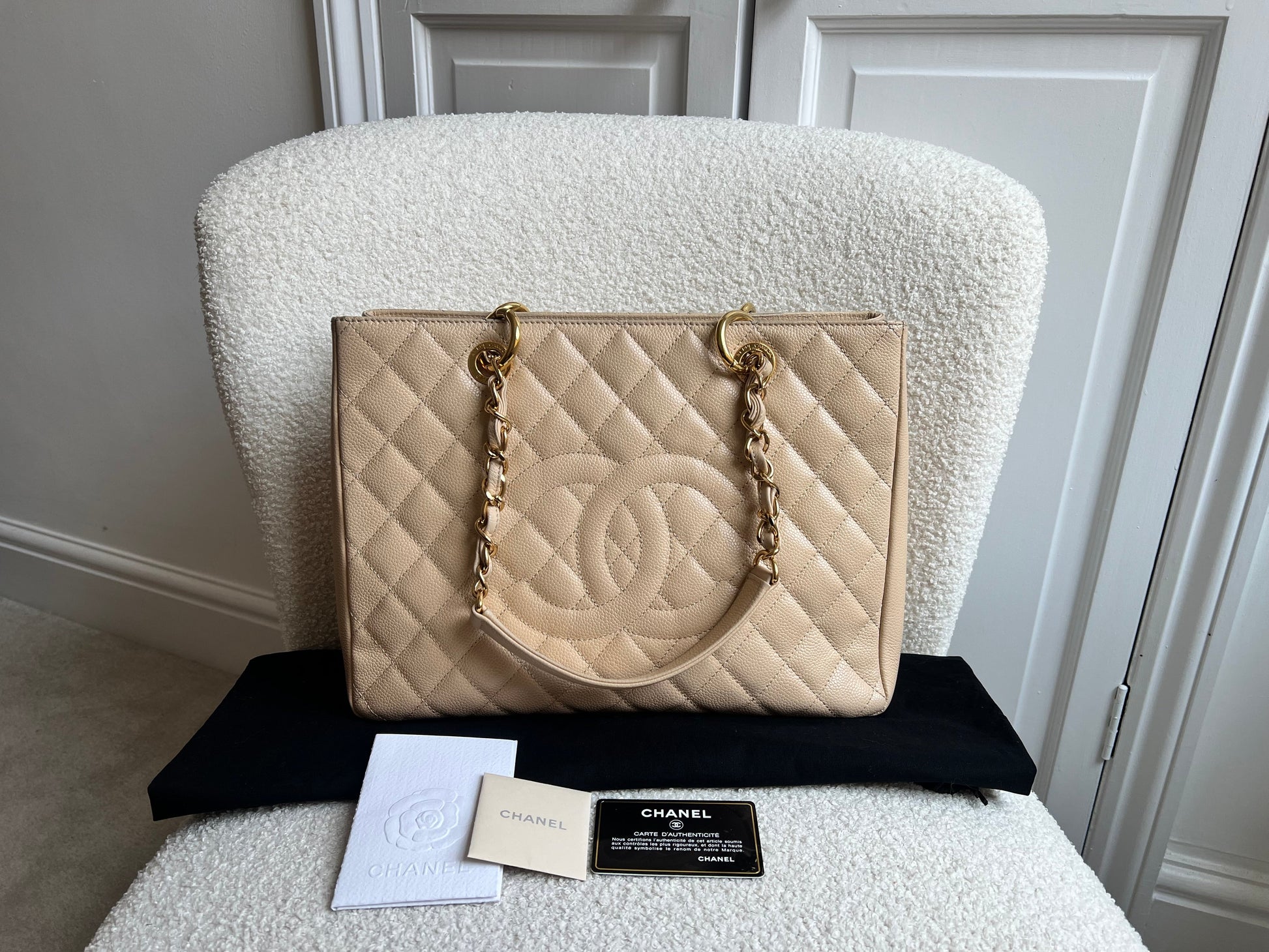 Chanel Grand Shopper Tote (GST) in Light Beige Caviar Leather with gold hardware. This very popular chain tote is sadly now discontinued and only available to buy preloved. Great opportunity to own a practical, iconic and sophisticated Chanel bag without the same price tag as the classic flap styles. Perfect for day or evening use and the caviar leather is very resilient and durable. Can be carried in the crook of the arm or over shoulder using the chain straps.