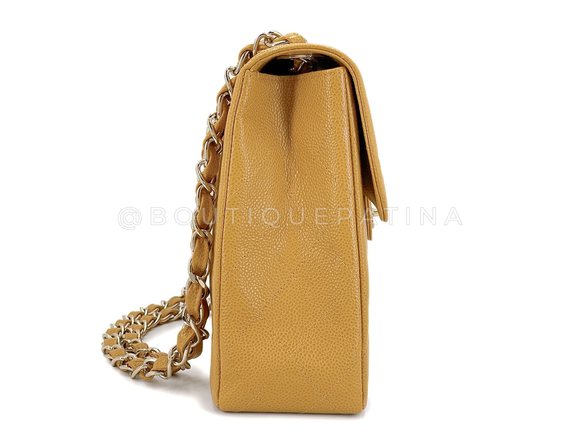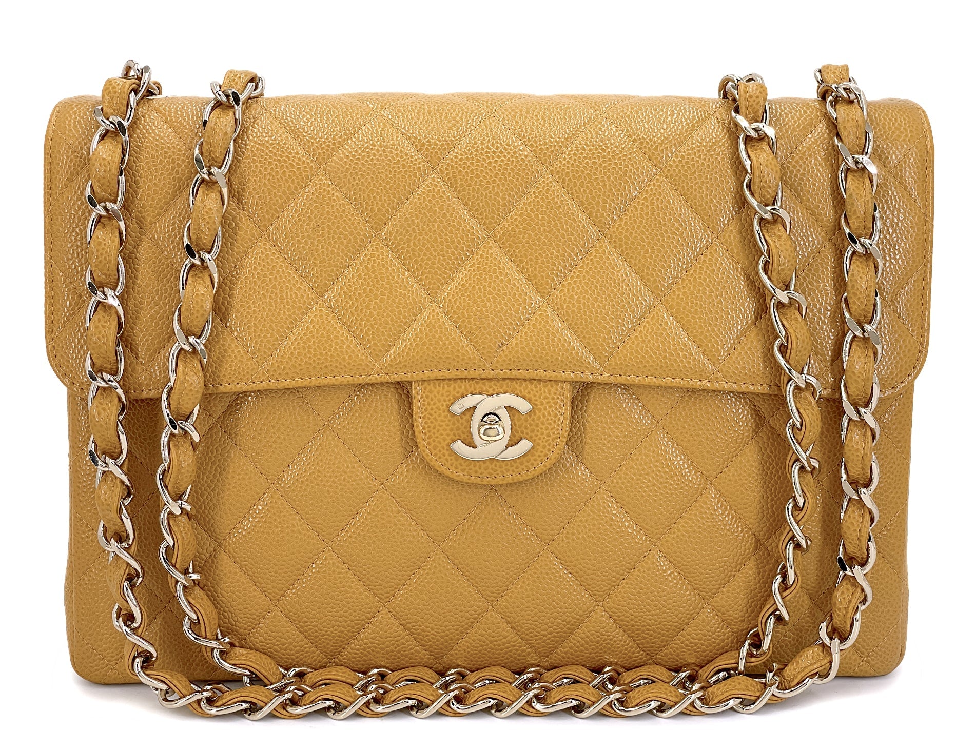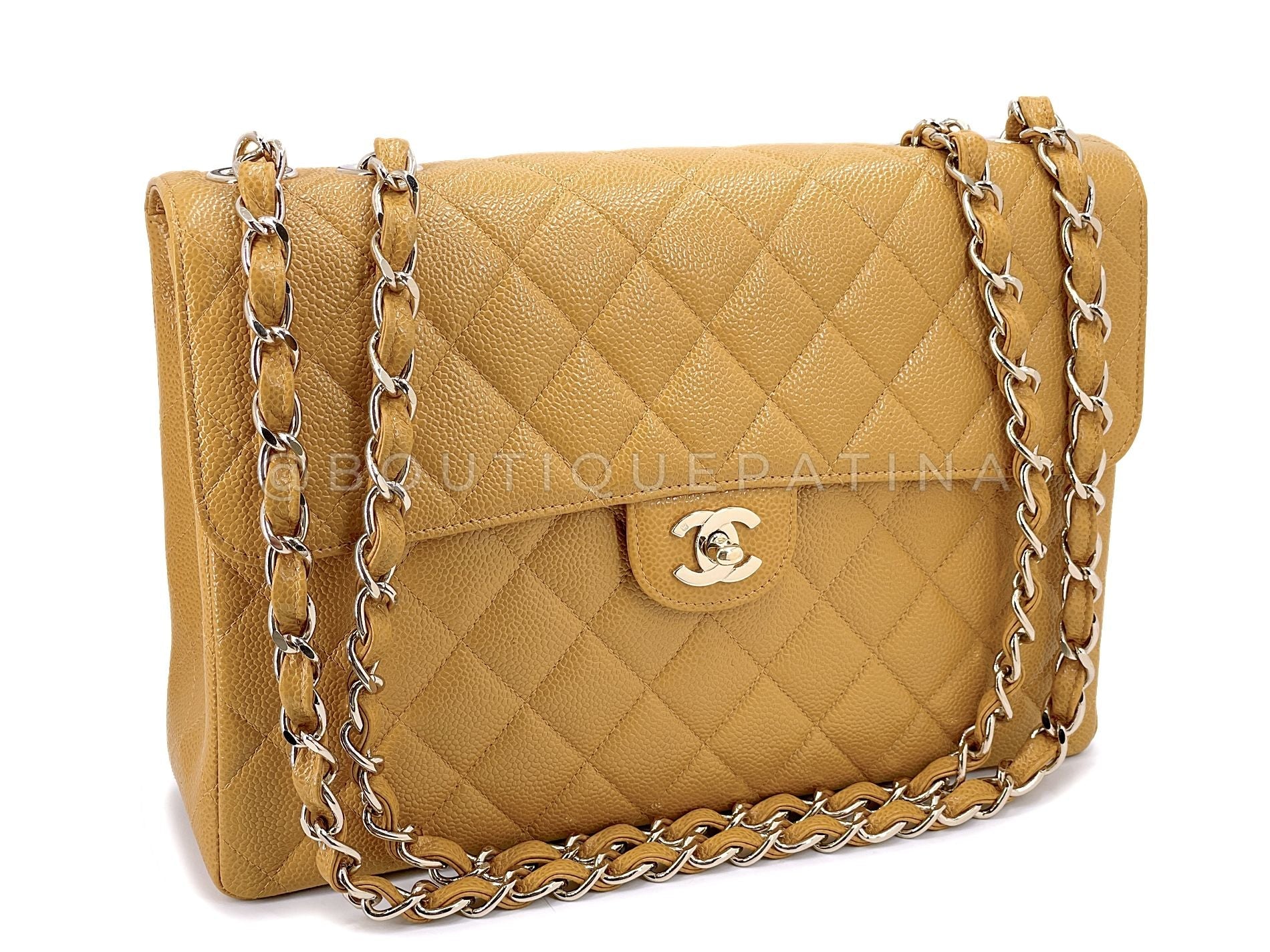 "Built like a tank" is what they call this model of the Chanel 2002 Vintage Beige Caviar Jumbo Classic Flap Bag 24k GHW . Often considered the best of both worlds, with the screw-on top grommets, very thick double woven chain strap and 24k gold plated hardware, rigid structure.