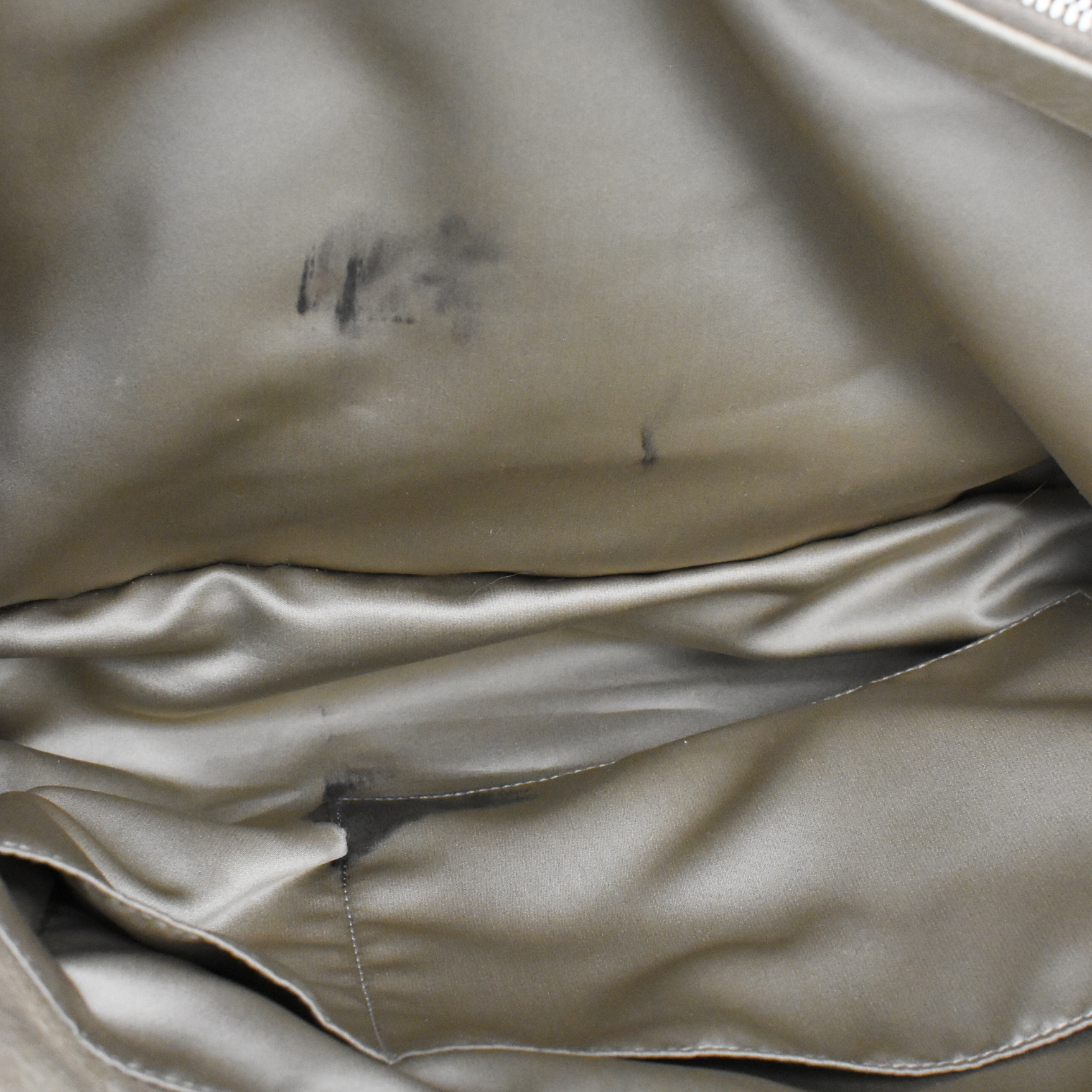- Condition = 8/10, Very good. Some staining in lining, wear to handles, light scuffing to edges, tiny pen mark on front bottom.