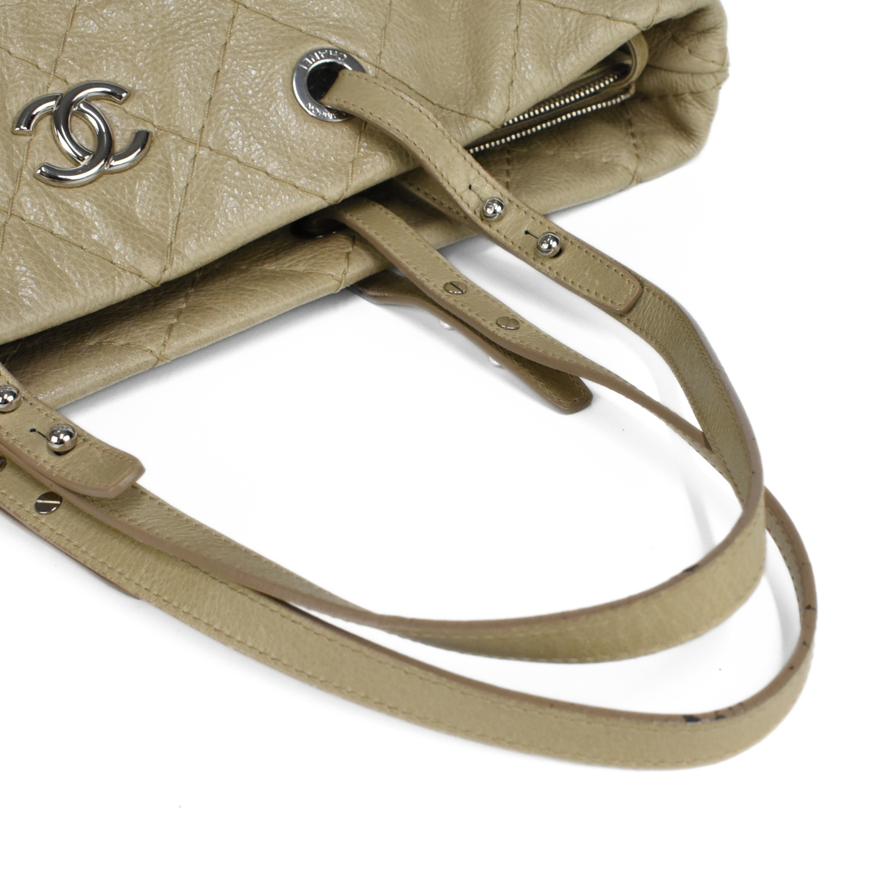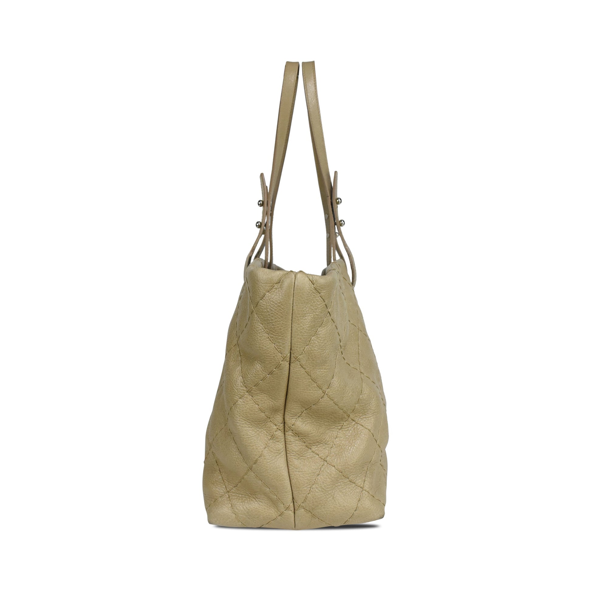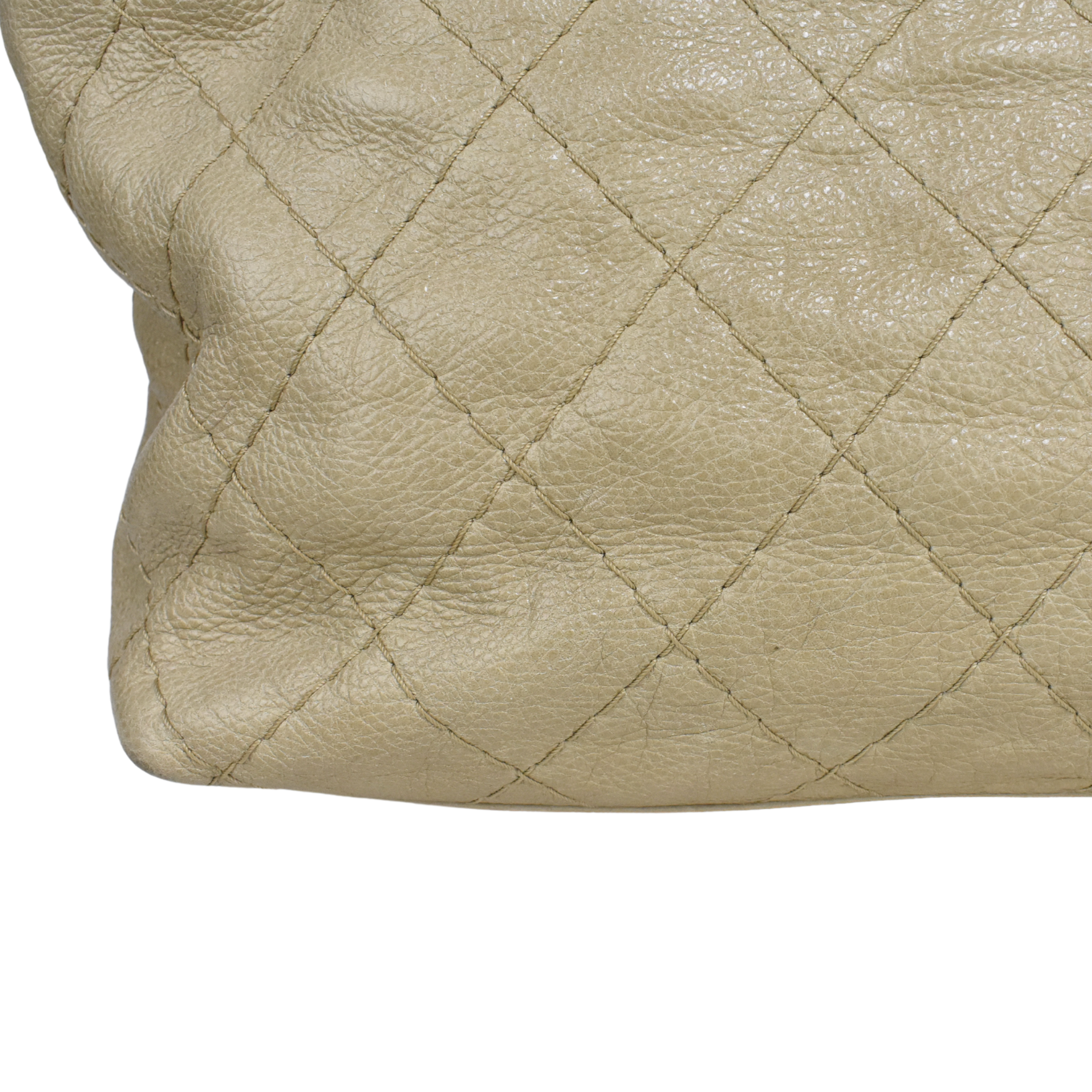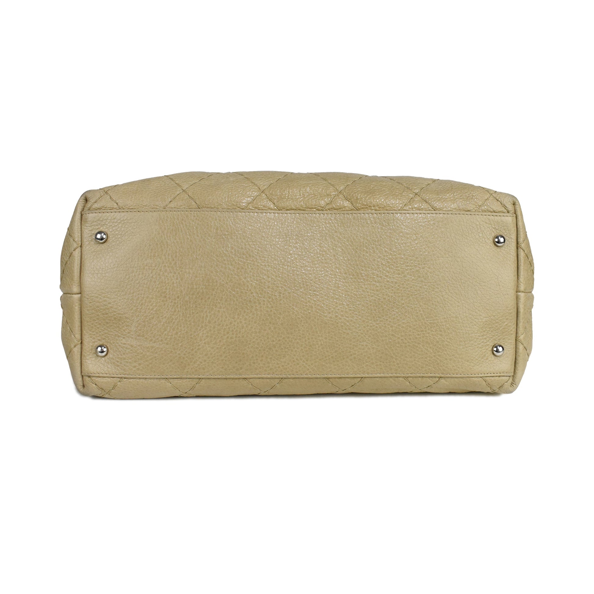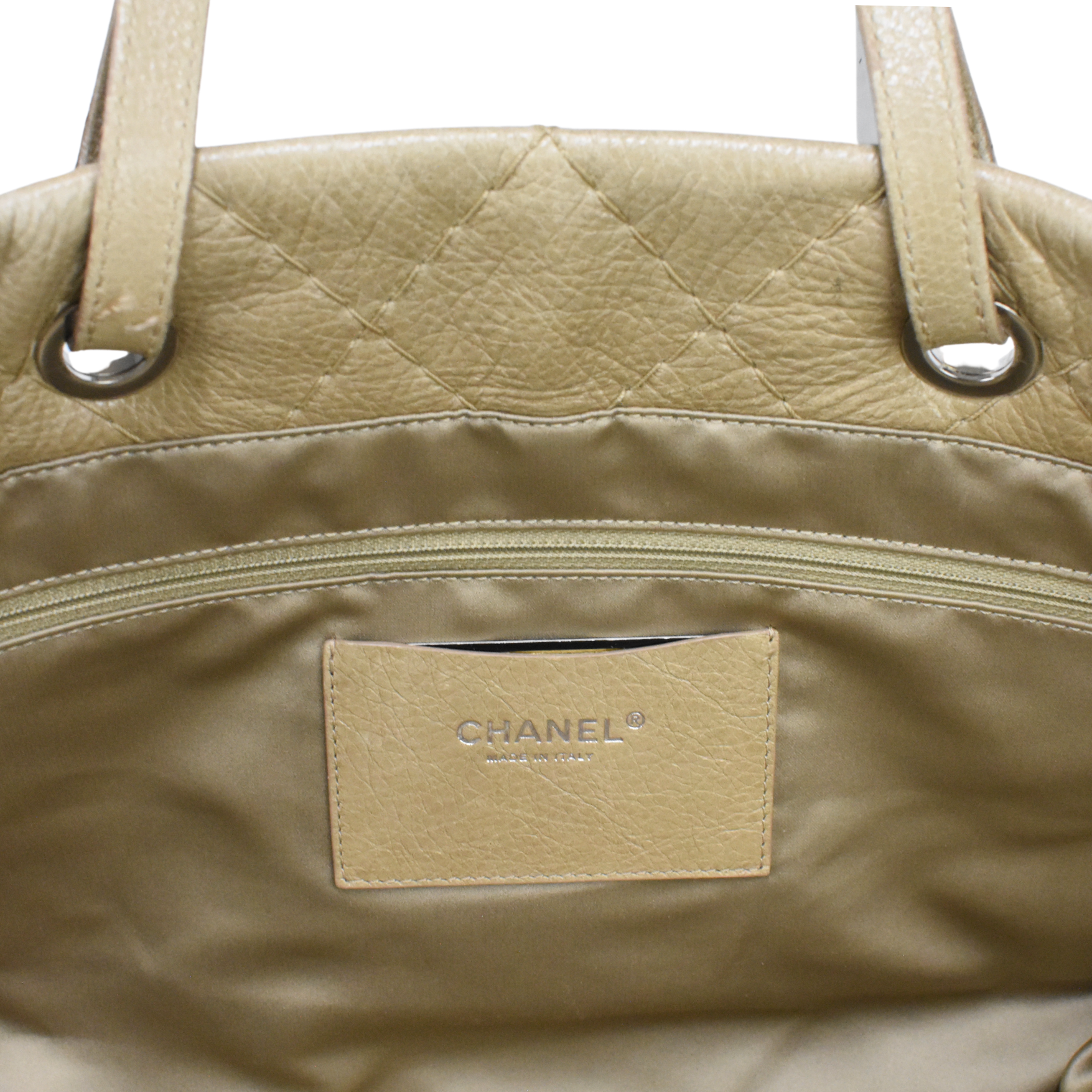 Chanel 'On The Road' tote bag in beige caviar leather with wild diamond stitching and a signature interlocking CC logo in silver hardware. Features dual shoulder straps, two main compartments, beige satin lining, an inner large zip pocket and a smaller zip and open pockets.